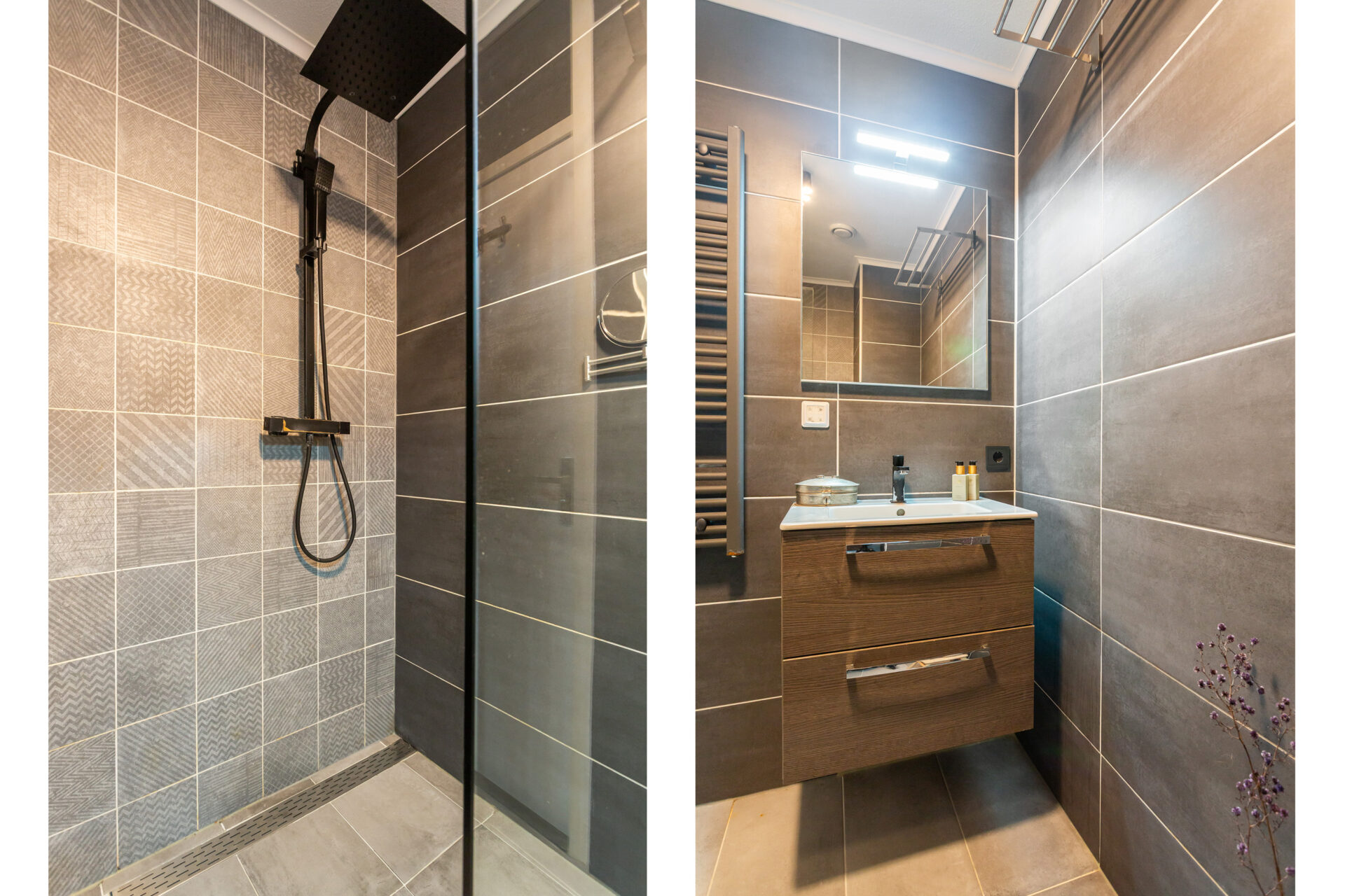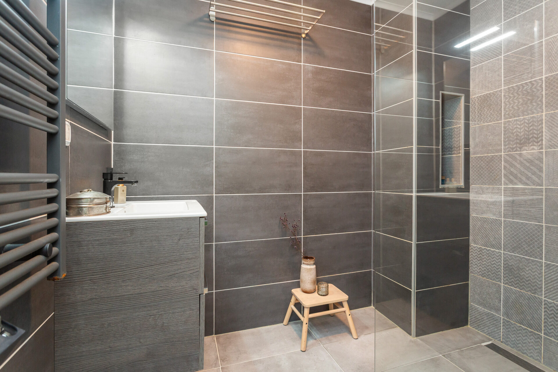 Badkamer: ± 3 m², voorzien van een inloopdouche, enkele wastafel met meubel en design radiator