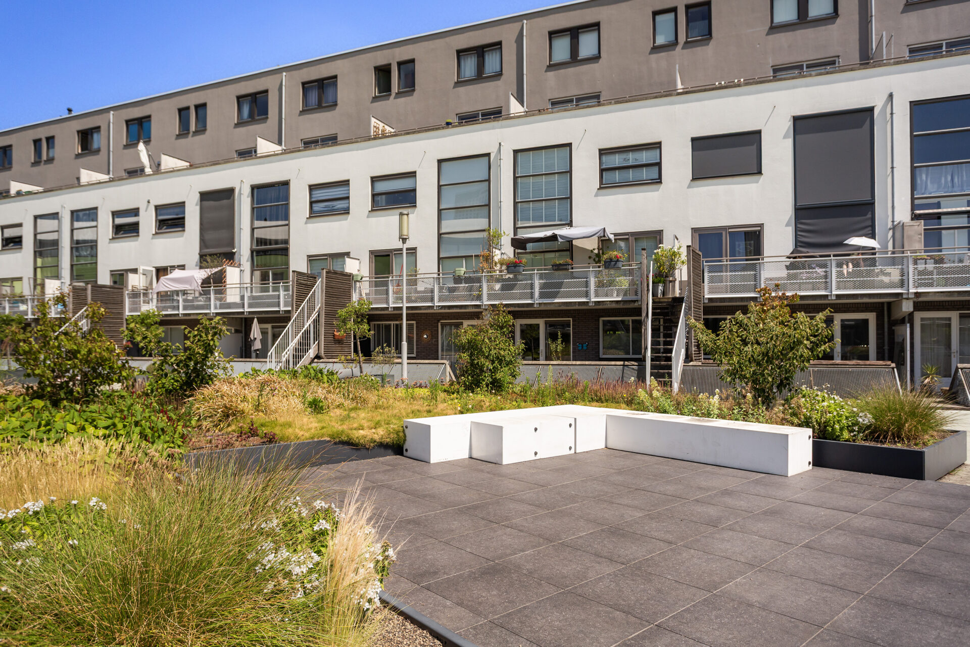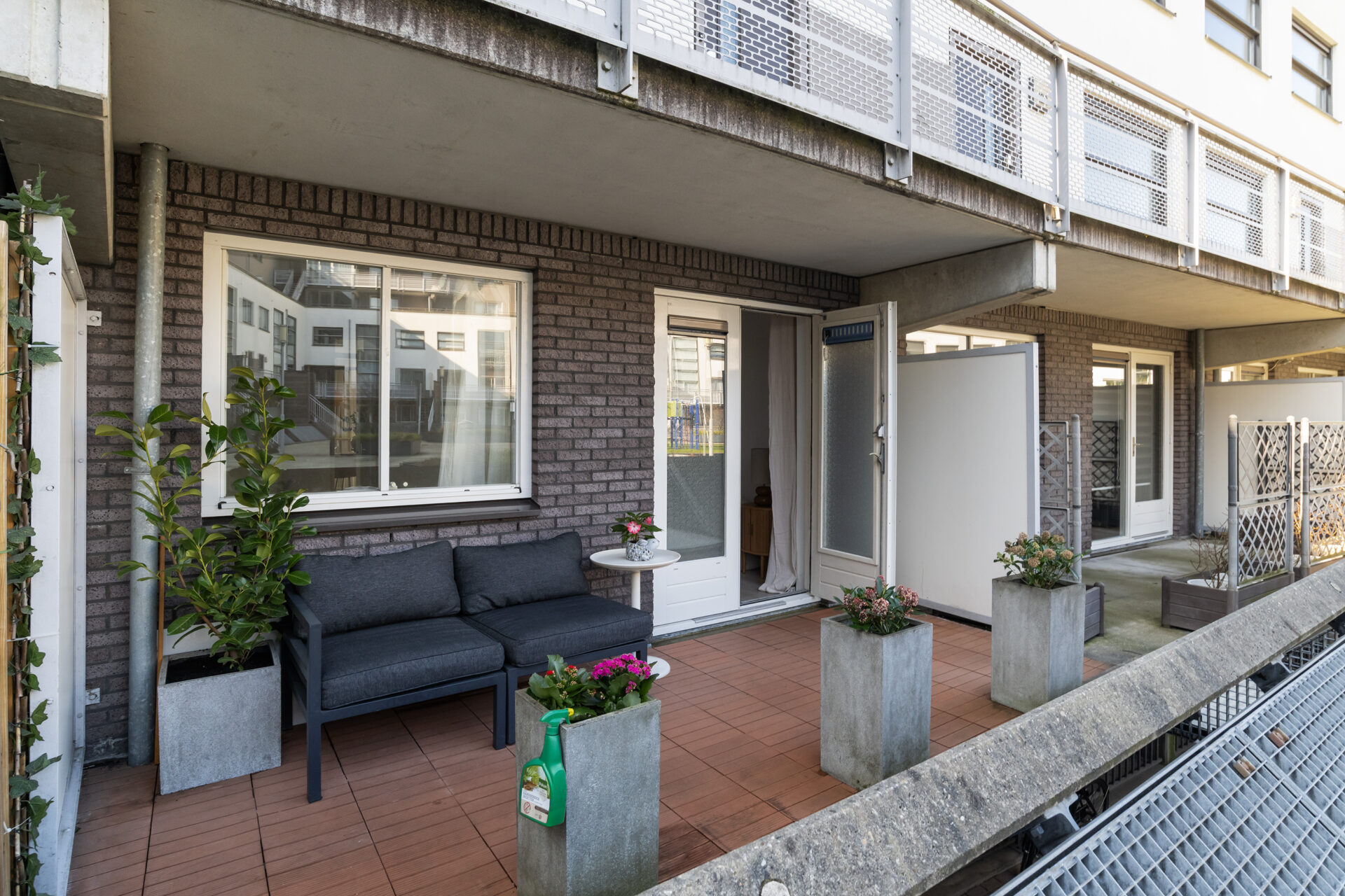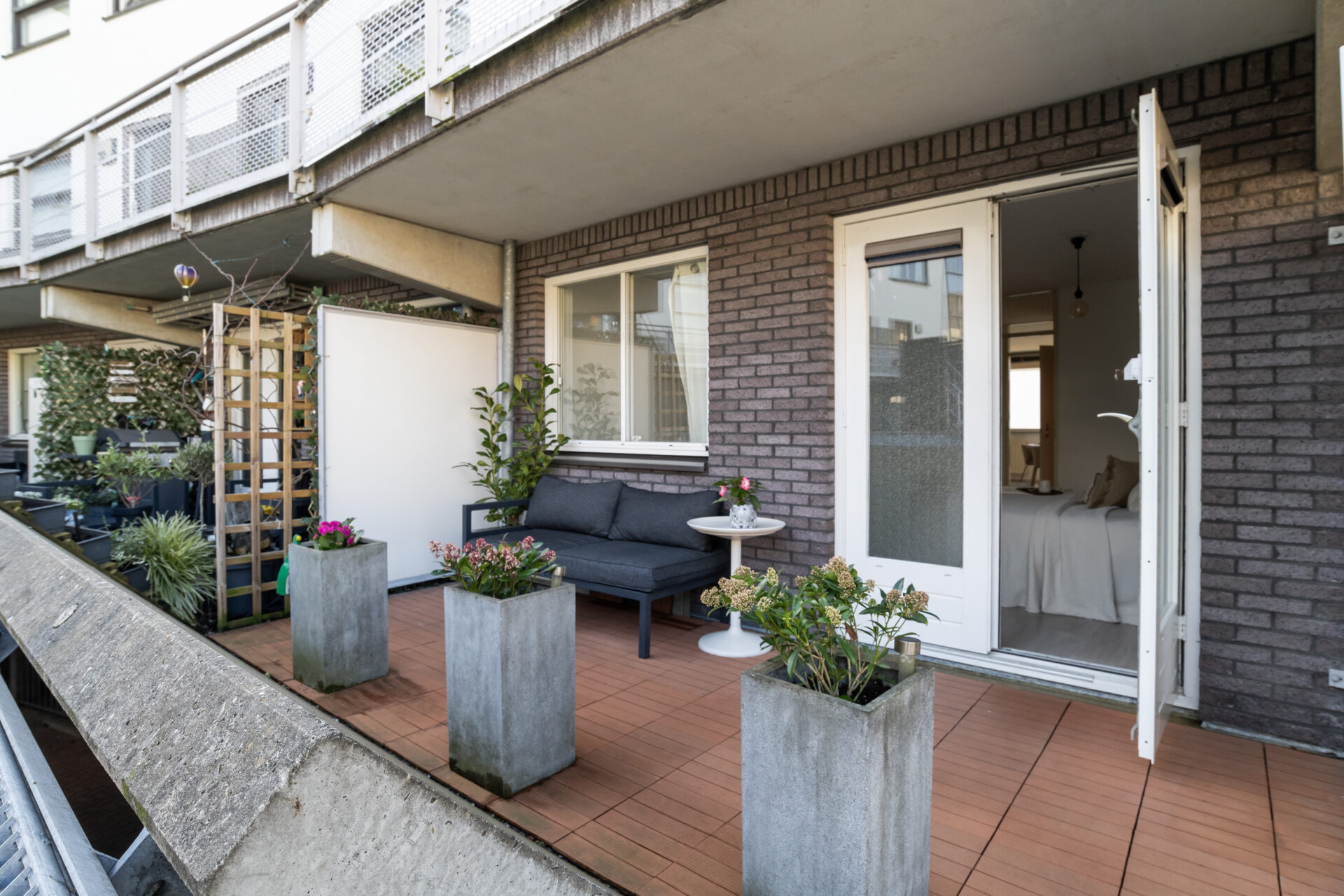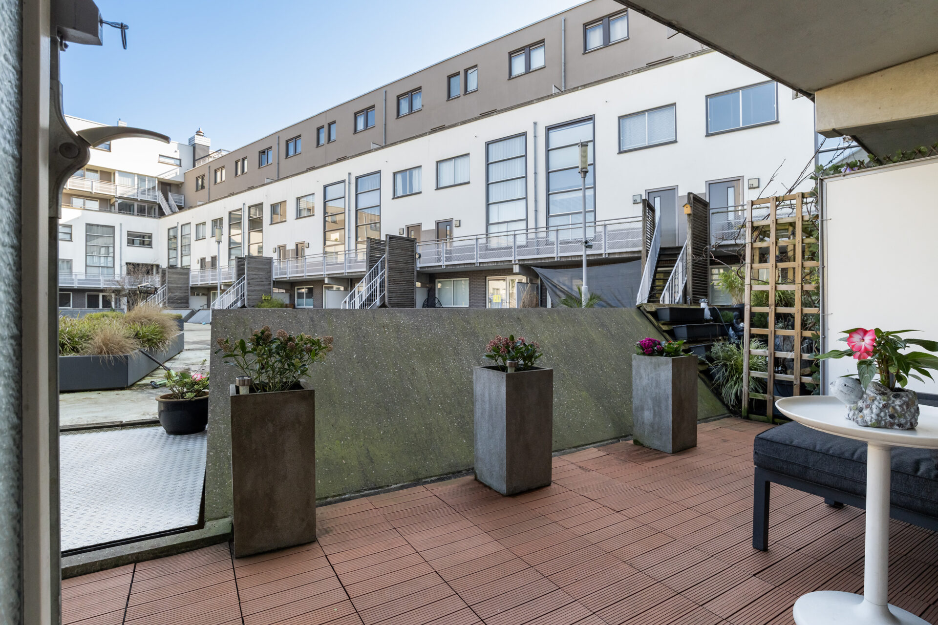 Een van onze favoriete plekken in huis is het zonnige terras. Wanneer het lekker weer is, zitten we hier graag met een kop koffie in de ochtend, een drankje aan het einde van de dag of eten we hier samen ons avondeten. Het fijne is dat je hier echt je eigen plek en privacy hebt wanneer je daar behoefte aan hebt. Tegelijkertijd loop je met de terrasdeur open zo naar het grote, groene en afgesloten binnenplein. Het plein is groen, veilig en kindvriendelijk en een plek waar buren elkaar ontmoeten.