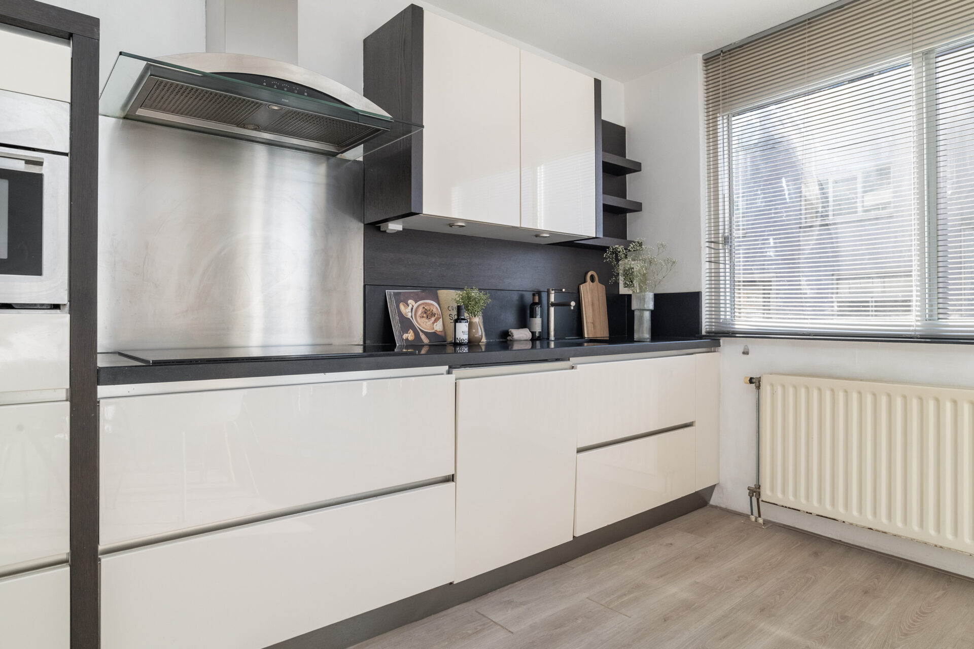 Woonkeuken: ± 17 m² voorzien van diverse inbouwapparatuur t.w. 4-pits inductiekookplaat, afzuigkap, vaatwasser, oven en een koelkast met vriesvak