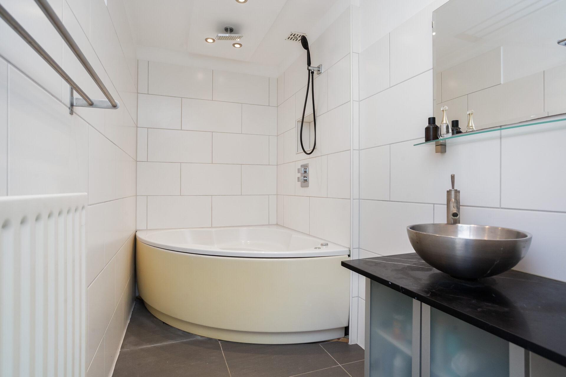 Badkamer: ± 4 m², voorzien van een ligbad met whirlpoolfunctie en douchefunctie en een enkele wastafel met meubel