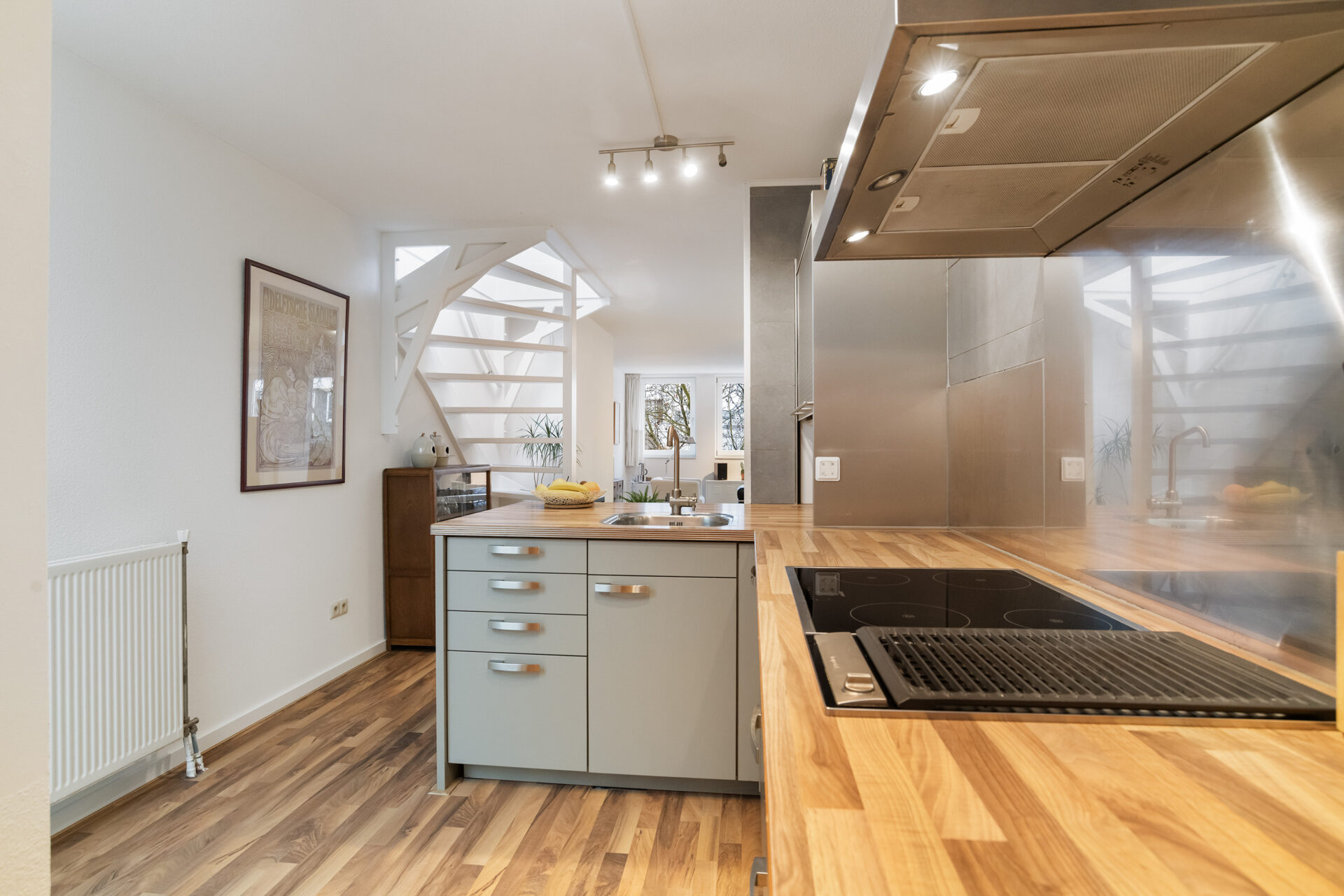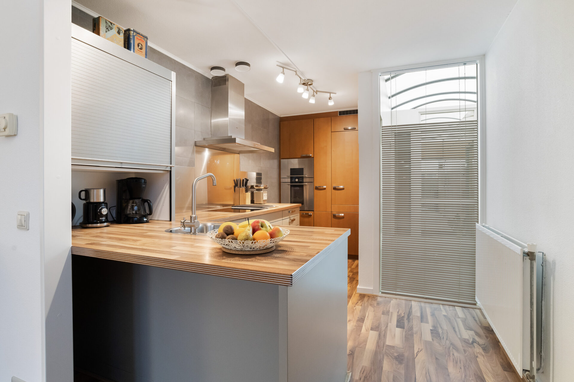 Keuken: ± 10 m² voorzien van diverse inbouwapparatuur t.w. 4-pits inductiekookplaat, grillplaat, oven, stoomoven, vaatwasser, koel-vriescombinatie en afzuigkap