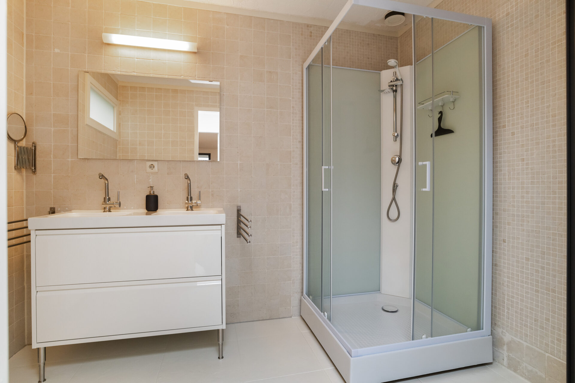 Badkamer: ± 5 m², voorzien van een douche en een dubbele wastafel met meubel