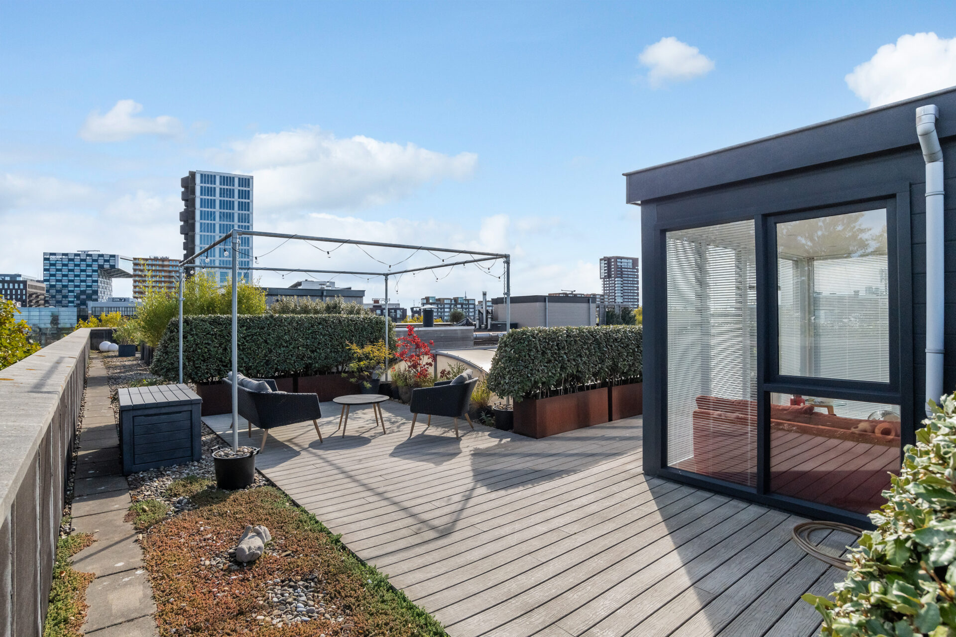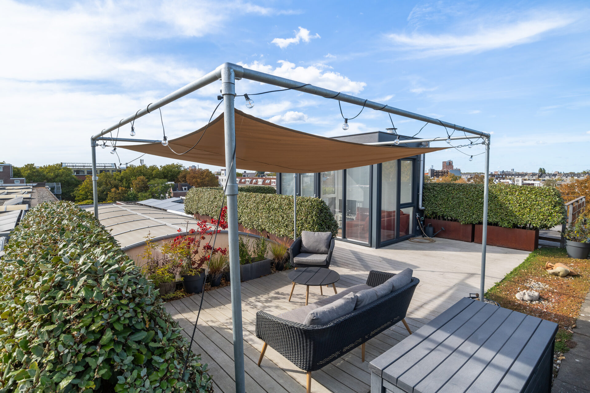 Beide slaapkamers zijn van goed formaat en bieden volop mogelijkheden. De master bedroom was voorheen opgesplitst in twee slaapkamers en dit is eenvoudig weer te realiseren als je een extra slaapkamer wenst. Via de trap in de woonkamer bereik je de vierde, tevens bovenste verdieping met een extra kamer die perfect is als lounge- of werkplek. Stap hier het dakterras van ± 53 m²  op en ervaar de rust, privacy en het uitzicht met jaardoor de hele dag zowel zon als schaduwopties. De uit het zicht opgestelde zonnepanelen zorgen voor een lage energierekening