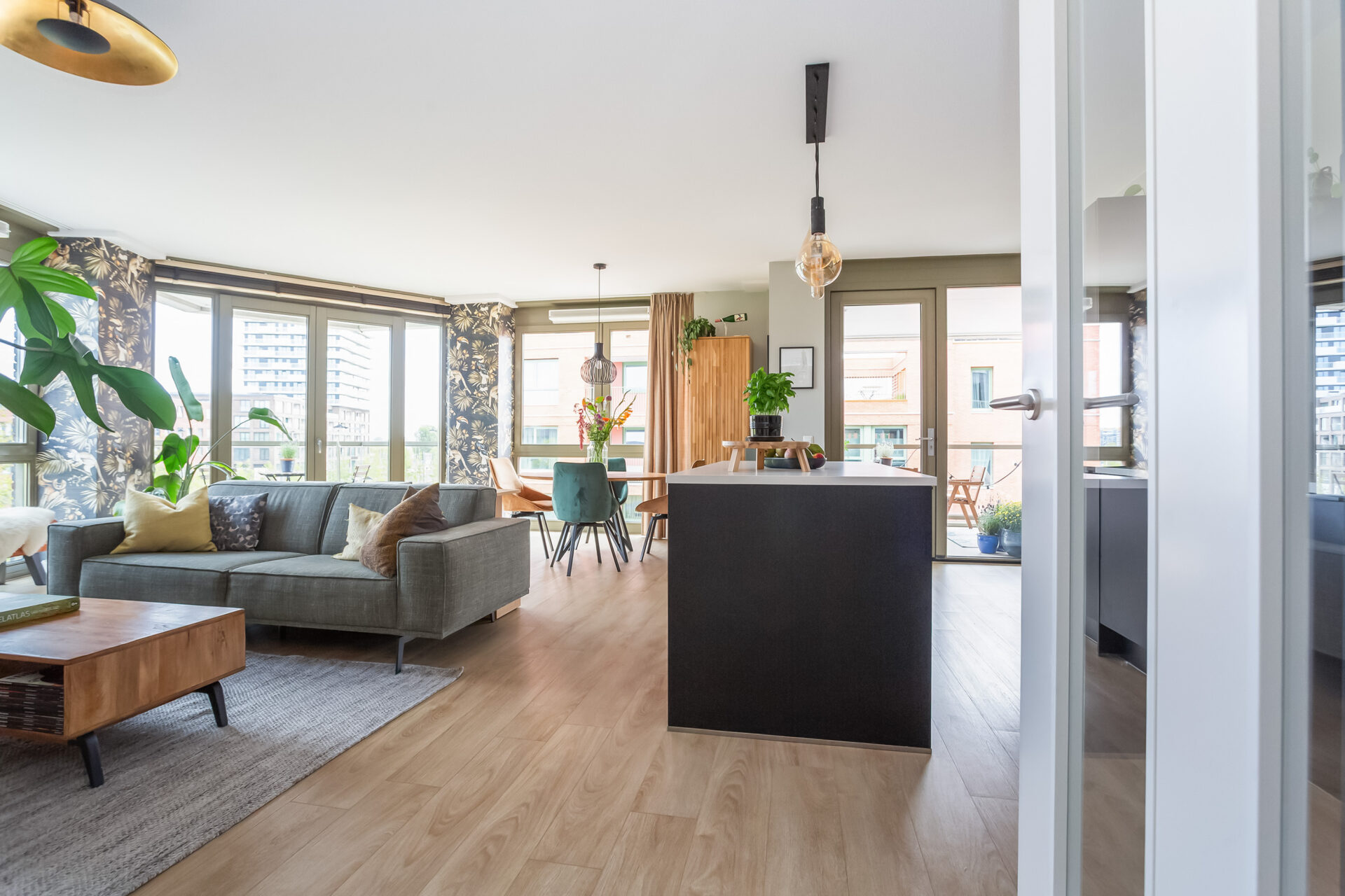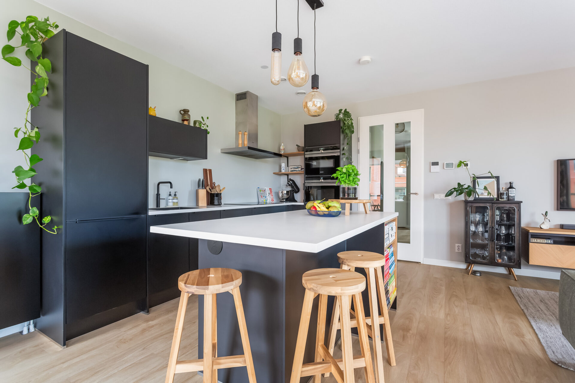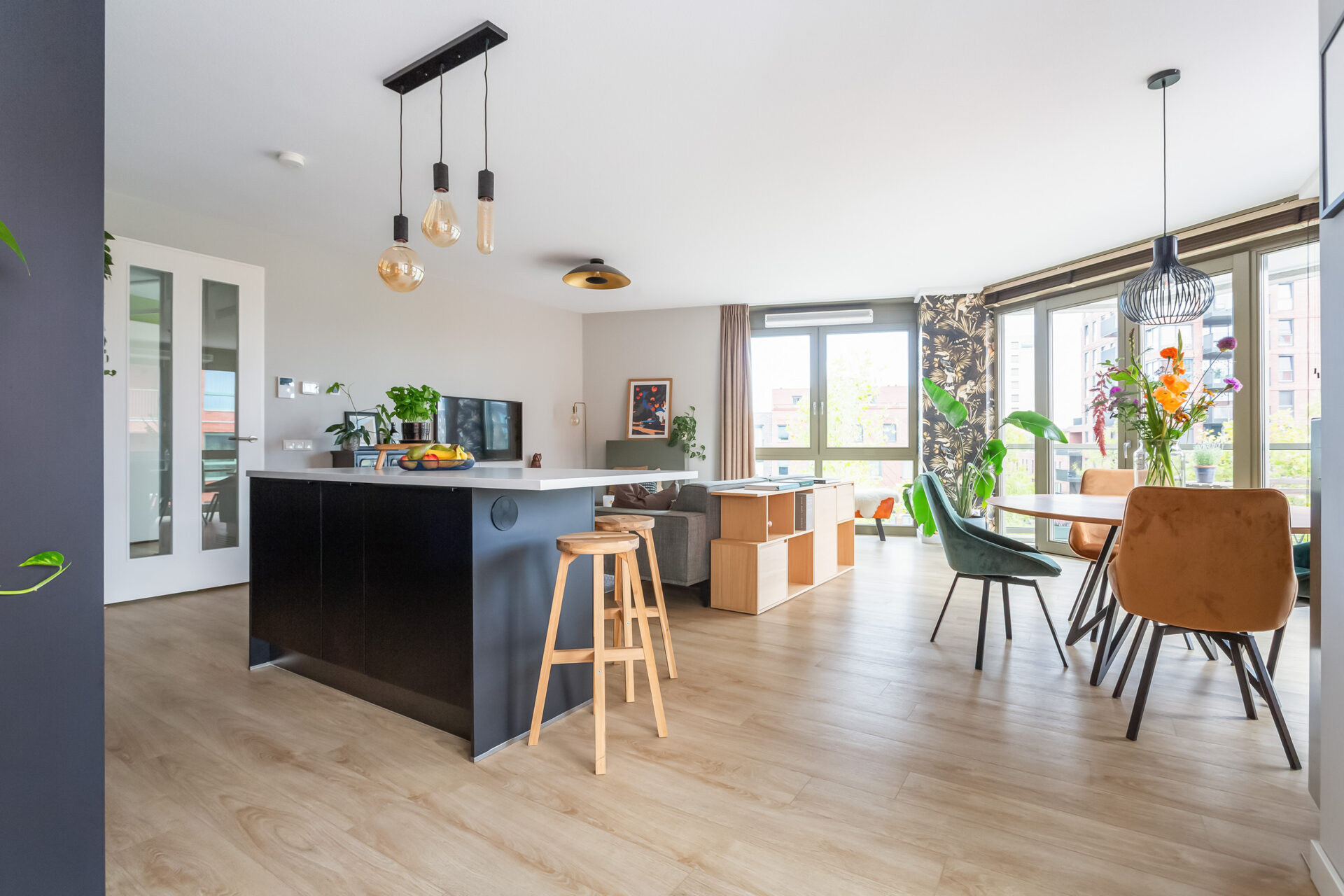 De woonkamer is heerlijk licht dankzij de hoekligging en de vele ramen. De open keuken met kookeiland en bar trekt direct je aandacht: strak, gezellig en perfect voor de kookliefhebber. Terwijl jij kookt, zit iedereen gezellig aan de bar. Vanuit de woonkamer stap je zo beide balkons op. Aan de rustige zijkant vind je de grootste, waar je ’s ochtends met een kop koffie in de zon kunt zitten. De lichte pvc- vloer door de hele woning zorgt voor een mooi en rustig geheel.
