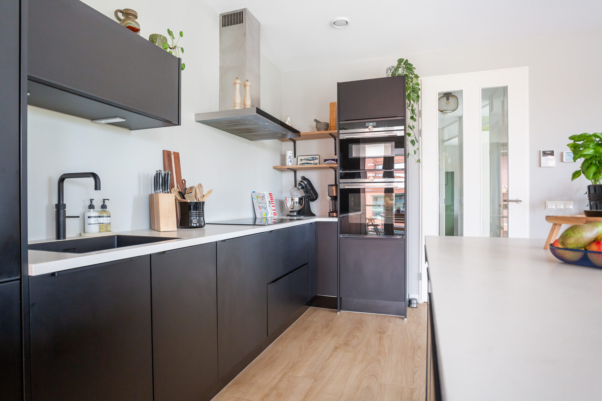 Keuken, voorzien van diverse inbouwapparatuur t.w. 5-pits inductiekookplaat, afzuigkap, vaatwasser, oven, combi magnetron, koel- vriescombinatie en Quooker