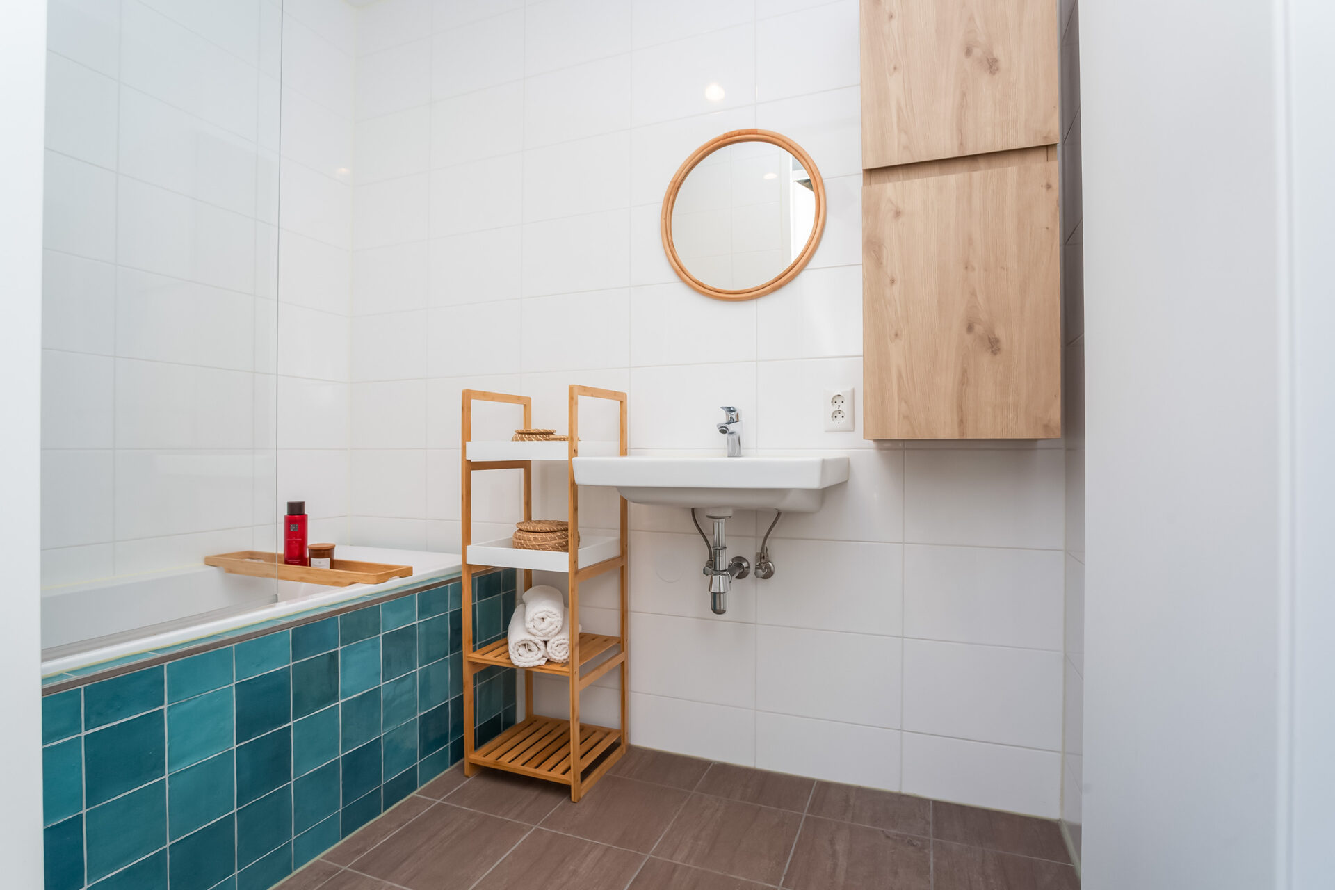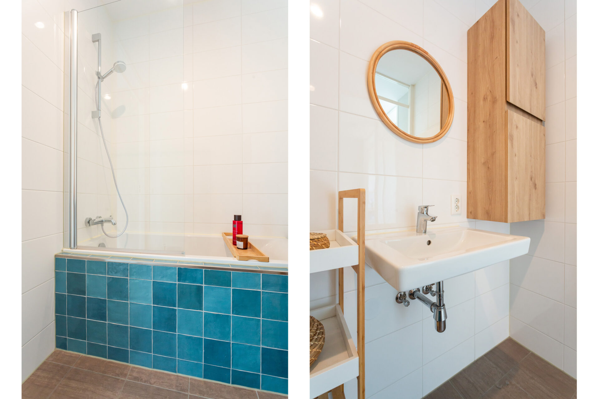 Badkamer II: ± 4 m², voorzien van bad met douchefunctie en wastafel met meubel