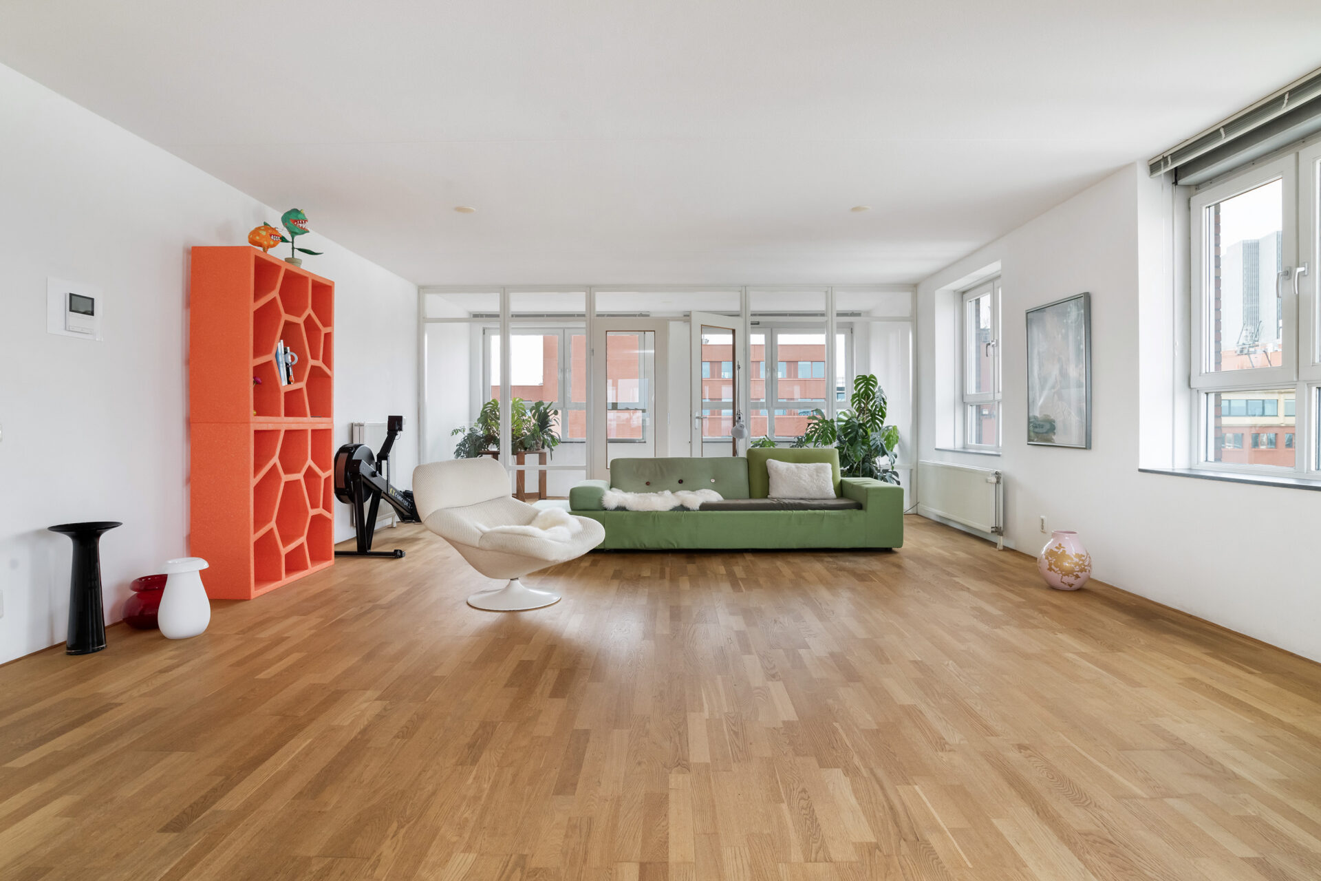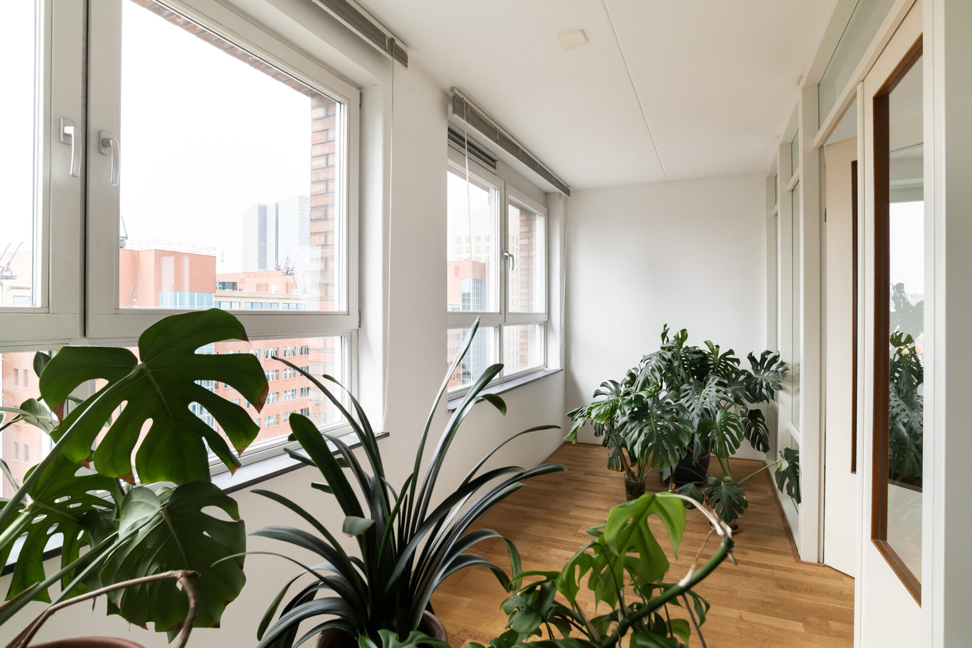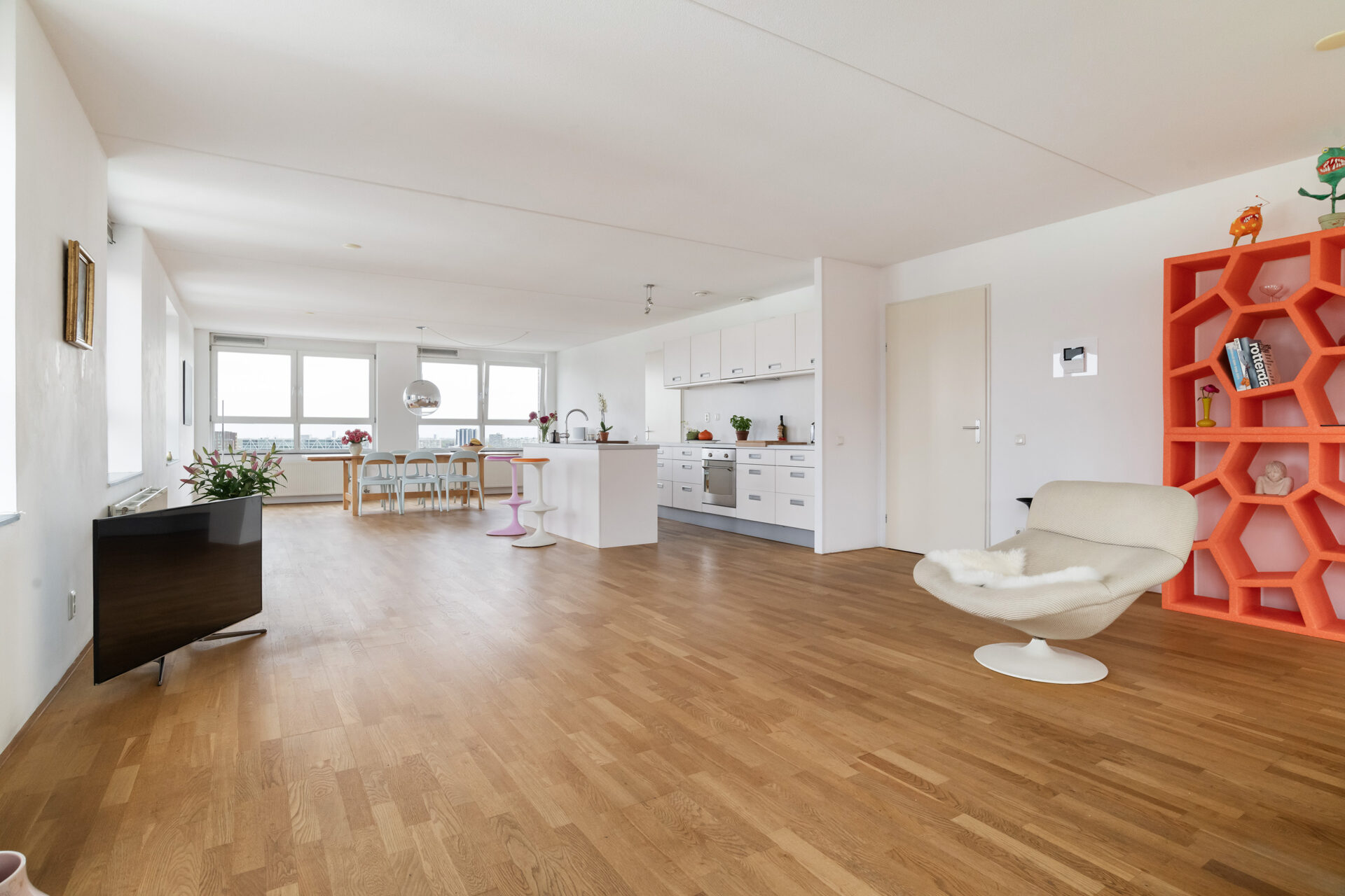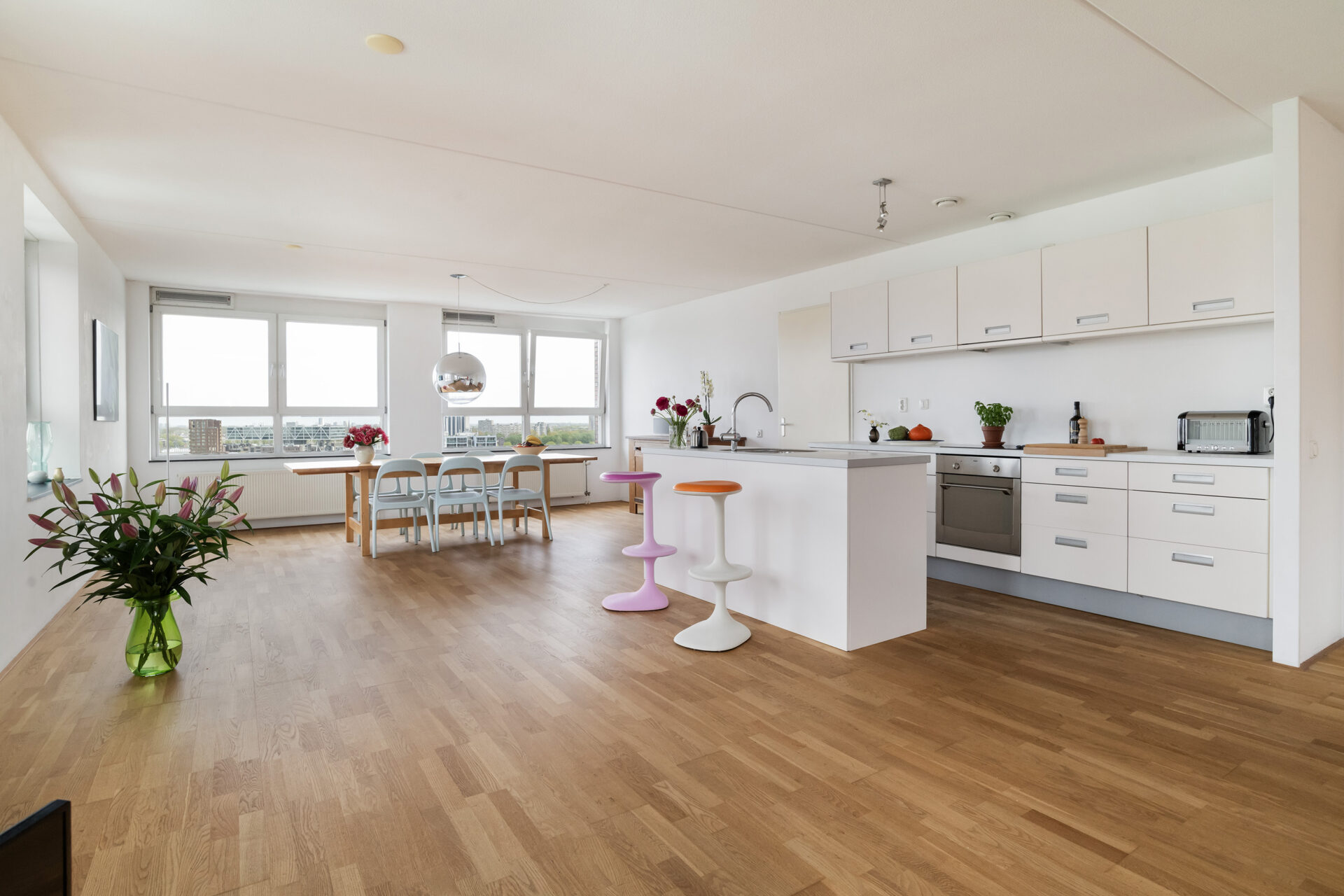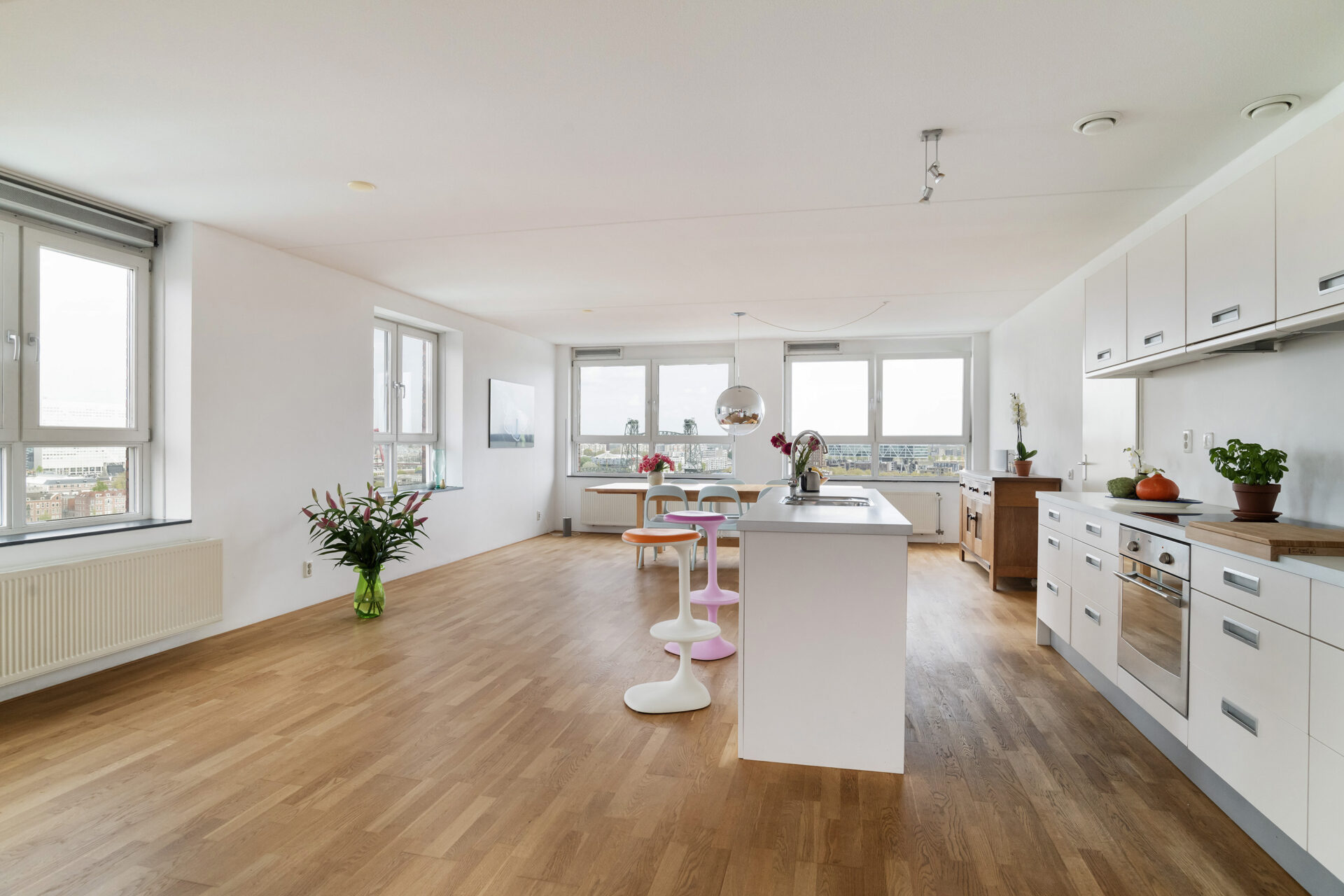 Bij binnenkomst in het leefgedeelte wordt je blik meteen naar buiten getrokken. Wat een uitzicht! Overdag trekt de dynamiek van de stad aan je voorbij, terwijl ’s avonds de skyline verandert in een fonkelend panorama. De gigantische open leefruimte met grote raampartijen rondom zorgt voor een zee aan licht en een heerlijk ruimtelijk gevoel. Hier heb je alle vrijheid om een fijne zit- en eethoek te creëren. De open keuken met spoeleiland sluit hier perfect op aan en is van alle gemakken voorzien, terwijl je altijd in contact blijft met je gezelschap. Aan de voorzijde vind je de serre, een fijne extra ruimte die je volledig naar wens kunt gebruiken. Denk aan een werkplek, een speelruimte of misschien wel een heerlijke loungehoek. Het kan hier allemaal!