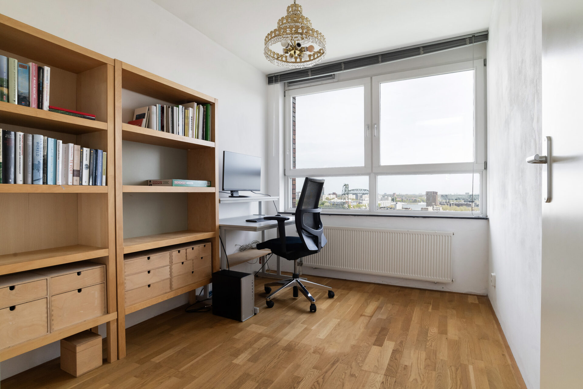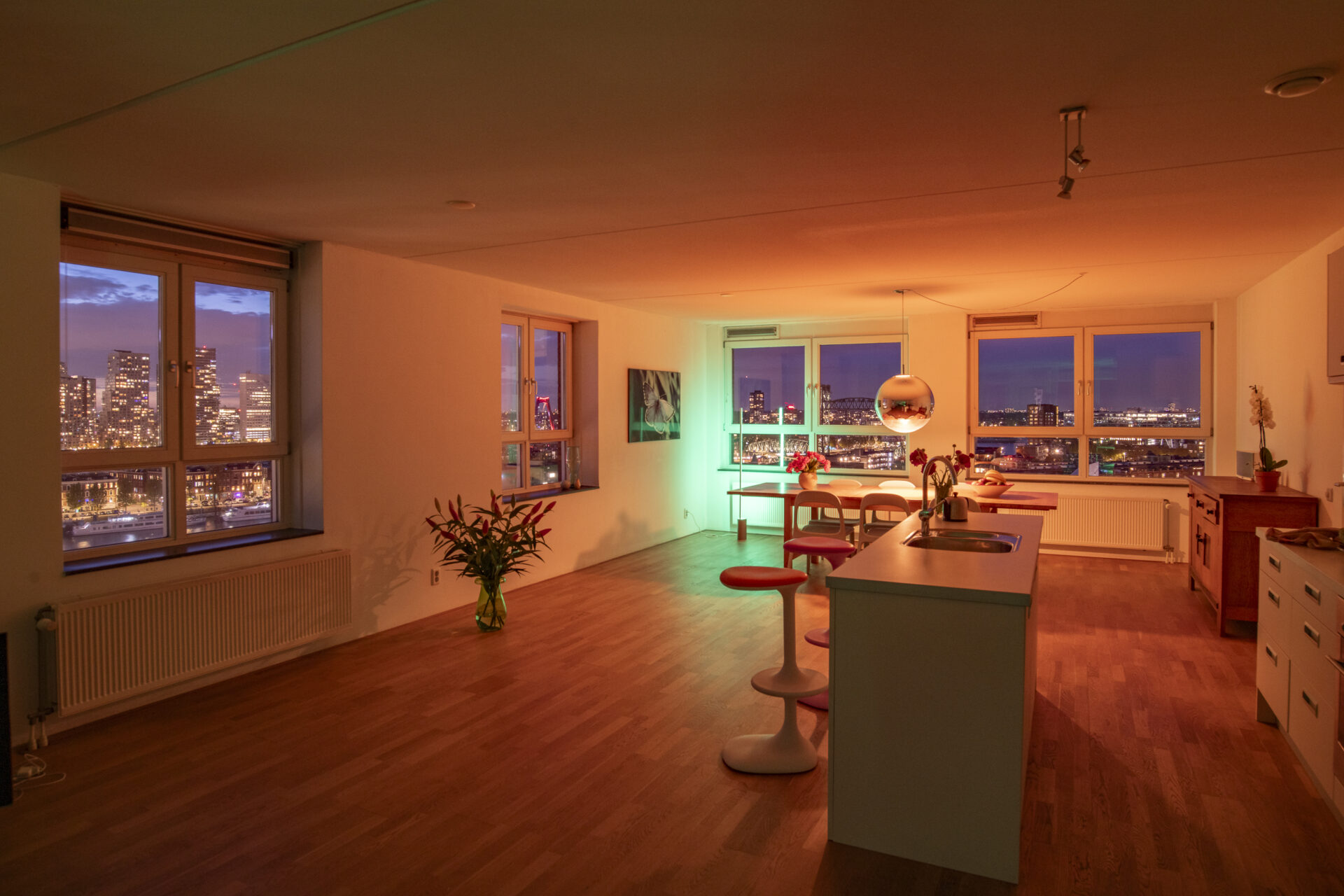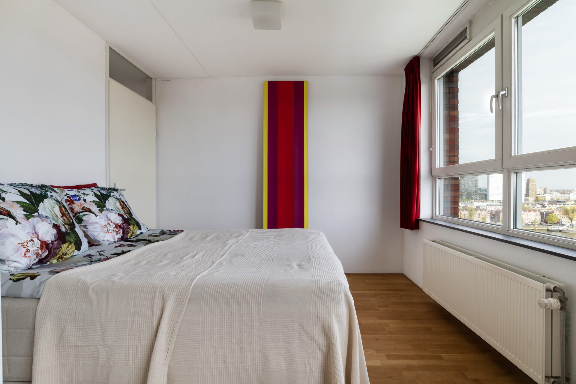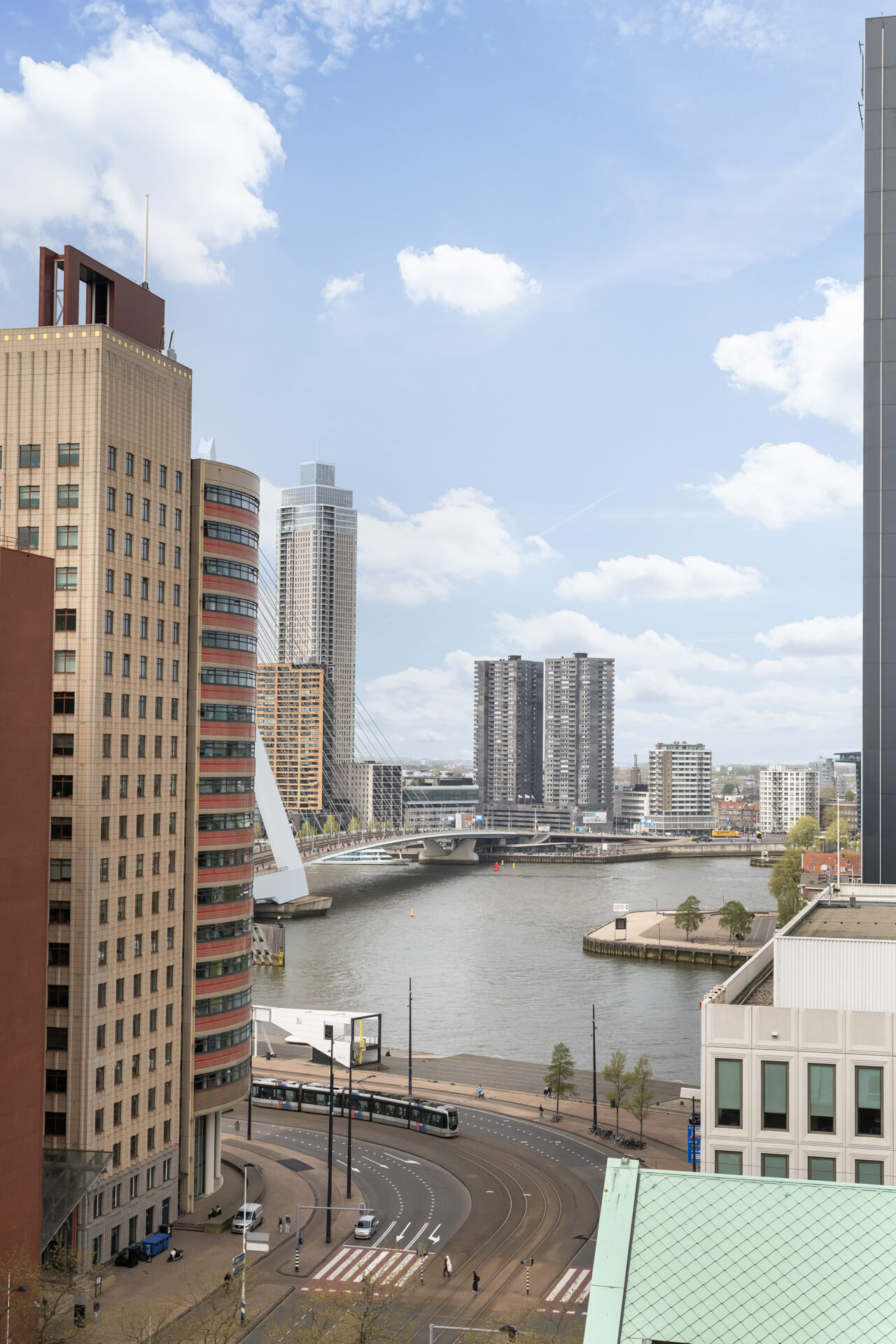 Elke dag weer zijn wij onder de indruk van het fenomenale uitzicht. Vanuit de 15e verdieping zie je – gewoon zittend op de bank – de stad, de skyline, de rivier en de wolkenluchten voorbijkomen. We genieten enorm van de bedrijvigheid op de Nieuwe Maas; regelmatig zien we nieuw gebouwde superjachten, drijvende kranen en pontons voorbijvaren. Een jaarlijks feest is de marathon, waarbij we de duizenden deelnemers vanaf de start op de Erasmusbrug direct langs ons gebouw zien lopen. Ondanks dat je hier midden in de stad woont, is het appartement een oase van rust. Onze slaapkamer ligt aan de zijde van de Spoorweghaven en is echt stil. Ook het klimaat in huis is erg prettig: in de zomer blijft het binnen heerlijk koel omdat de zon alleen in de vroege ochtend en de avond direct naar binnen schijnt. We gaan deze plek en dit unieke schouwspel zeker missen.