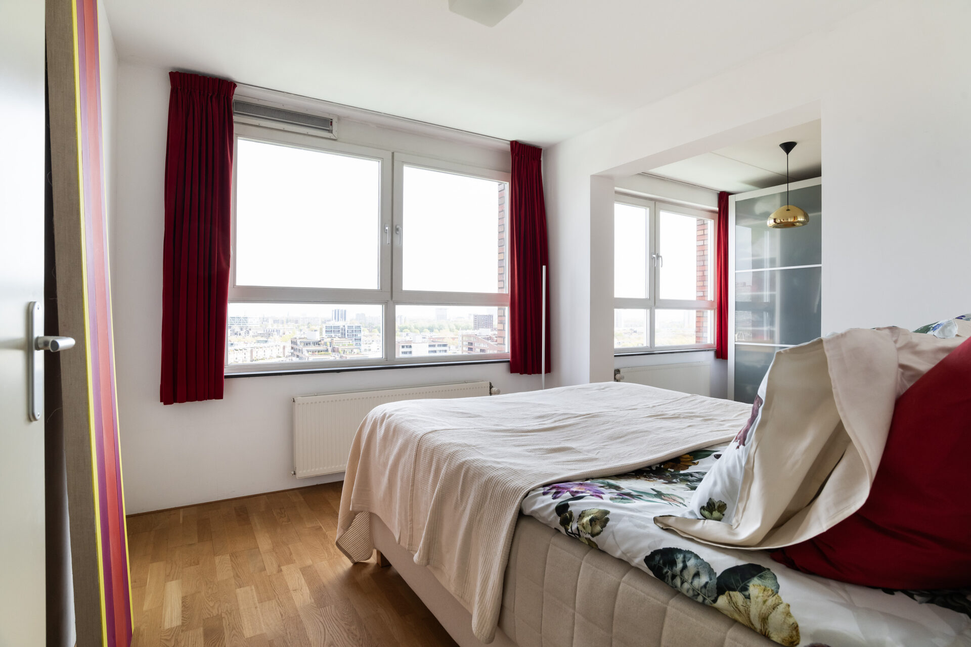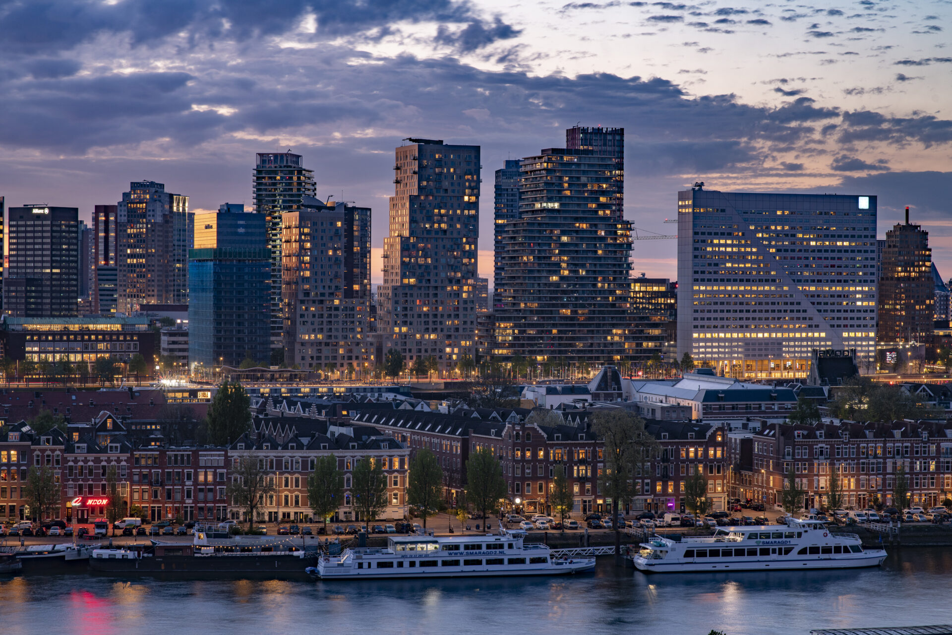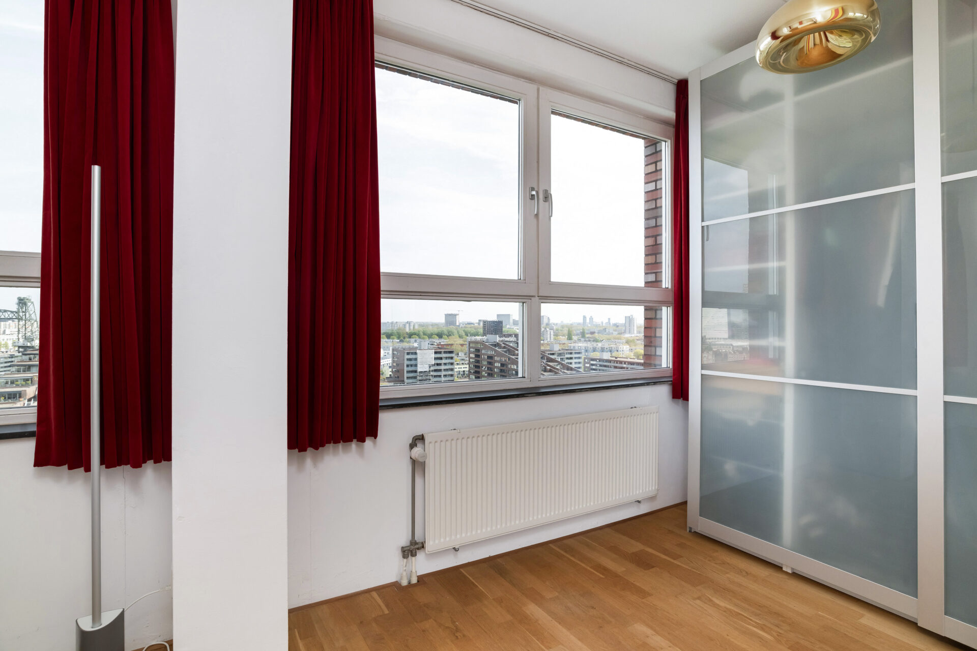 Elke dag weer zijn wij onder de indruk van het fenomenale uitzicht. Vanuit de 15e verdieping zie je – gewoon zittend op de bank – de stad, de skyline, de rivier en de wolkenluchten voorbijkomen. We genieten enorm van de bedrijvigheid op de Nieuwe Maas; regelmatig zien we nieuw gebouwde superjachten, drijvende kranen en pontons voorbijvaren. Een jaarlijks feest is de marathon, waarbij we de duizenden deelnemers vanaf de start op de Erasmusbrug direct langs ons gebouw zien lopen. Ondanks dat je hier midden in de stad woont, is het appartement een oase van rust. Onze slaapkamer ligt aan de zijde van de Spoorweghaven en is echt stil. Ook het klimaat in huis is erg prettig: in de zomer blijft het binnen heerlijk koel omdat de zon alleen in de vroege ochtend en de avond direct naar binnen schijnt. We gaan deze plek en dit unieke schouwspel zeker missen.