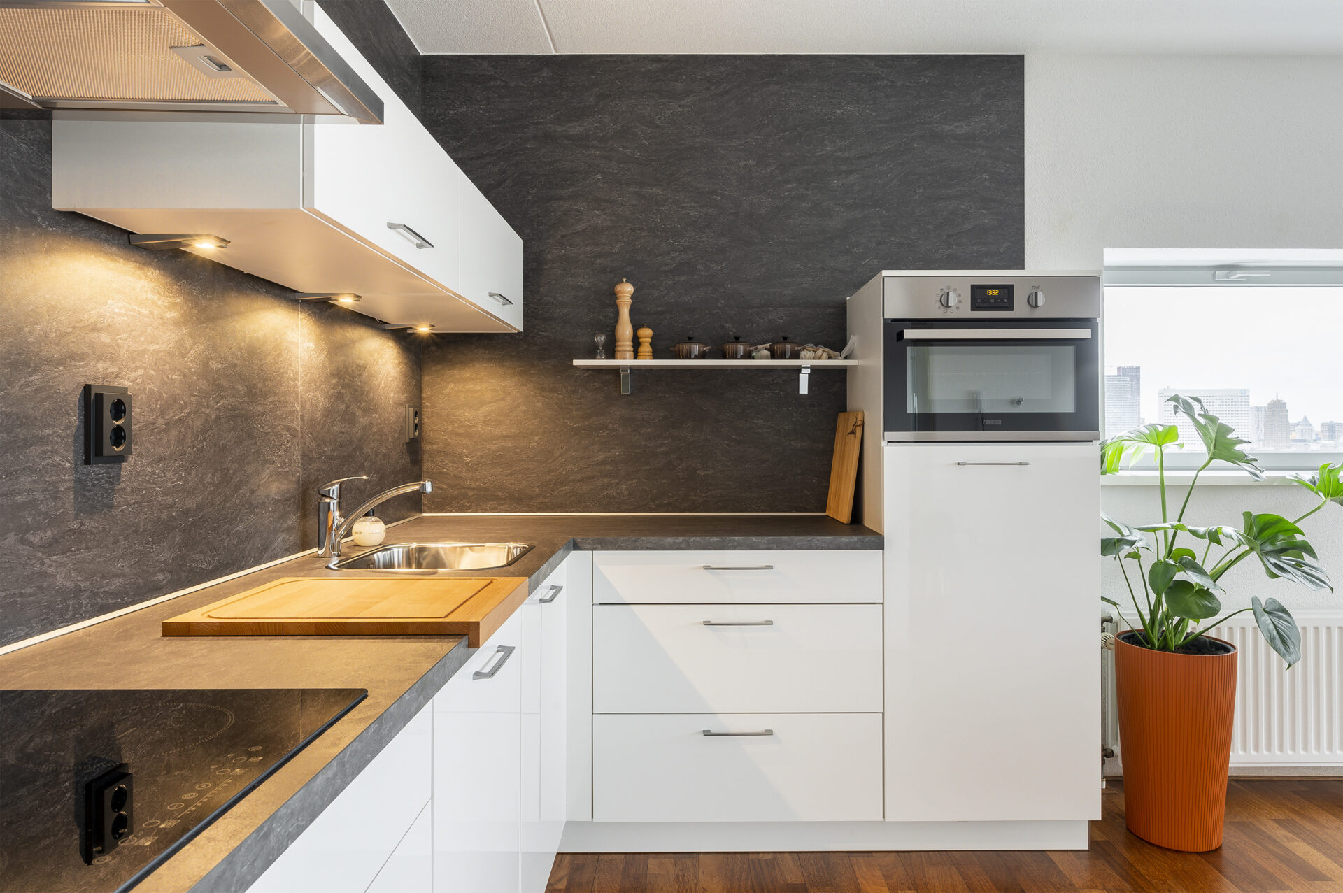 Keuken voorzien van diverse inbouwapparatuur t.w. 4-pits inductie kookplaat, afzuigkap, koelkast met vriesvak, vaatwasser, combi oven en veel kastruimte