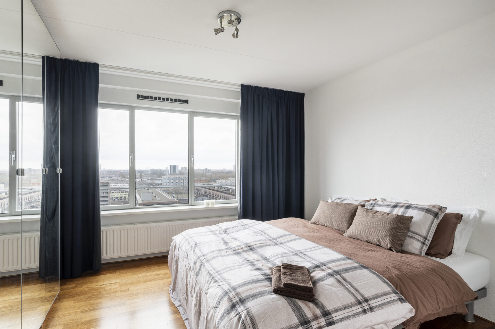 De woning beschikt over twee goede slaapkamers, beide van een prettig formaat en voorzien van grote kasten. Ook vanuit hier geniet je wederom van het waanzinnige uitzicht. De badkamer is netjes, praktisch ingericht en heeft een moderne uitstraling. Tot slot beschik je over een eigen parkeerplaats in de afgesloten parkeergarage. Hier vind je tevens ook de gemeenschappelijke fietsenstalling.