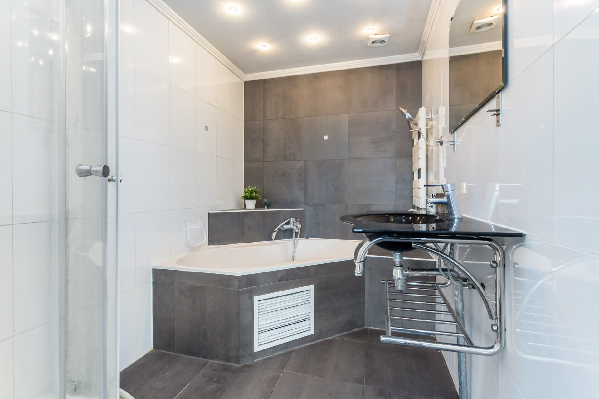 Badkamer: ± 5 m² voorzien van een ligbad met douchefunctie en whirlpool, douchecabine, enkele wastafel en radiator