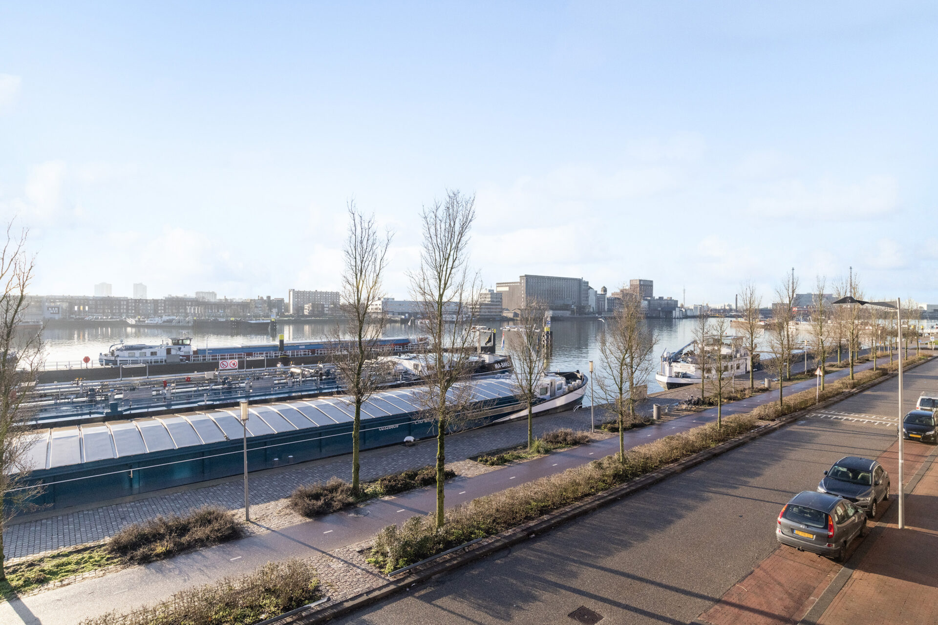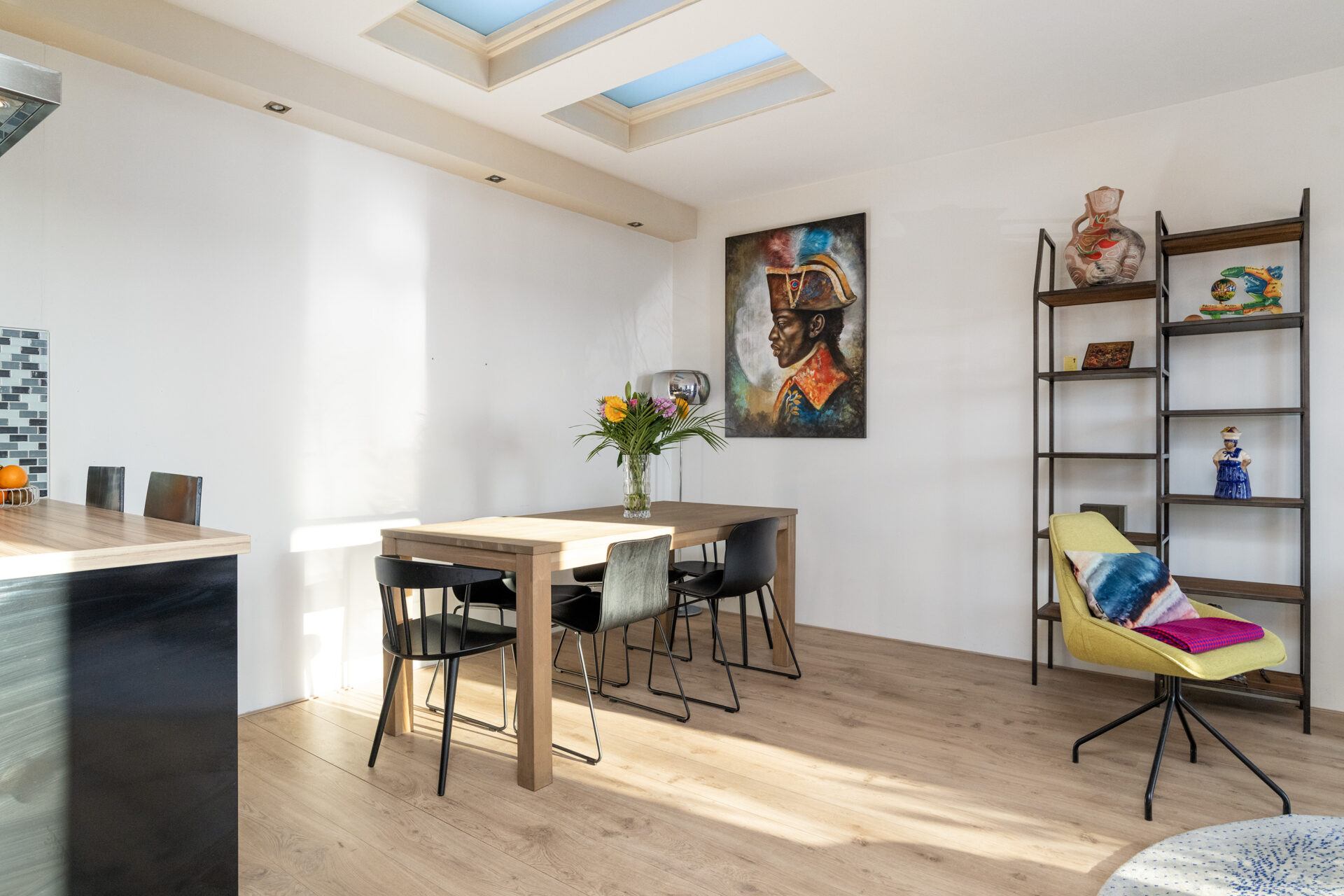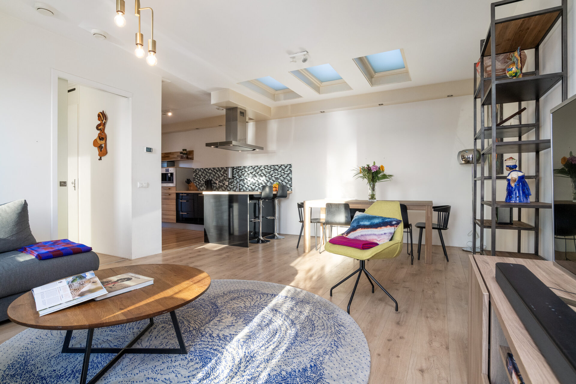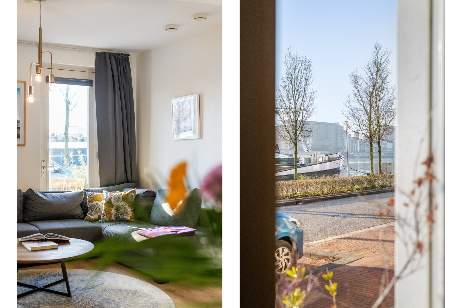 Welkom in de living, waar licht en uitzicht direct de hoofdrol spelen. Dankzij de dakkoepels stroomt het daglicht rijkelijk naar binnen en voelt de ruimte extra prettig aan. Het uitzicht over het water van de Maashaven maakt het plaatje compleet. De gladde wanden en nette laminaatvloer zorgen voor rust en een fijne basis. De keuken sluit hier perfect aan bij de woonkamer. Terwijl jij kookt, schuiven je gasten gezellig aan bij de bar.