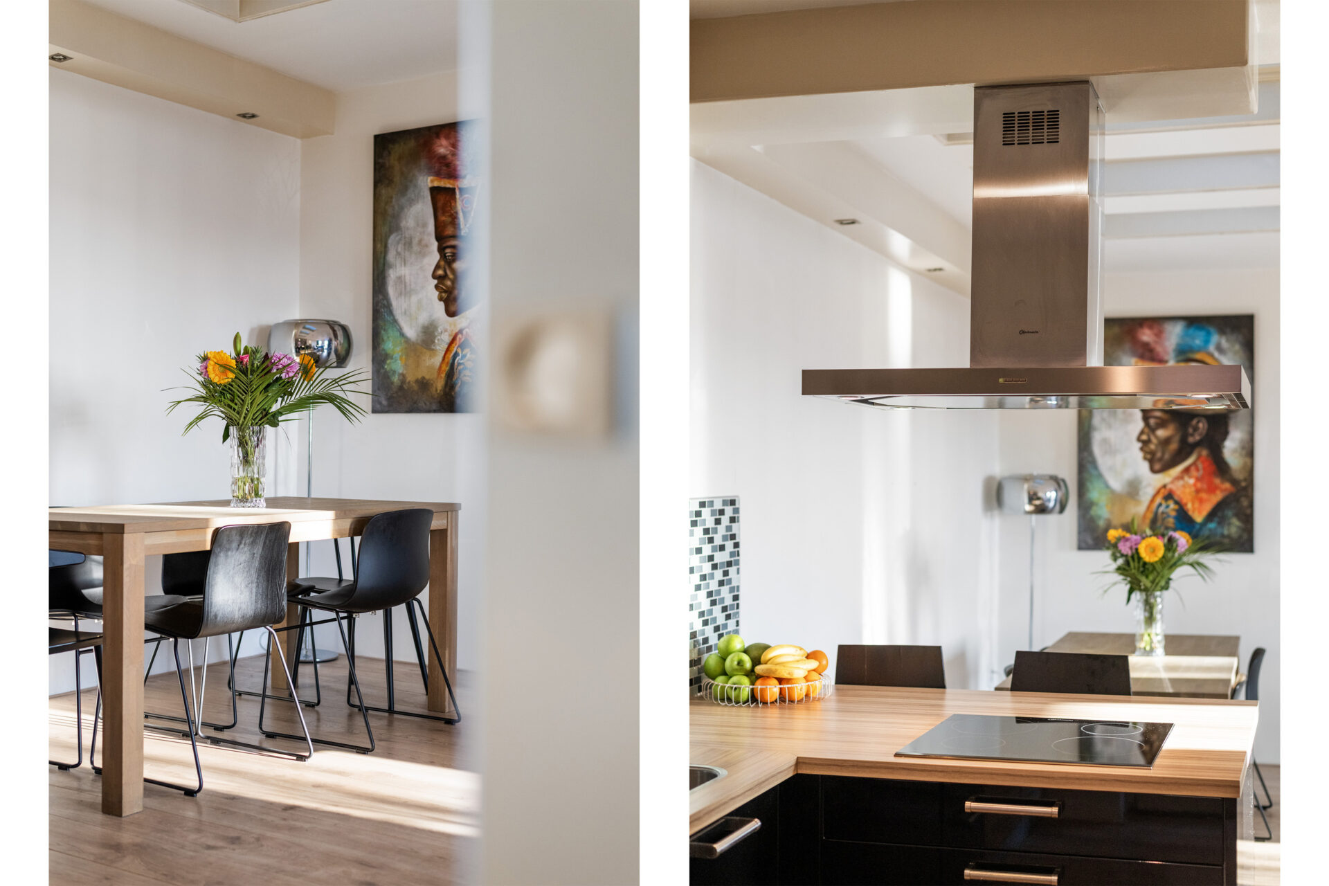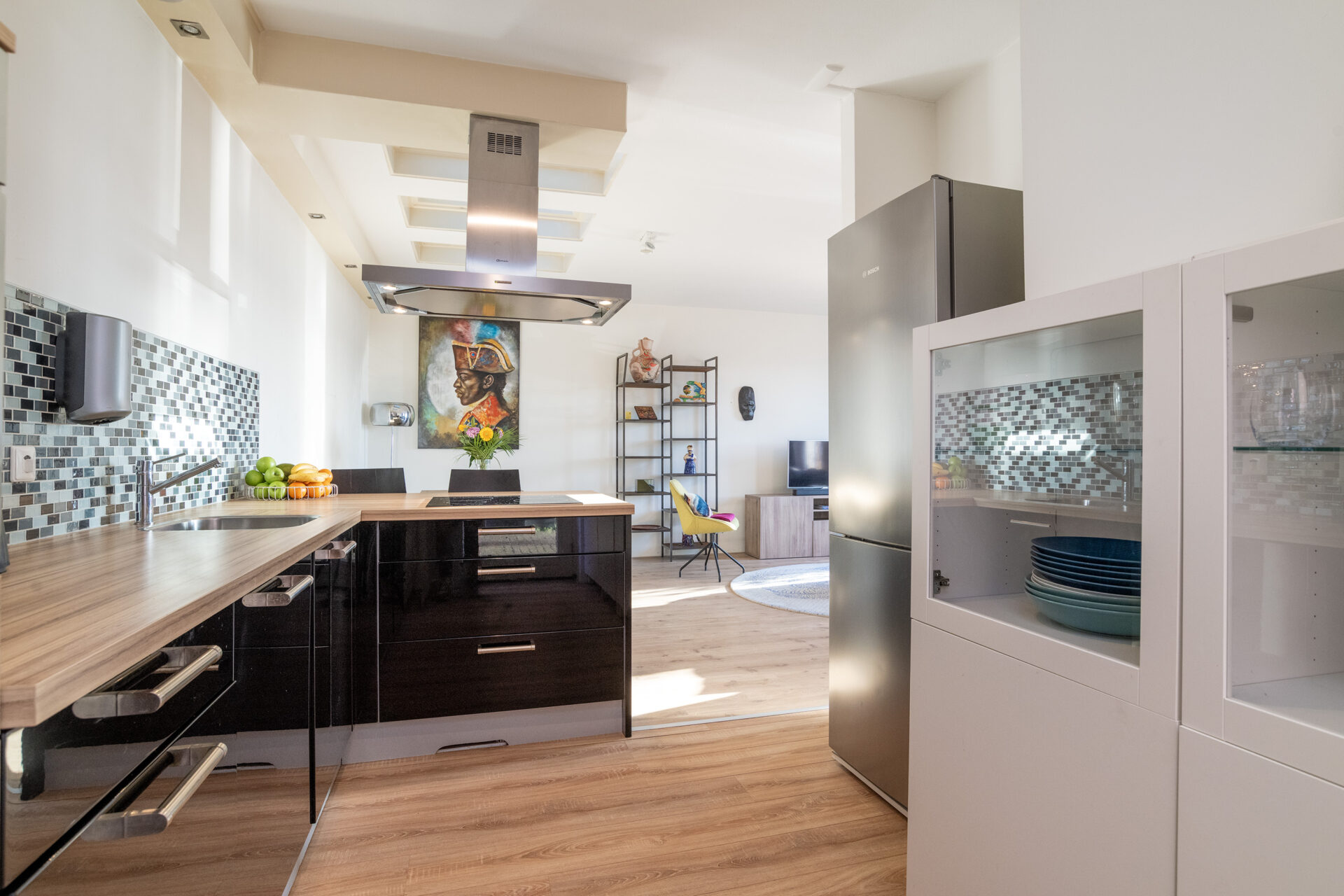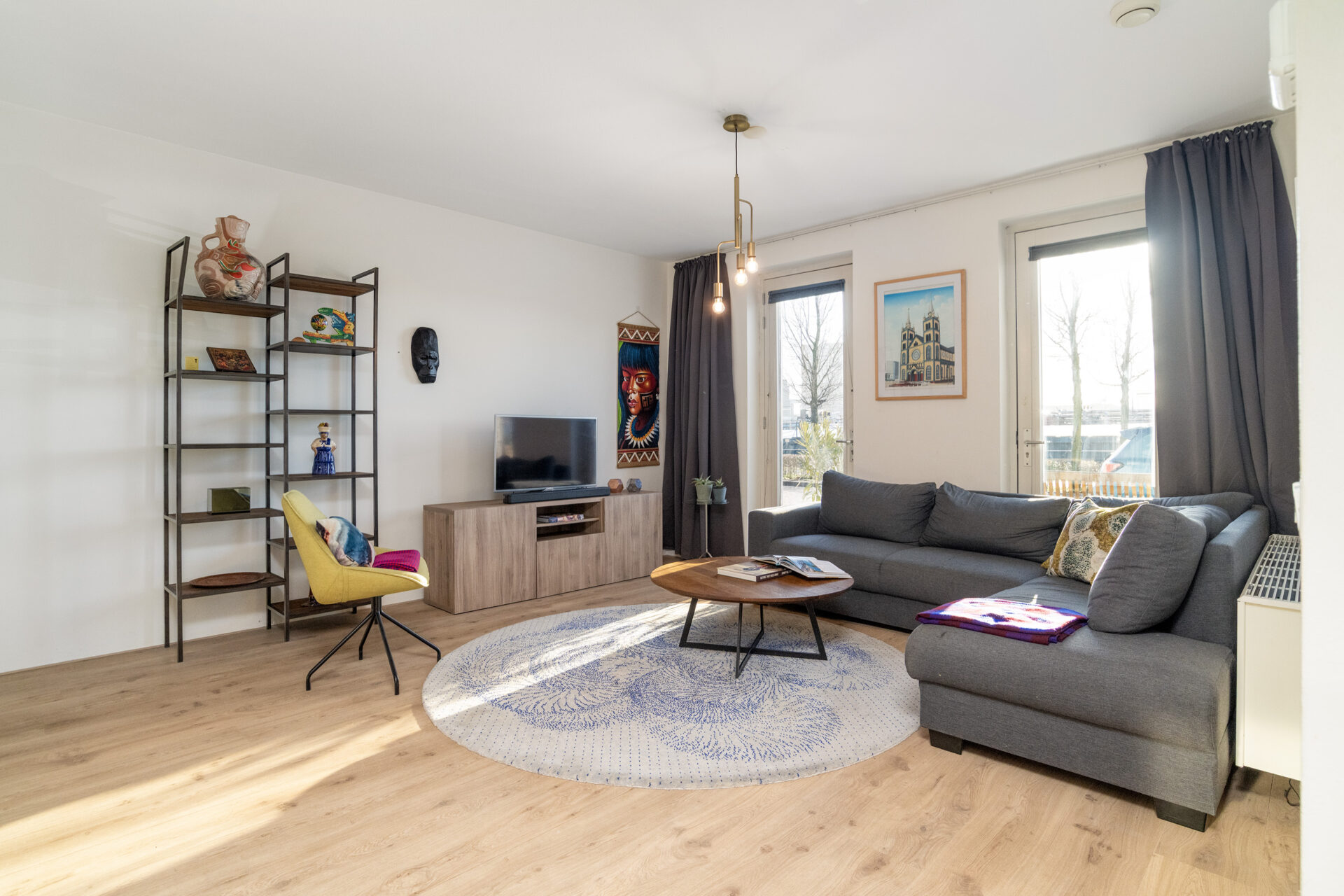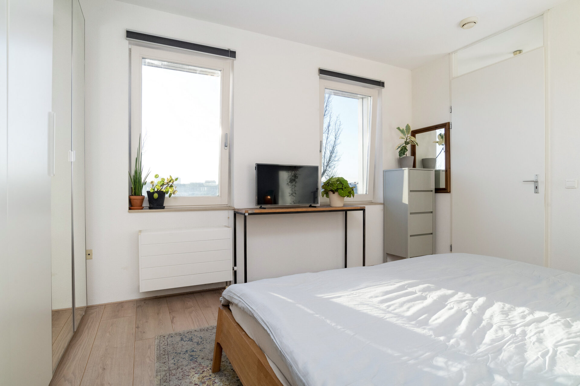 Welkom in de living, waar licht en uitzicht direct de hoofdrol spelen. Dankzij de dakkoepels stroomt het daglicht rijkelijk naar binnen en voelt de ruimte extra prettig aan. Het uitzicht over het water van de Maashaven maakt het plaatje compleet. De gladde wanden en nette laminaatvloer zorgen voor rust en een fijne basis. De keuken sluit hier perfect aan bij de woonkamer. Terwijl jij kookt, schuiven je gasten gezellig aan bij de bar.
