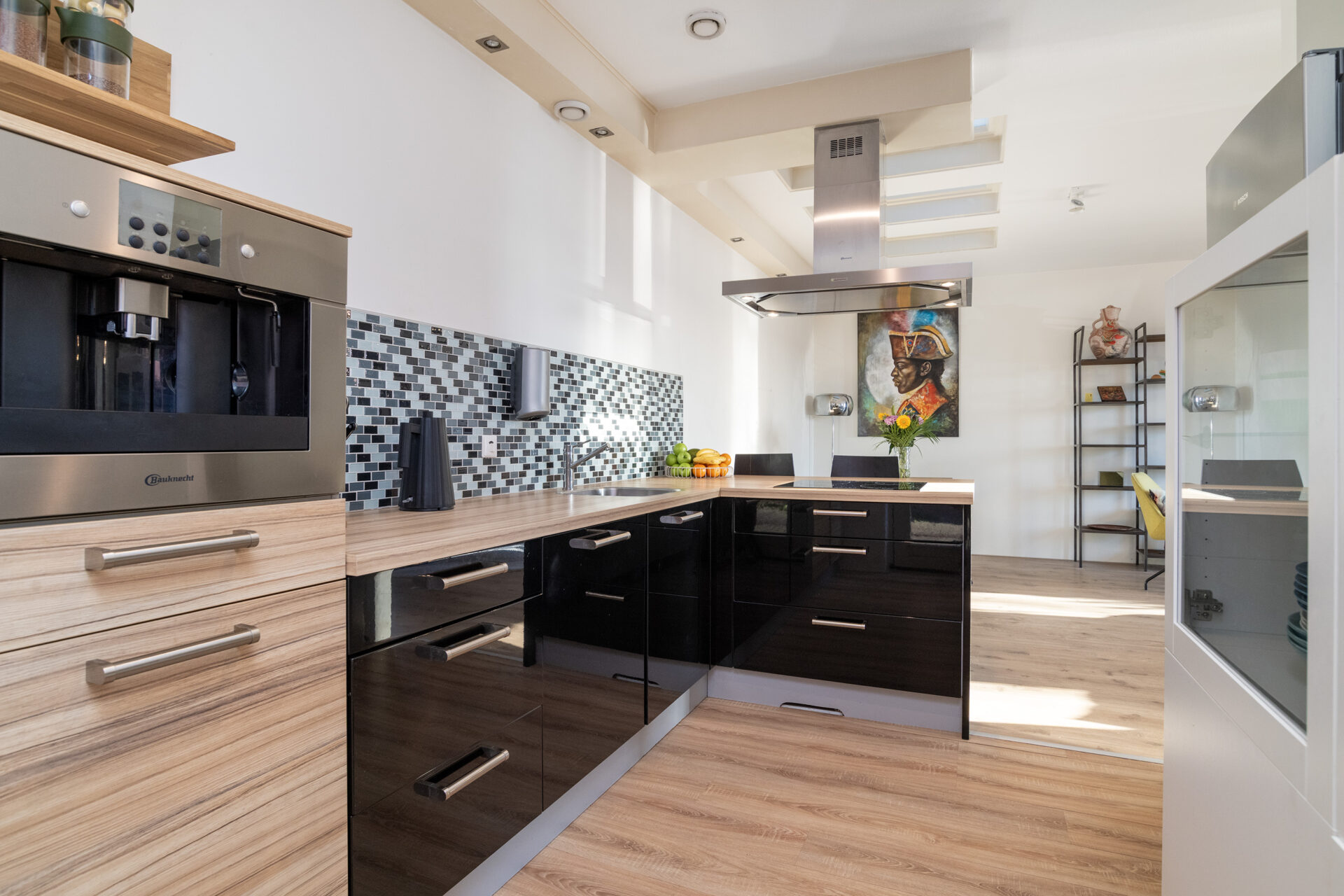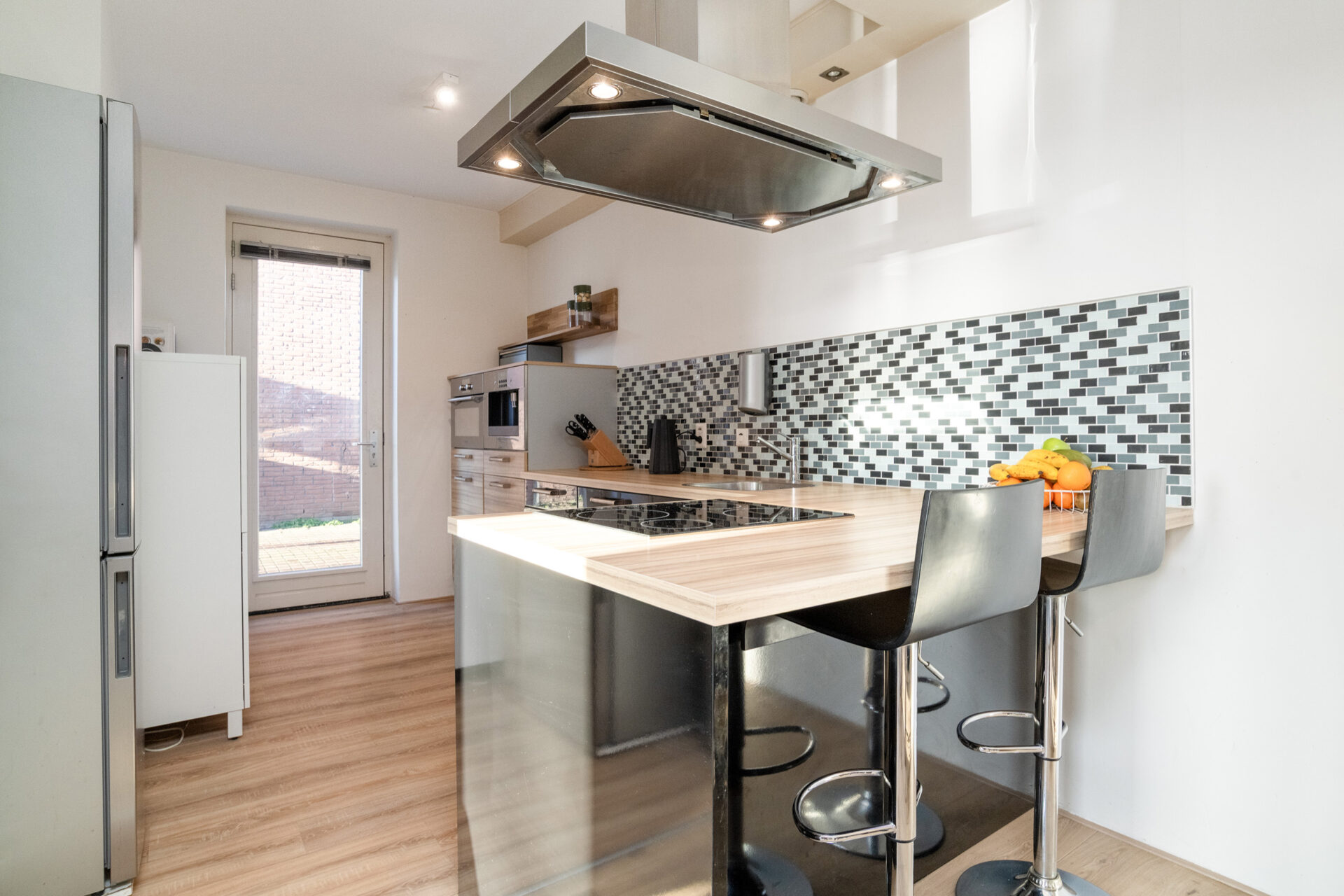 Woonkeuken voorzien van diverse Bauknecht inbouwapparatuur t.w. 4-pits inductiekookplaat, vaatwasser, combi magnetron, koffiezetapparaat, afzuigkap en een losse koel-vriescombinatie
