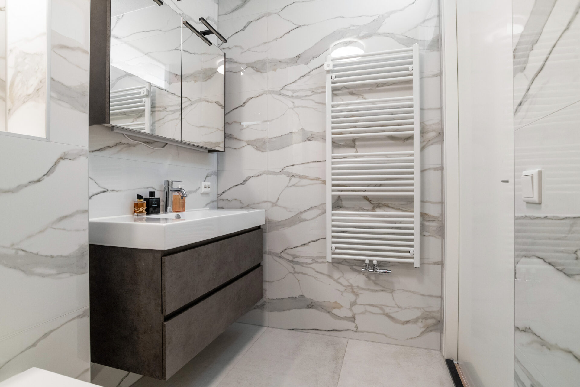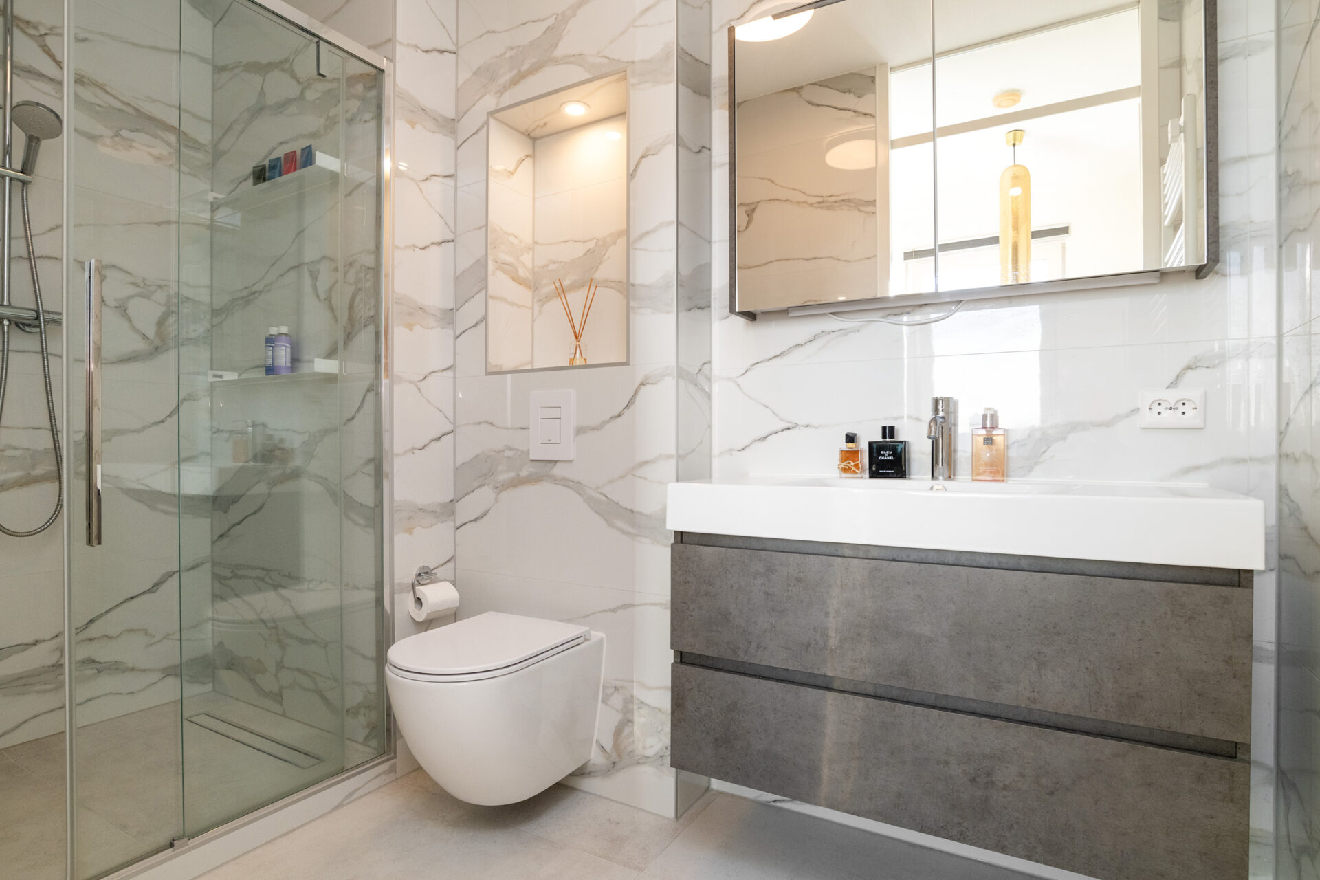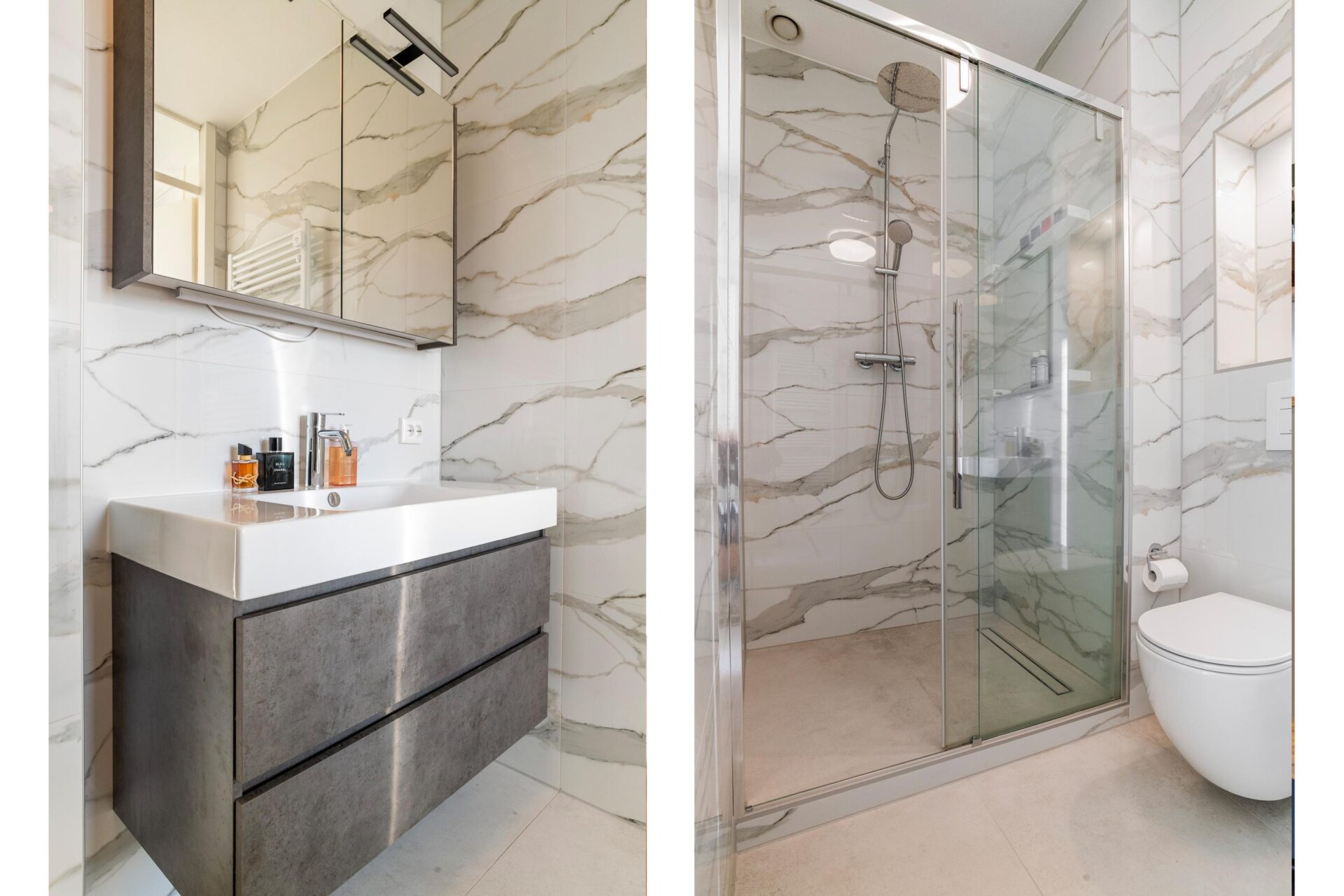 Badkamer: ± 5 m², voorzien van een douche, wastafel met meubel en toilet