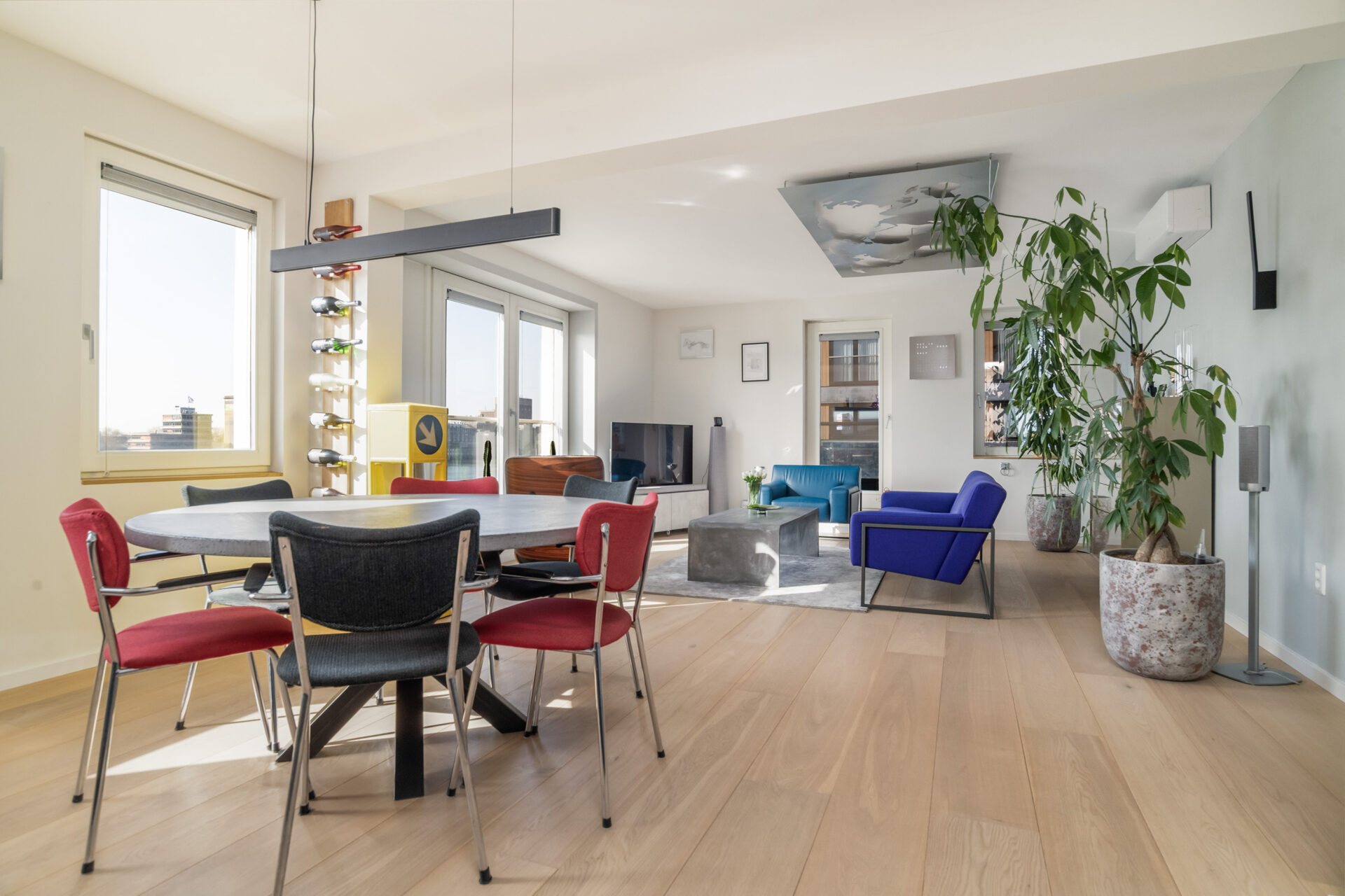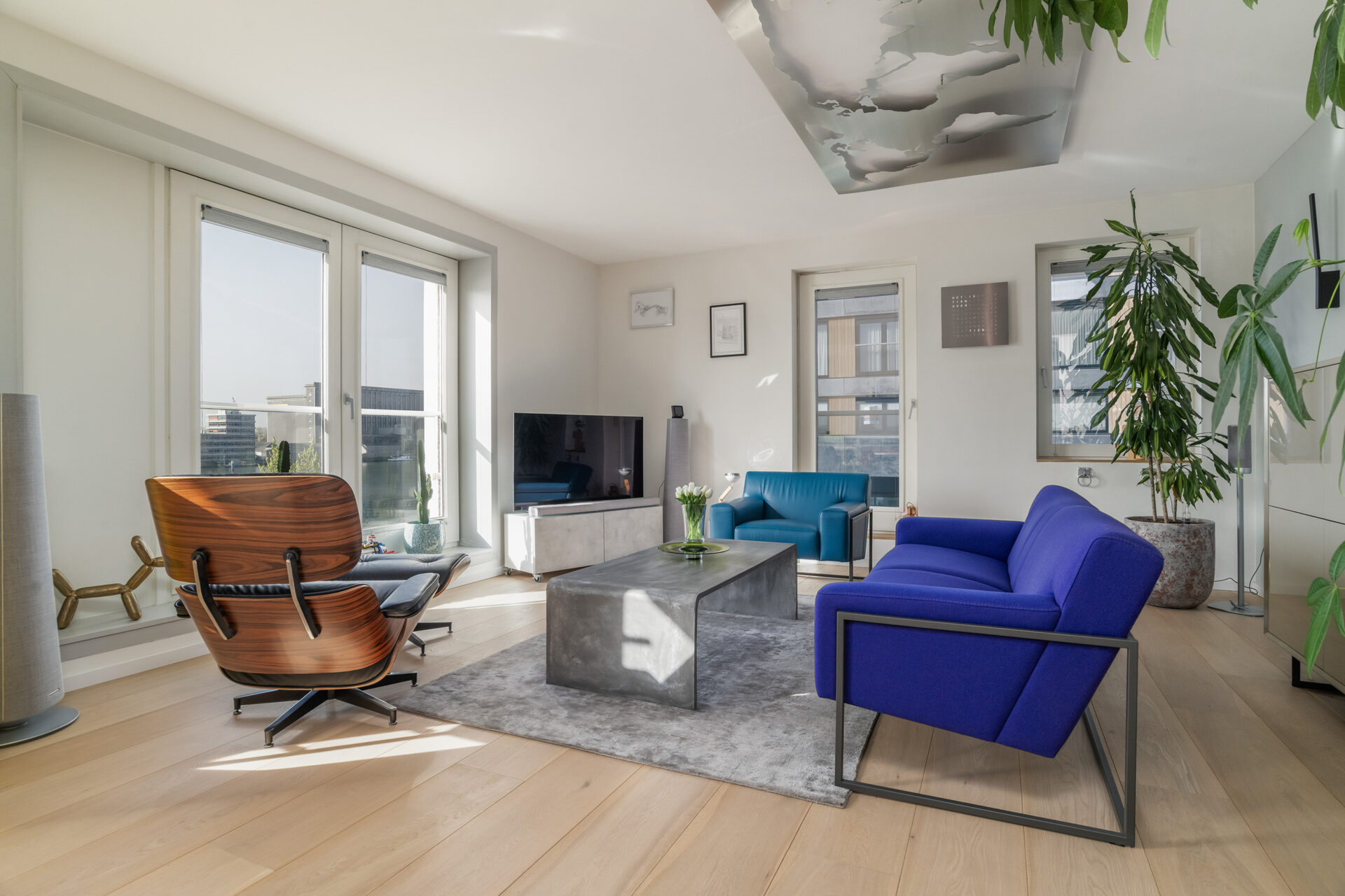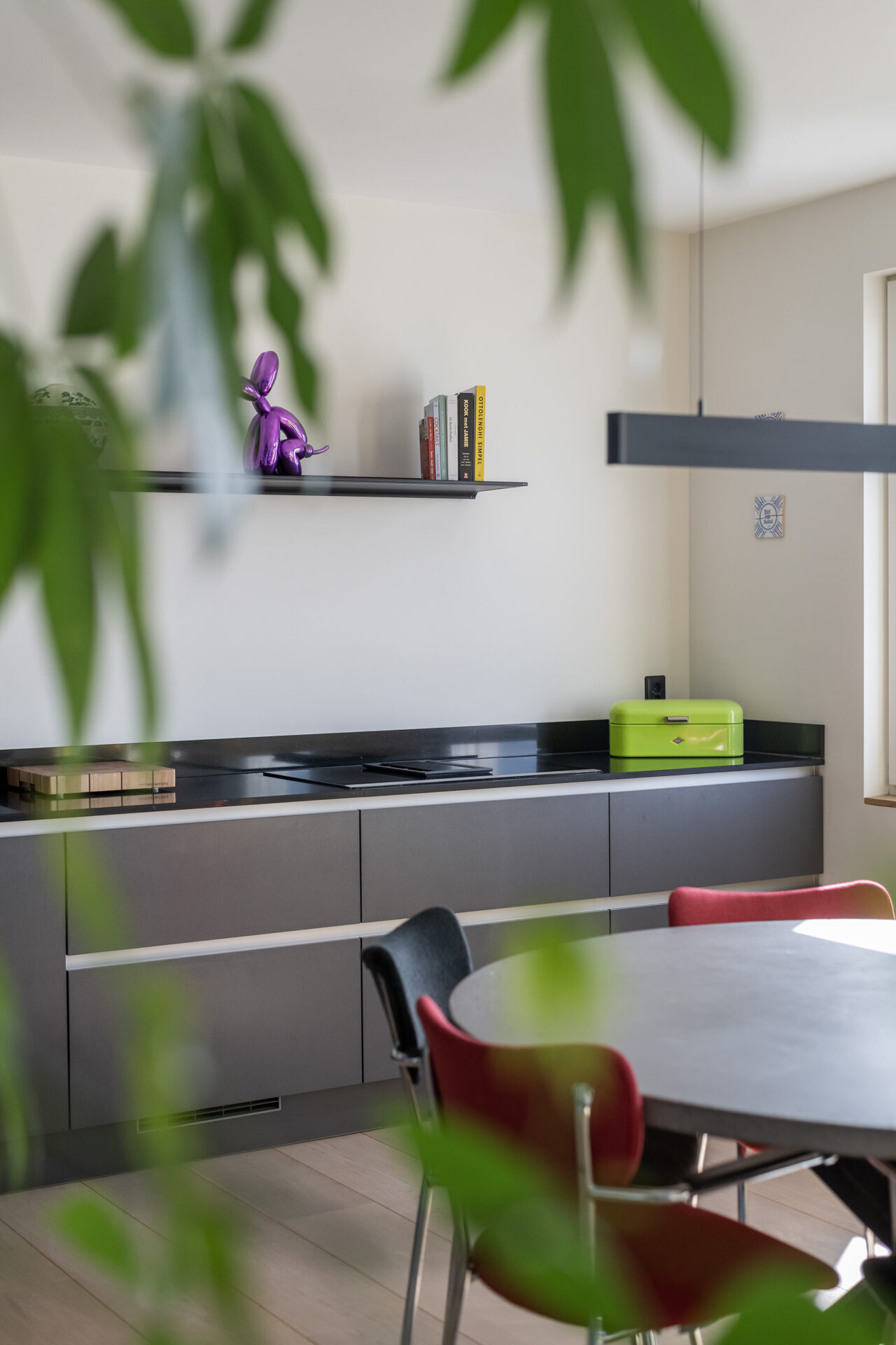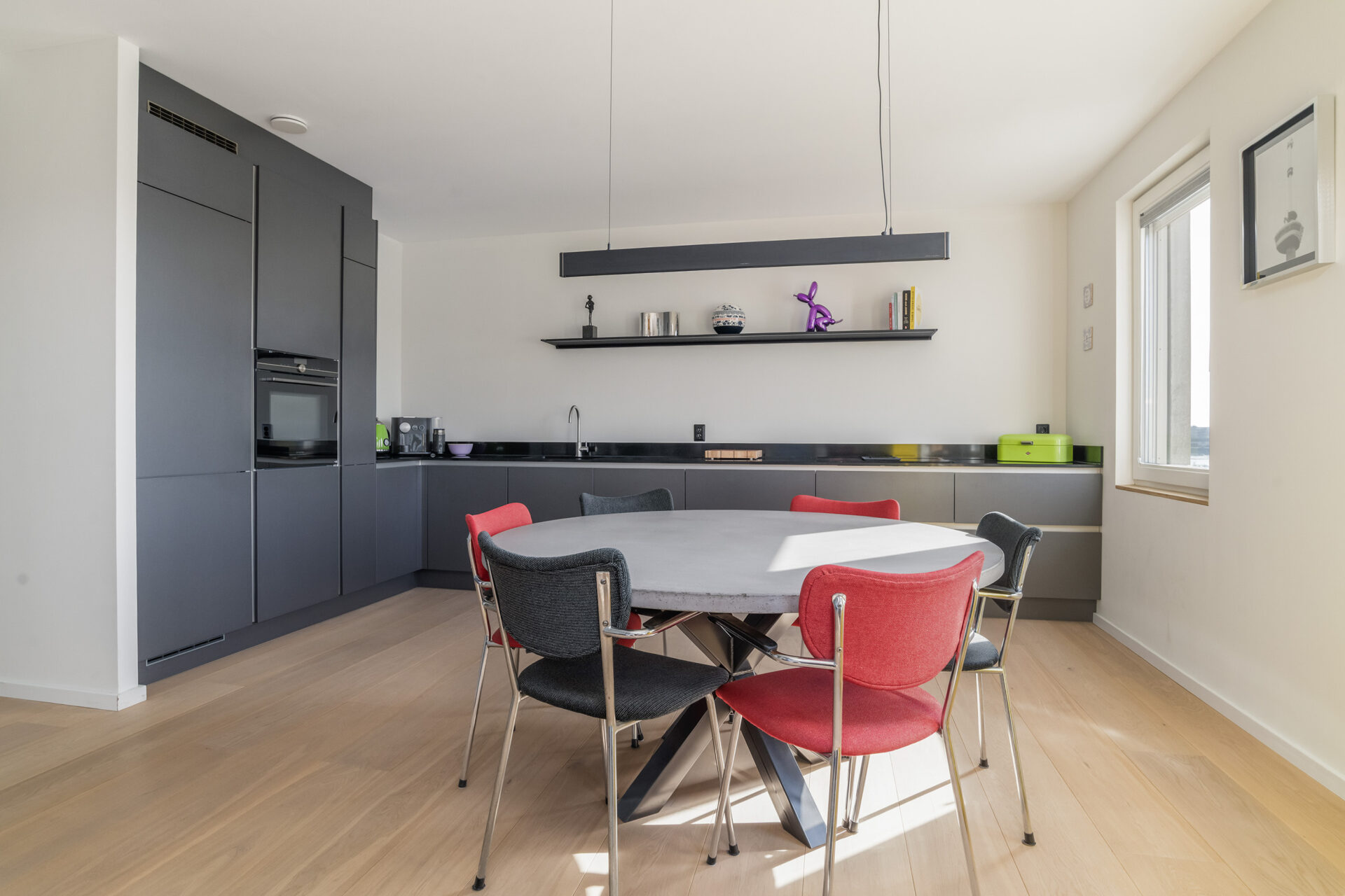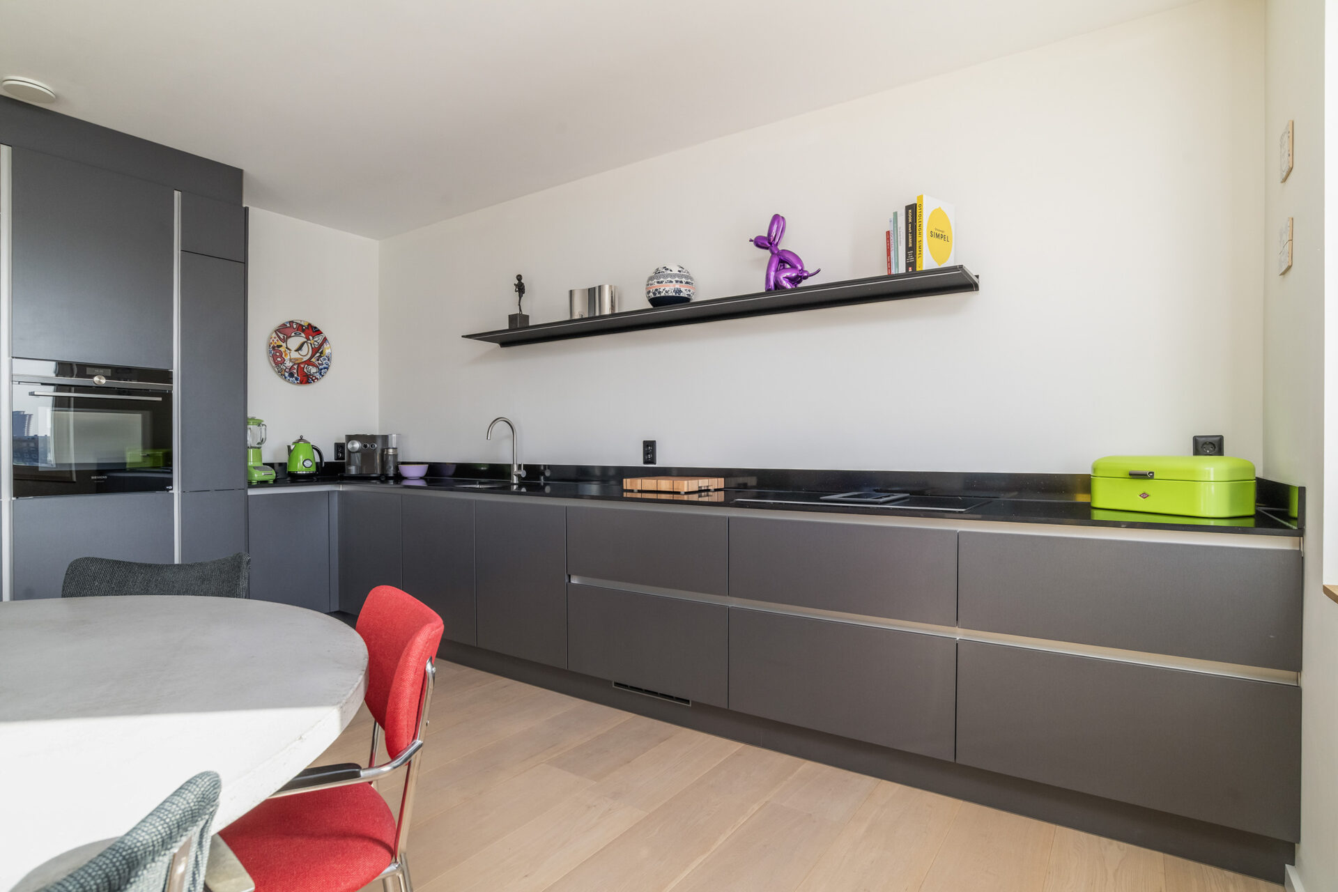 In de woonkamer wordt de aandacht direct getrokken naar het uitzicht op de Maashaven. Hier geniet je de hele dag door van een uitzicht dat nooit stopt en steeds weer verandert. Rotterdamser dan dit wordt wonen in de stad niet. De open, lichte leefruimte met raampartijen aan weerszijden zorgt voor een fijne beleving. Vanaf de bank of je luie stoel geniet je van de voorbijvarende schepen. De luxe greep loze keuken is voorzien van Siemens apparatuur. Het zwarte, composieten werkblad met de antracietkleurige frontjes maken het een strak geheel. Hier bereid je met plezier een maaltijd klaar terwijl je altijd contact behoudt met je gezelschap.
