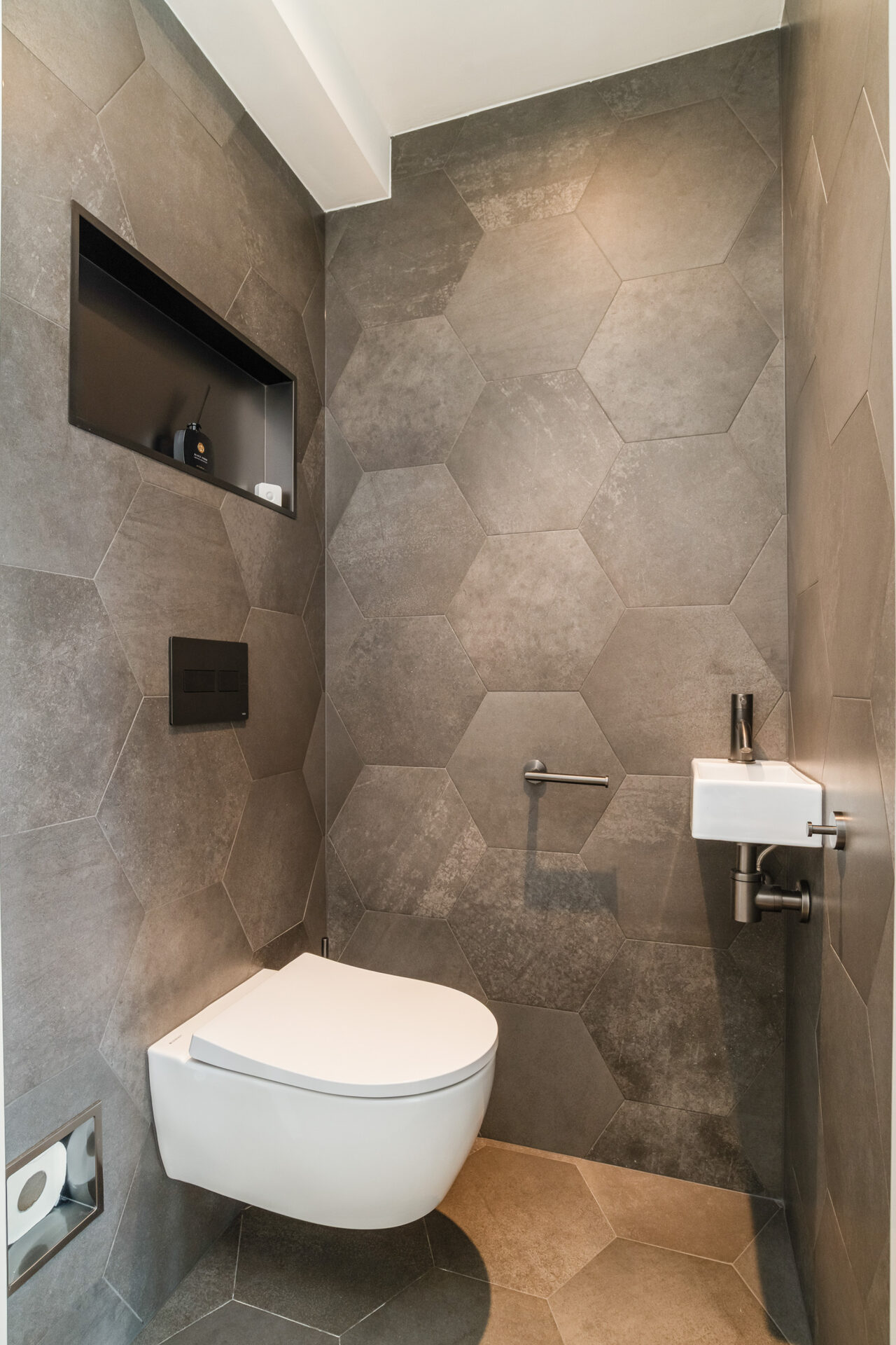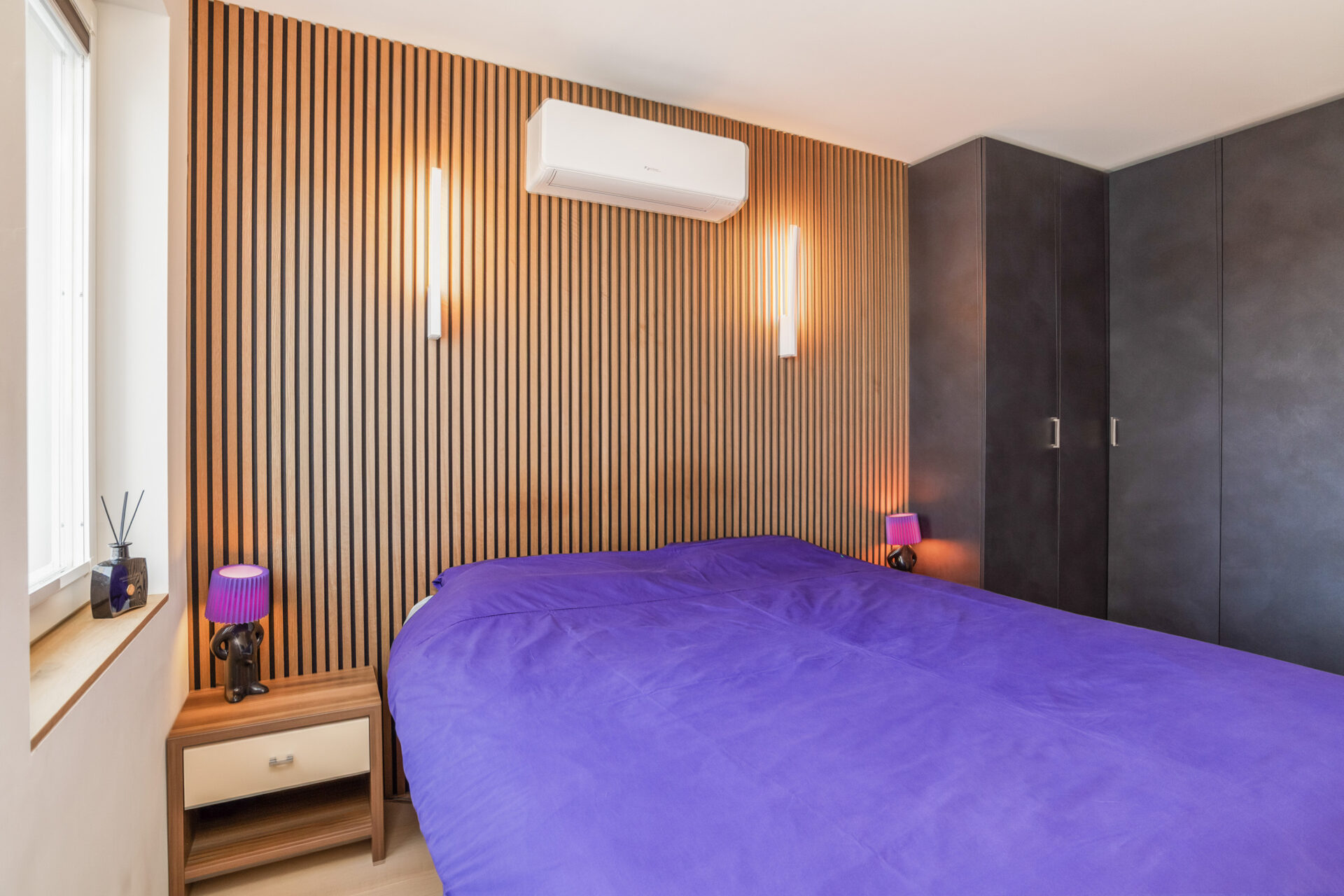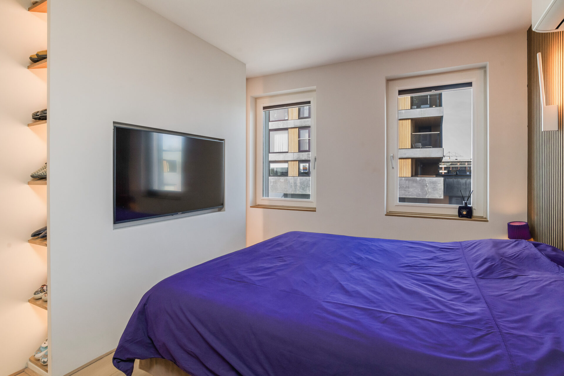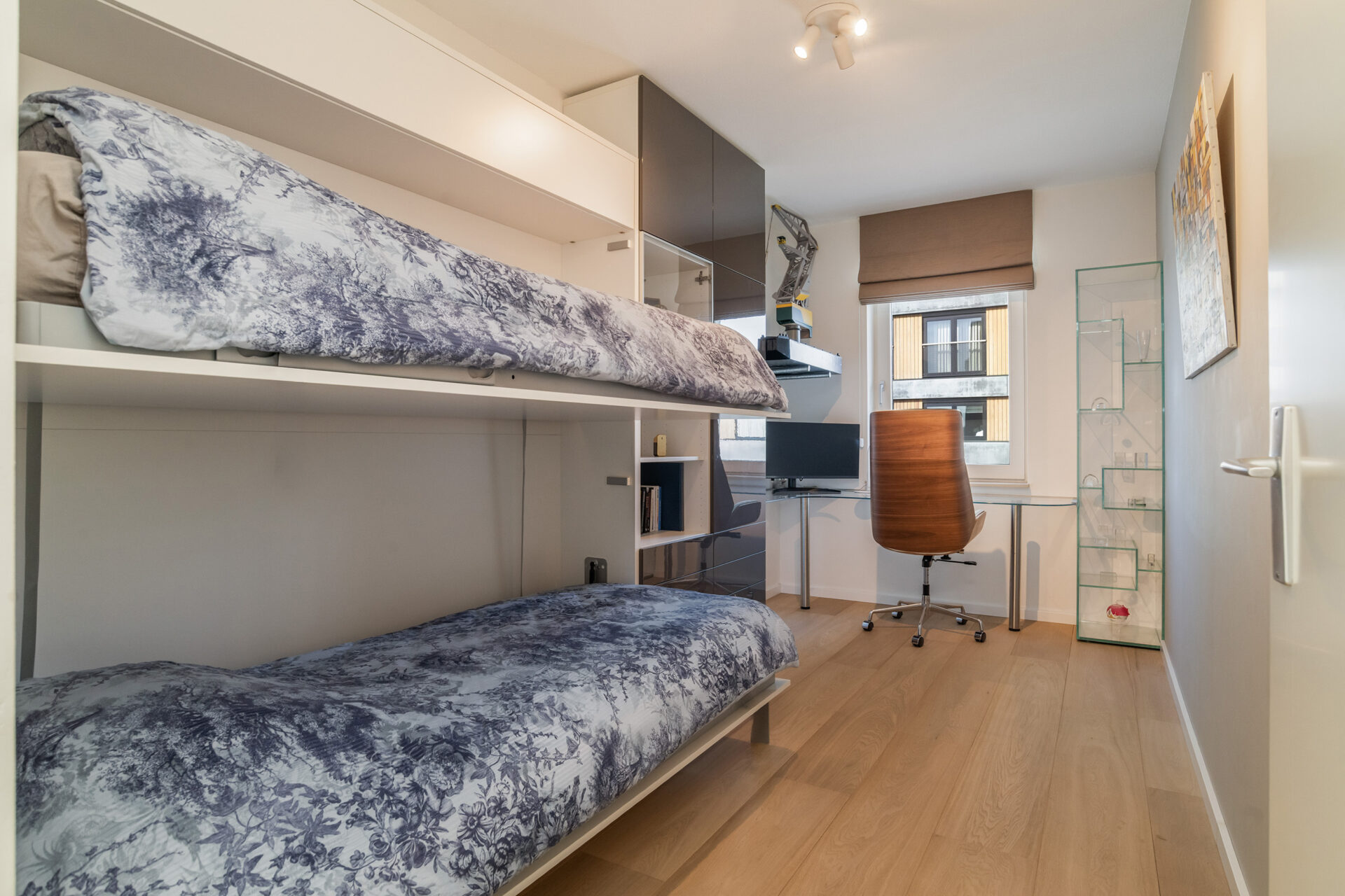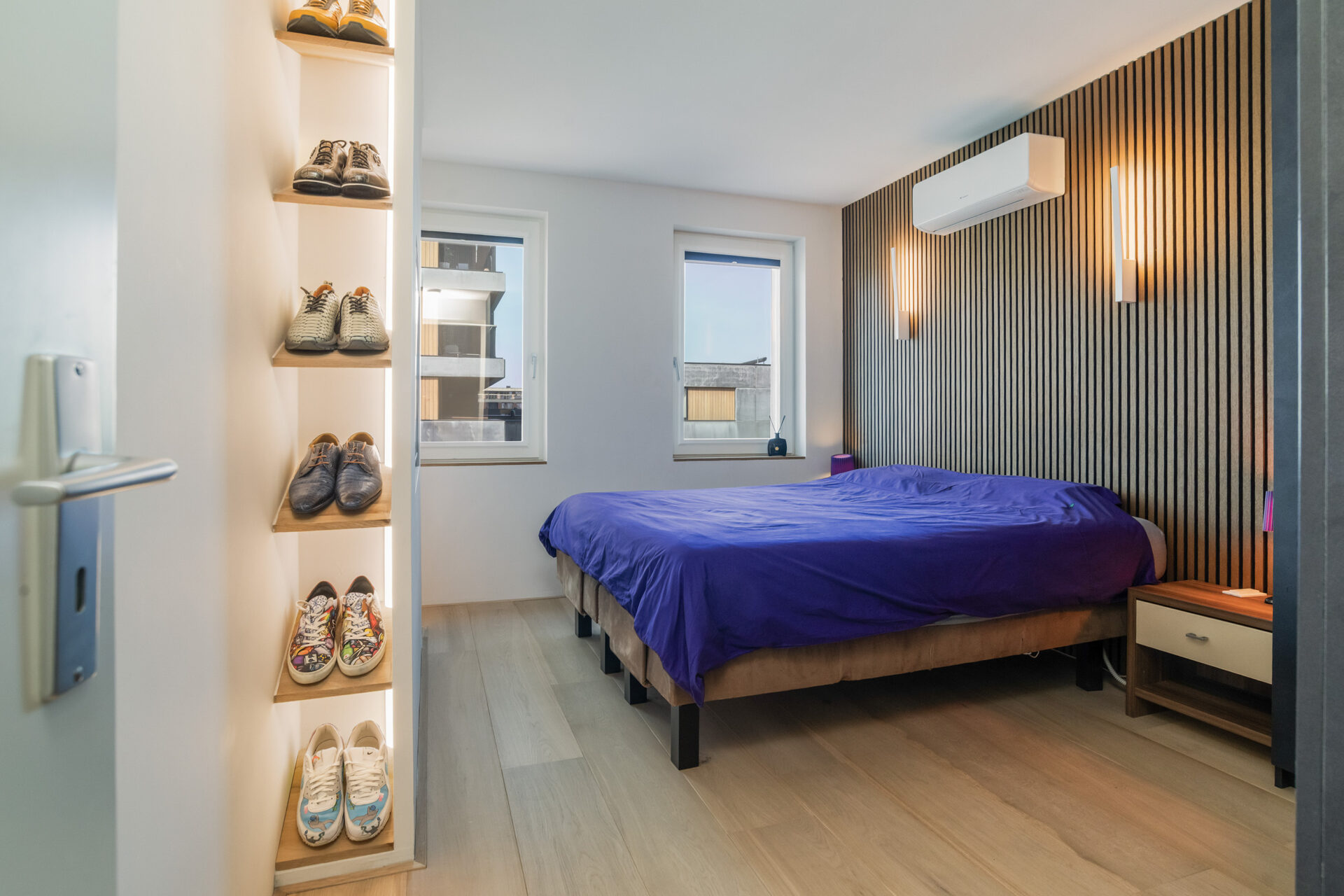 Door naar de slaapkamers, hier zijn er twee van. De masterbedroom is voorzien van een sfeervolle lattenwand en een cinewall met op maat gemaakte kast. De tweede slaapkamer is momenteel in gebruik als werkkamer. Heb jij logees? Dan tover je in een handomdraai een stapelbed tevoorschijn door middel van het openklappen van het op maat gemaakte frame. De badkamer is royaal van formaat en uitgevoerd met grijze Hexagon tegels, net als de toiletruimte, waardoor het naadloos op elkaar aansluit. Door het gehele appartement ligt een mooie houten vloer mét vloerverwarming en zijn tevens de woonkamer en hoofdslaapkamer uitgerust met airconditioning.