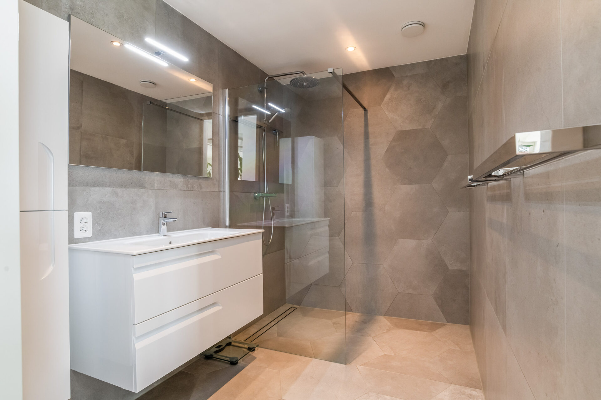 Badkamer: ± 5 m², voorzien van een inloop regendouche, enkele wastafel met meubel
