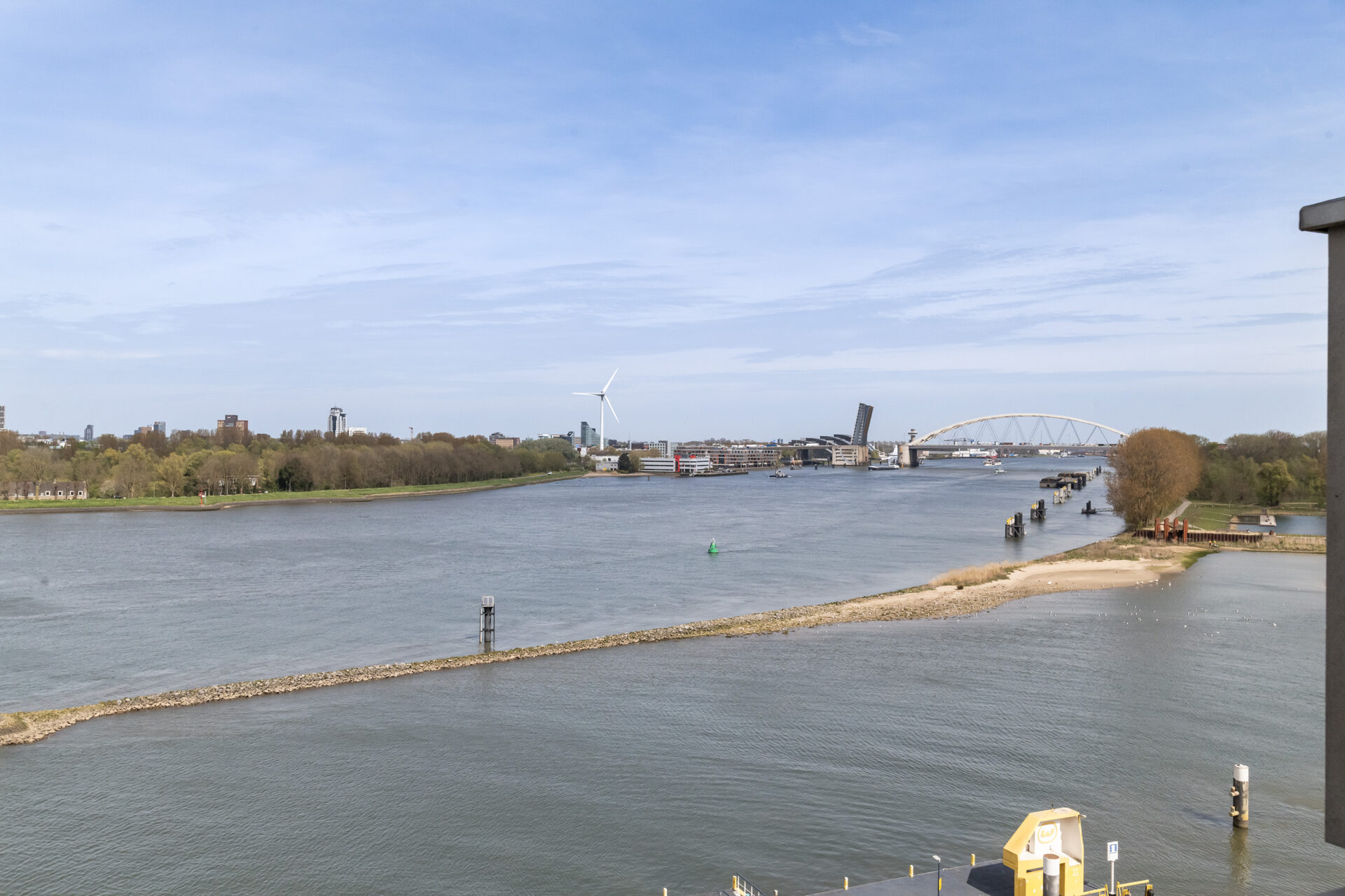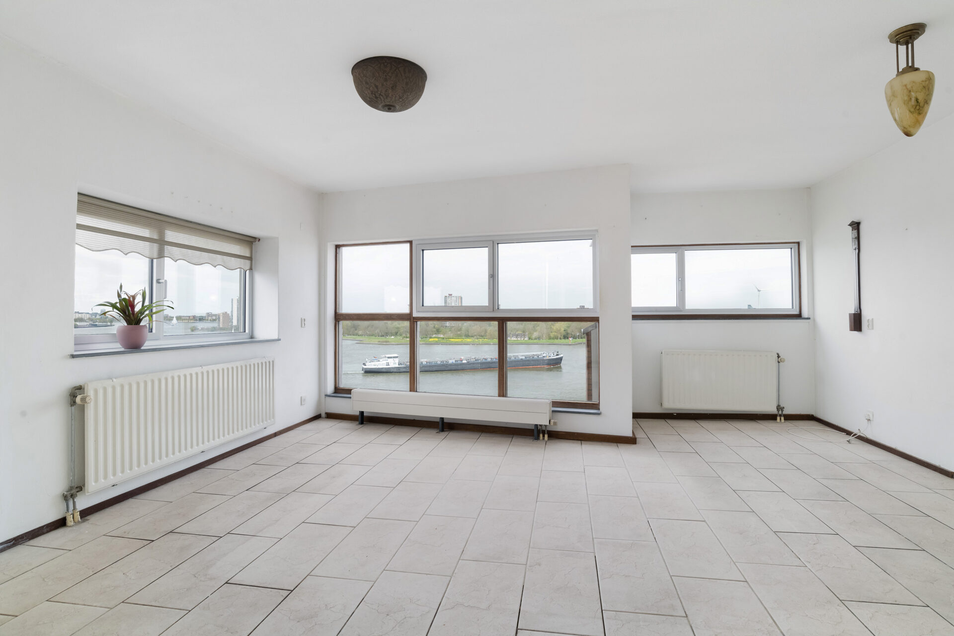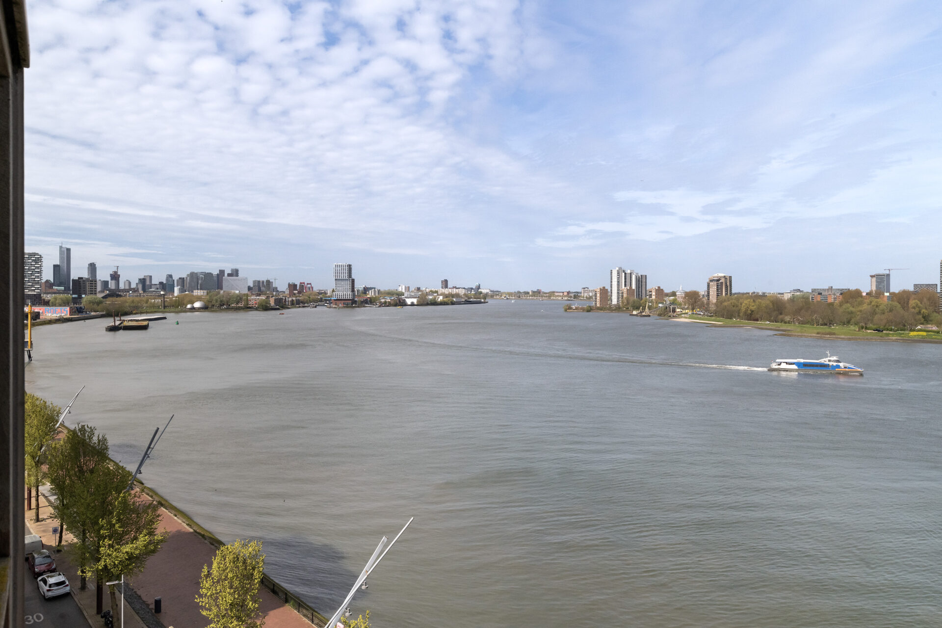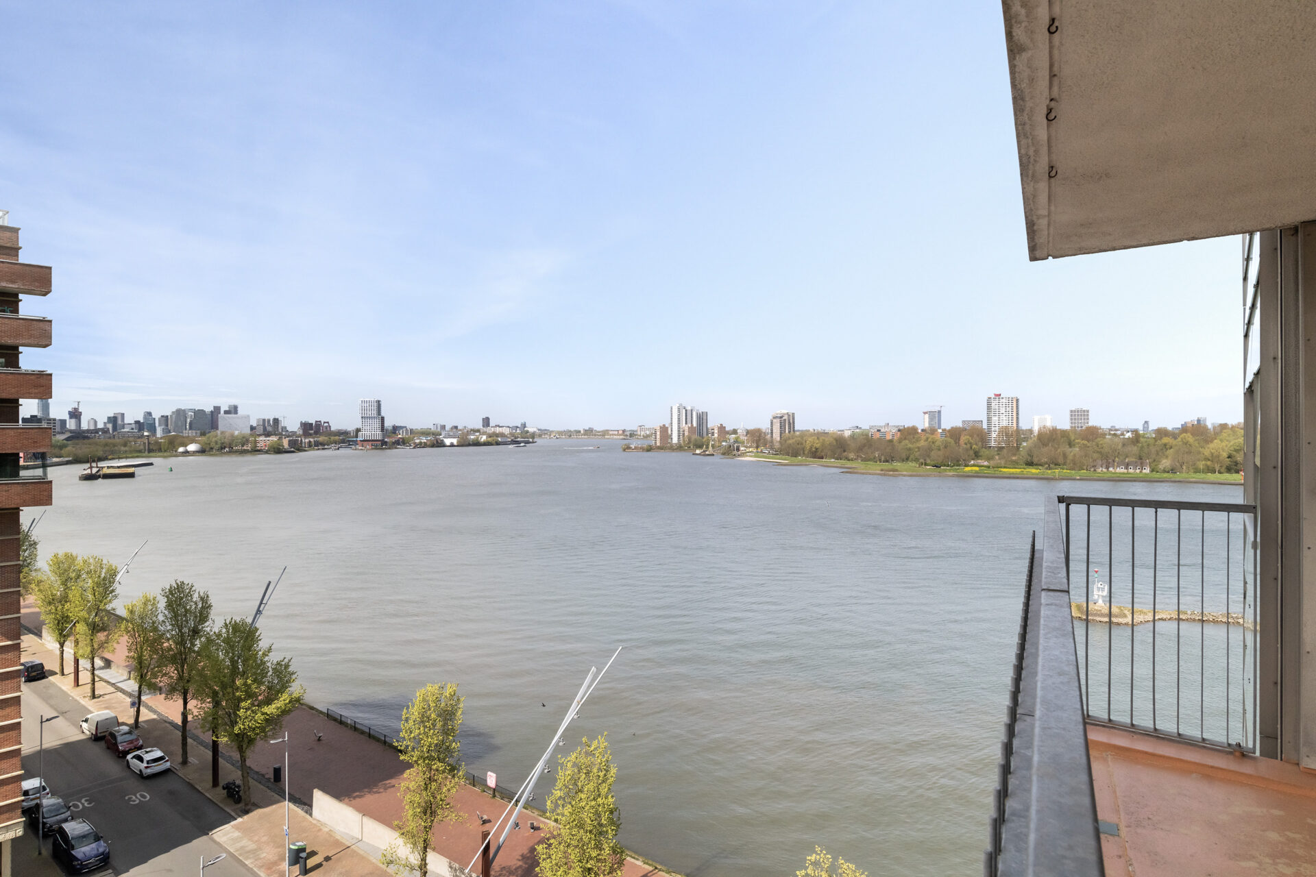De living van circa 34 m² voelt ruim en licht aan dankzij de hoekligging en de extra ramen. Vanuit de woonkamer kijk je uit over de Maas, waar de schepen rustig voorbijvaren en het uitzicht steeds verandert. De keuken staat in open verbinding met de woonkamer, waardoor je tijdens het koken gewoon in contact blijft met je gasten. Loop door naar het balkon en je ervaart direct weer dat fijne uitzicht. Een rustige plek voor je ochtendkoffie of om met een goed boek te zitten. In de avond verschijnen in de verte de lichtjes van de stad, wat zorgt voor een sfeervol einde van de dag.
