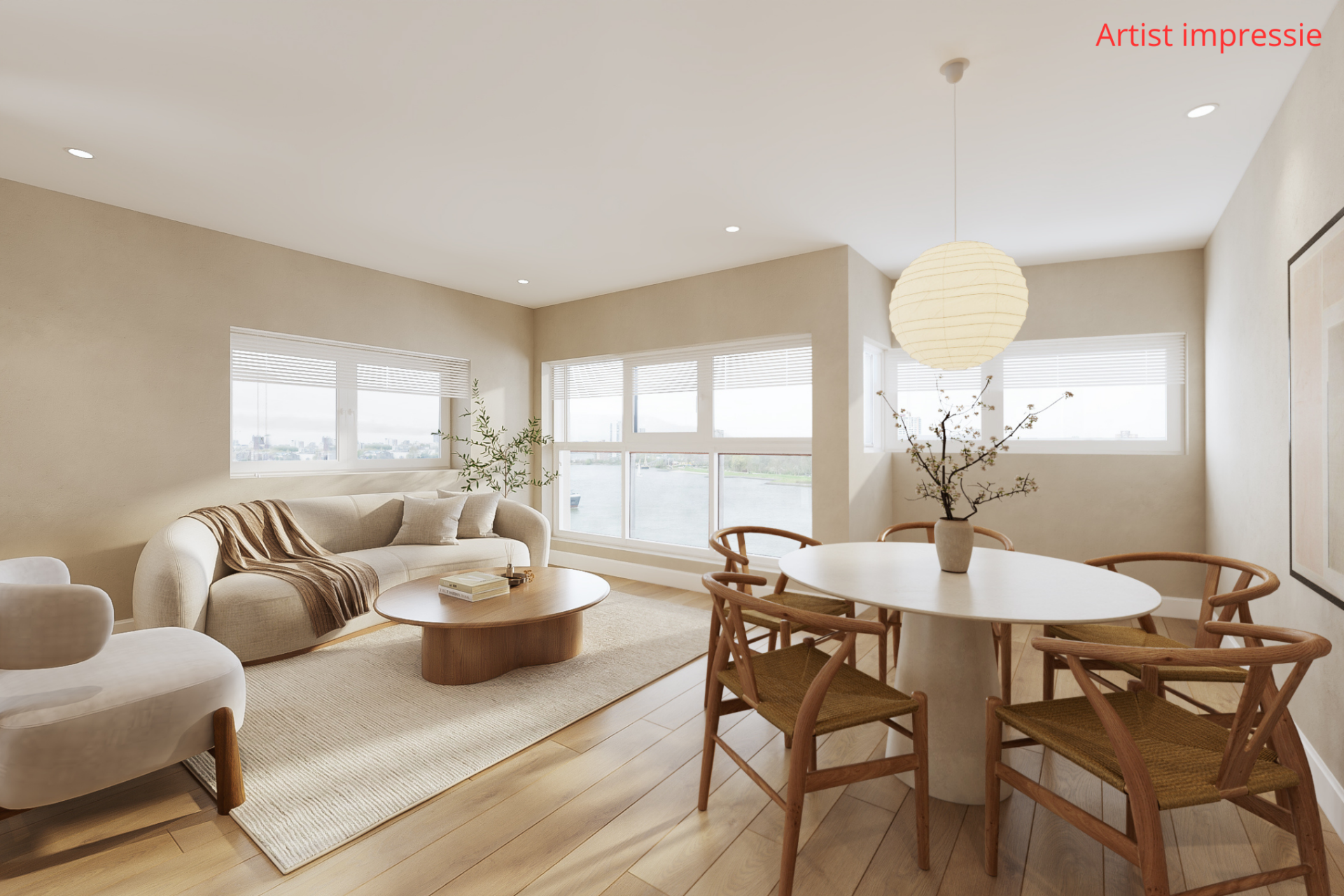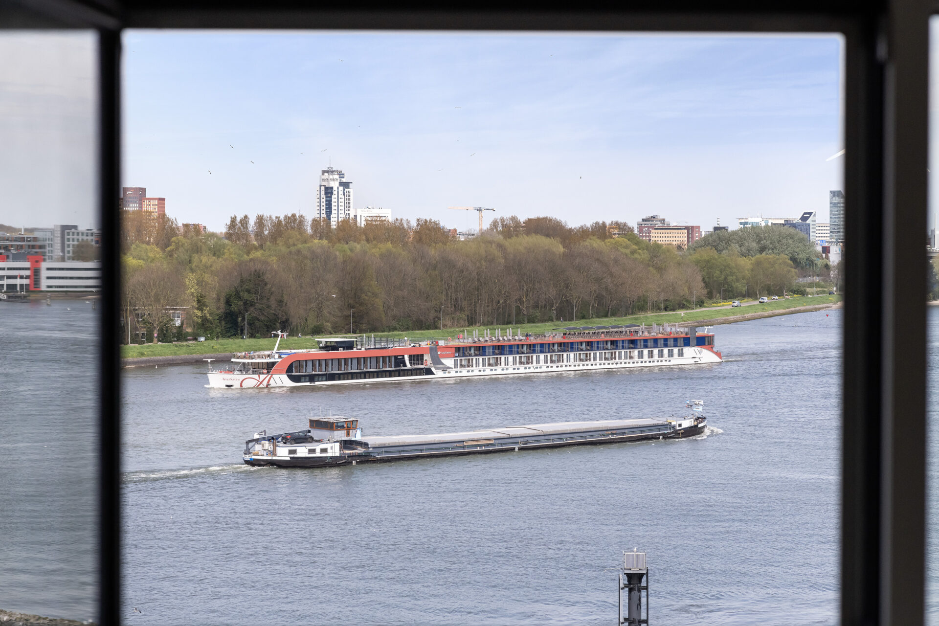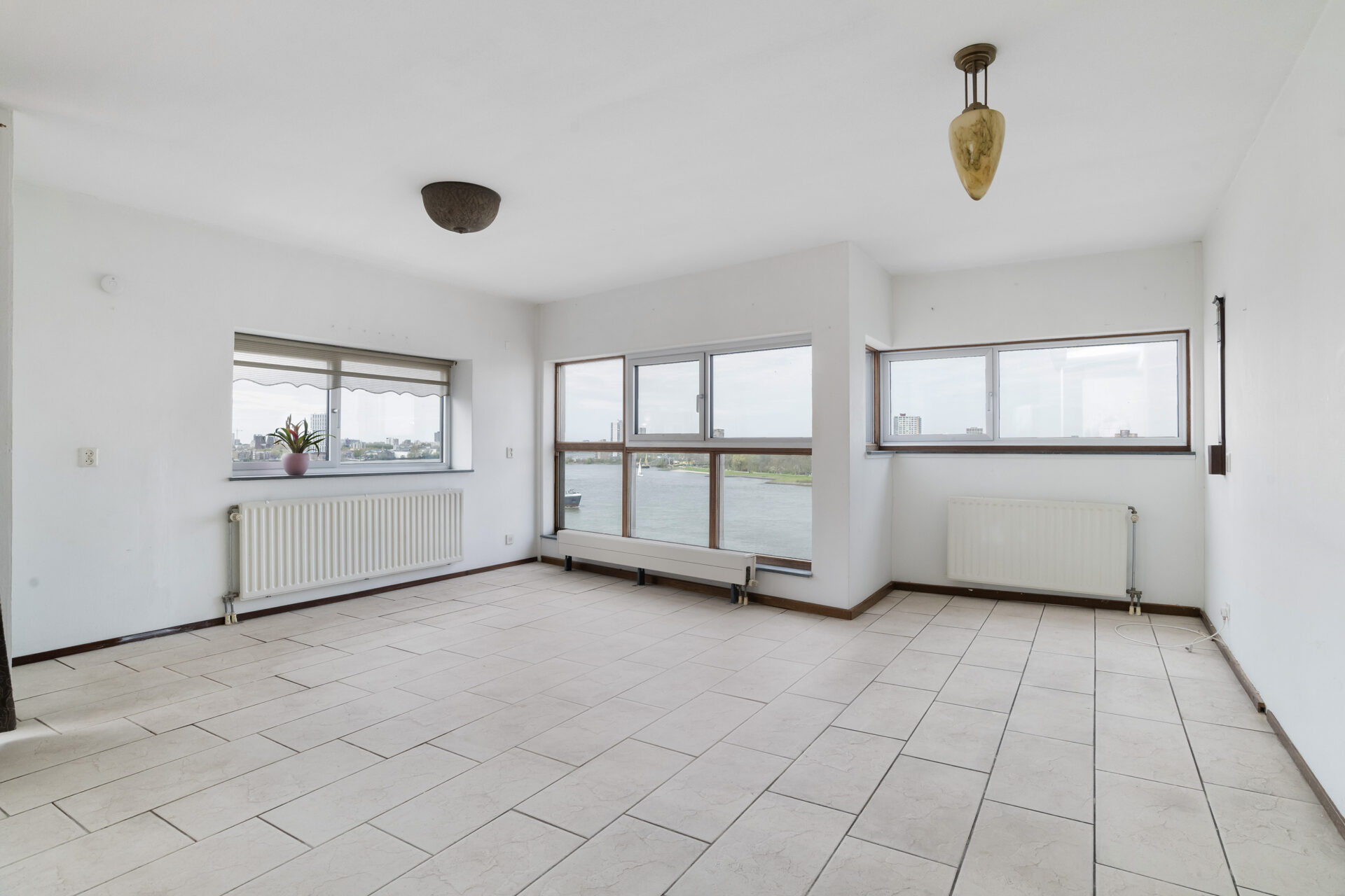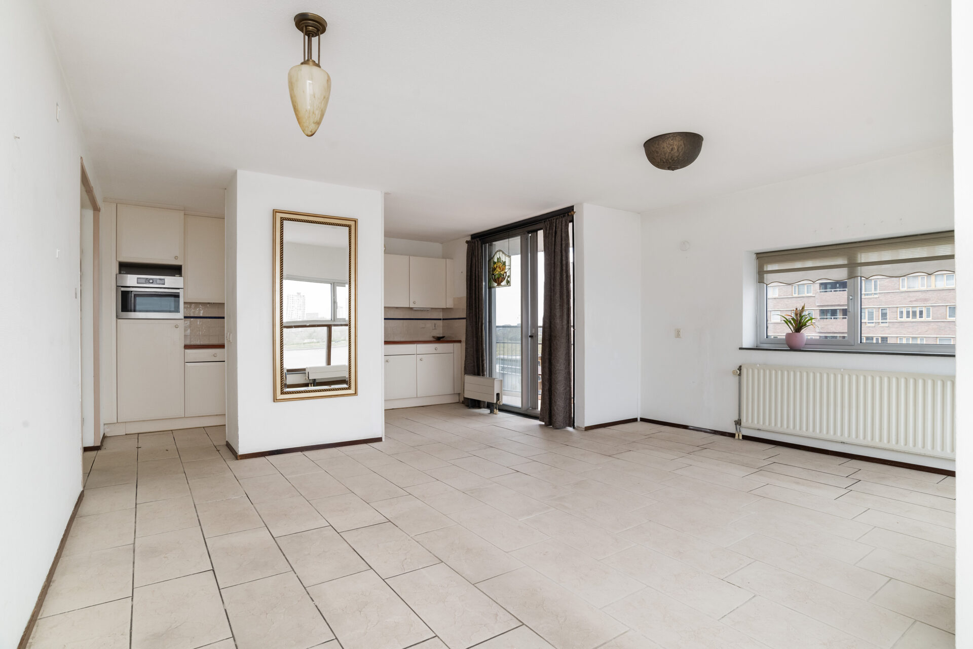 De living van circa 34 m² voelt ruim en licht aan dankzij de hoekligging en de extra ramen. Vanuit de woonkamer kijk je uit over de Maas, waar de schepen rustig voorbijvaren en het uitzicht steeds verandert. De keuken staat in open verbinding met de woonkamer, waardoor je tijdens het koken gewoon in contact blijft met je gasten. Loop door naar het balkon en je ervaart direct weer dat fijne uitzicht. Een rustige plek voor je ochtendkoffie of om met een goed boek te zitten. In de avond verschijnen in de verte de lichtjes van de stad, wat zorgt voor een sfeervol einde van de dag.