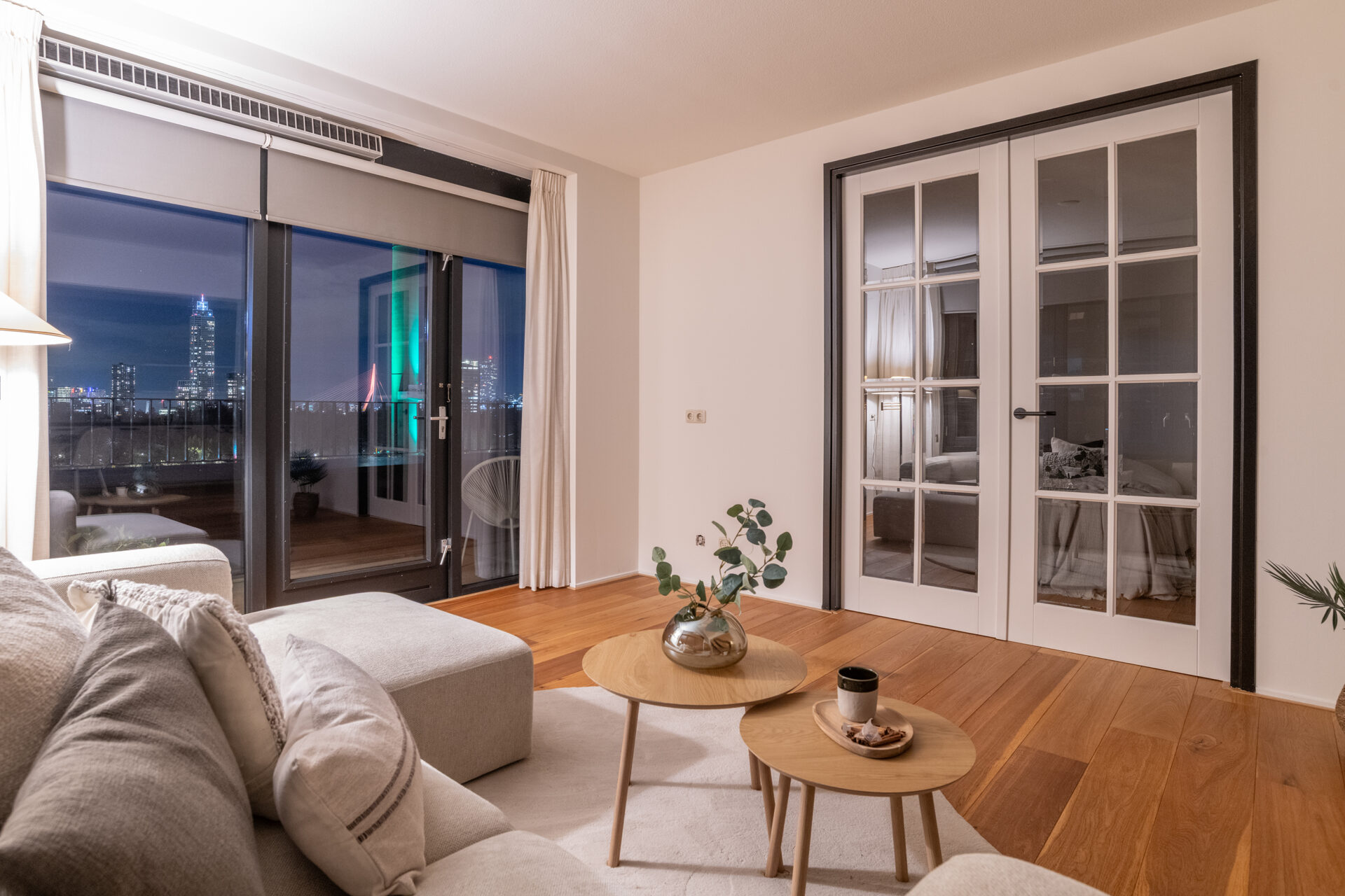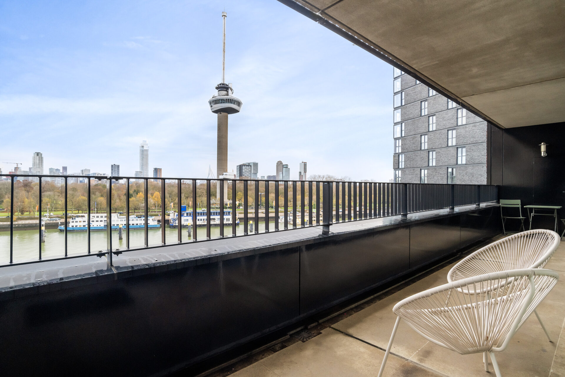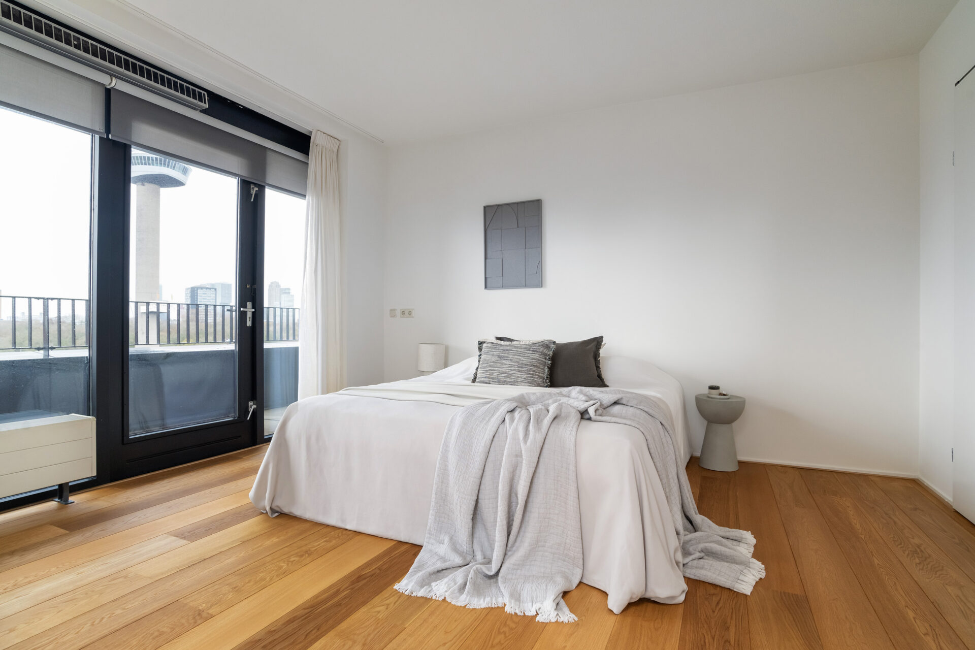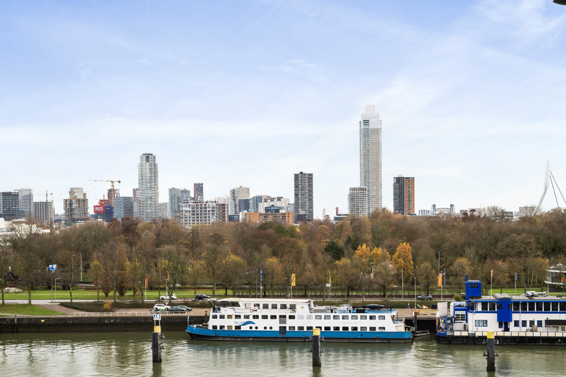 De living is een zee van licht dankzij de vele ramen. Aan de Parkhaven zijde kijk je uit op de iconen van Rotterdam: de Euromast, de Erasmusbrug, de Laurenskerk, de Hef, de Willemsbrug en de Wilhelminapier. Aan de Westzeedijkzijde strekt het uitzicht zich uit over Delfshaven richting de Nieuwe Waterweg: de vaarroute van de cruiseschepen langs de horizon. Er is genoeg ruimte om je creativiteit los te laten op de inrichting. De open keuken sluit daar perfect op aan: strak, modern en compleet uitgerust met alles wat je nodig hebt. De woning is recent volledig geschilderd en de houten vloer is volledig behandeld, waardoor alles er fris en verzorgd uitziet.