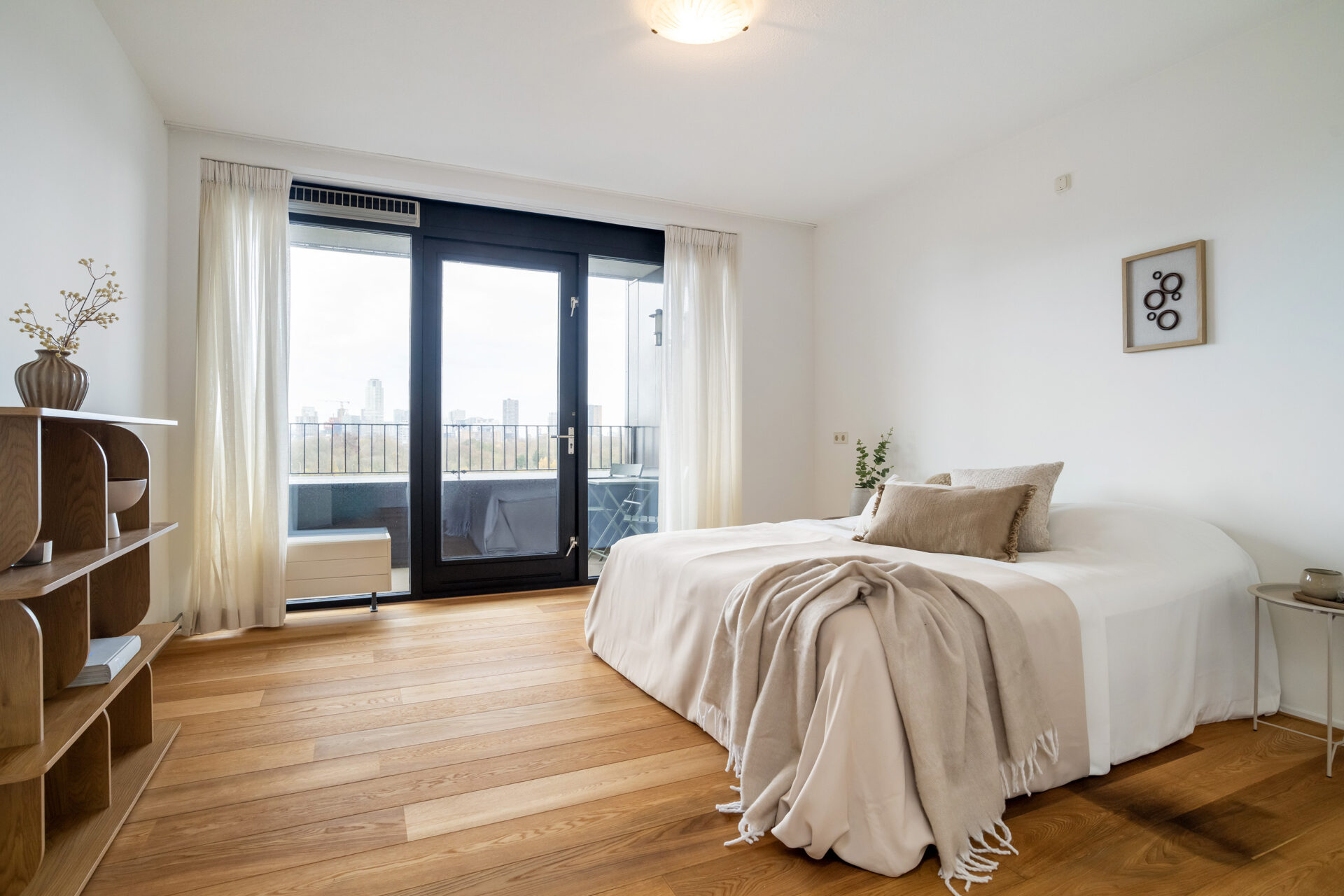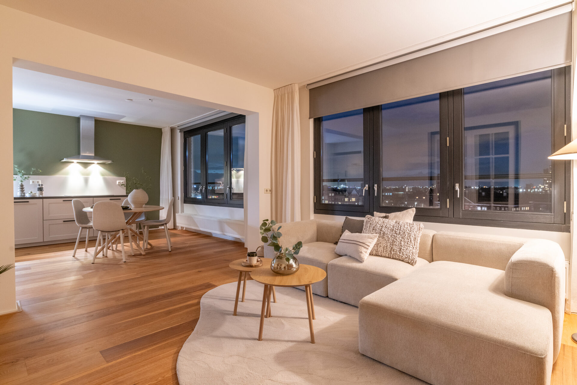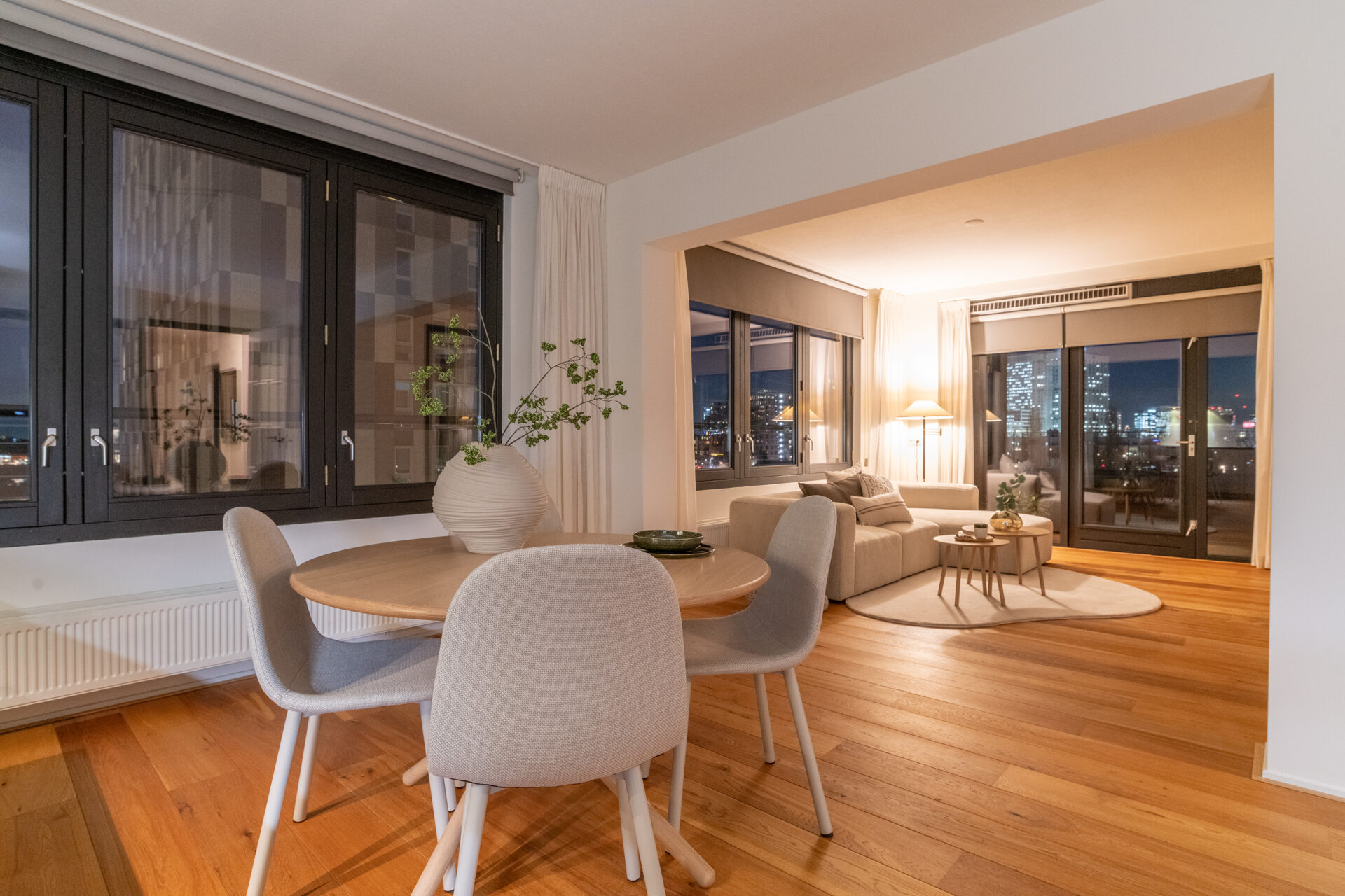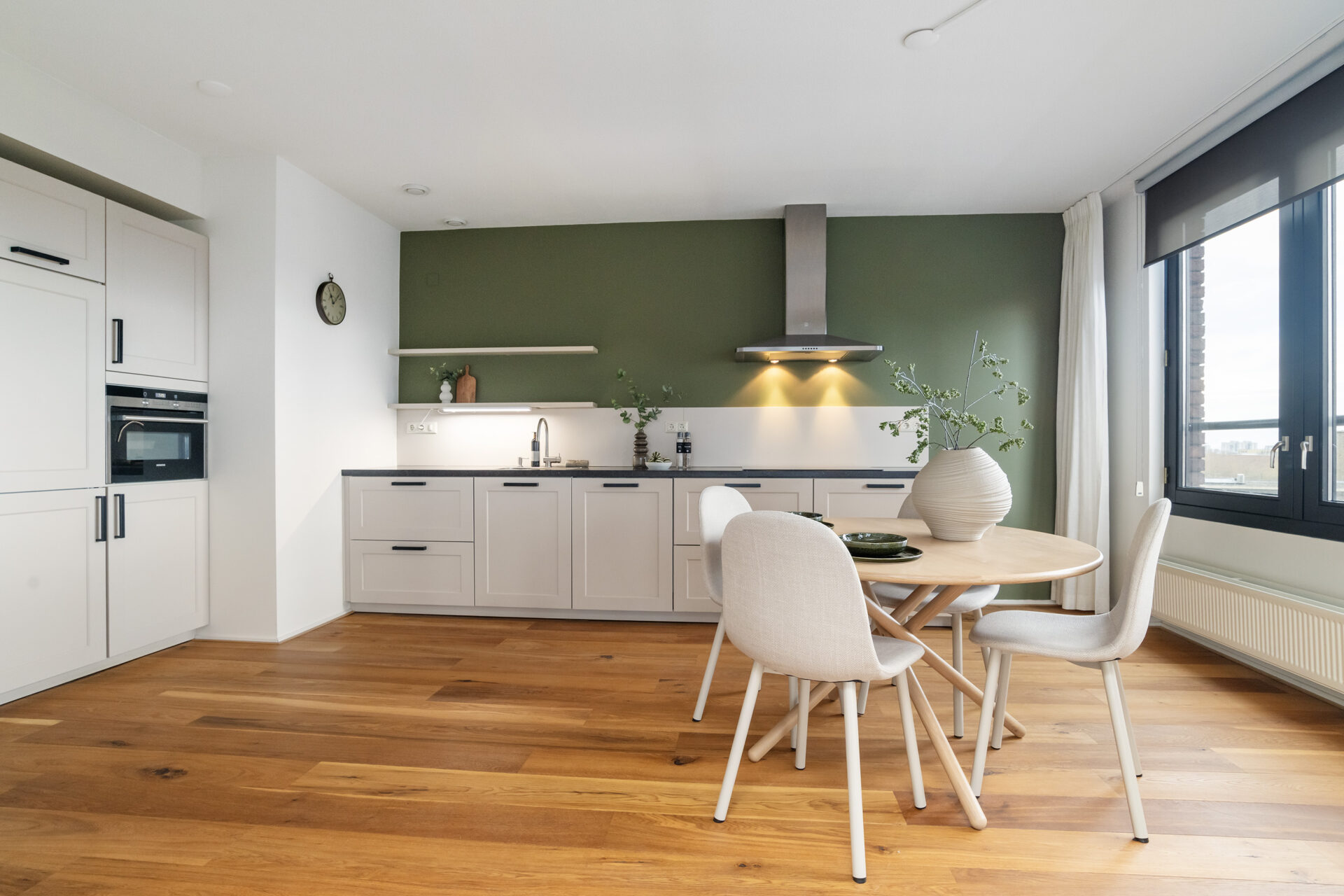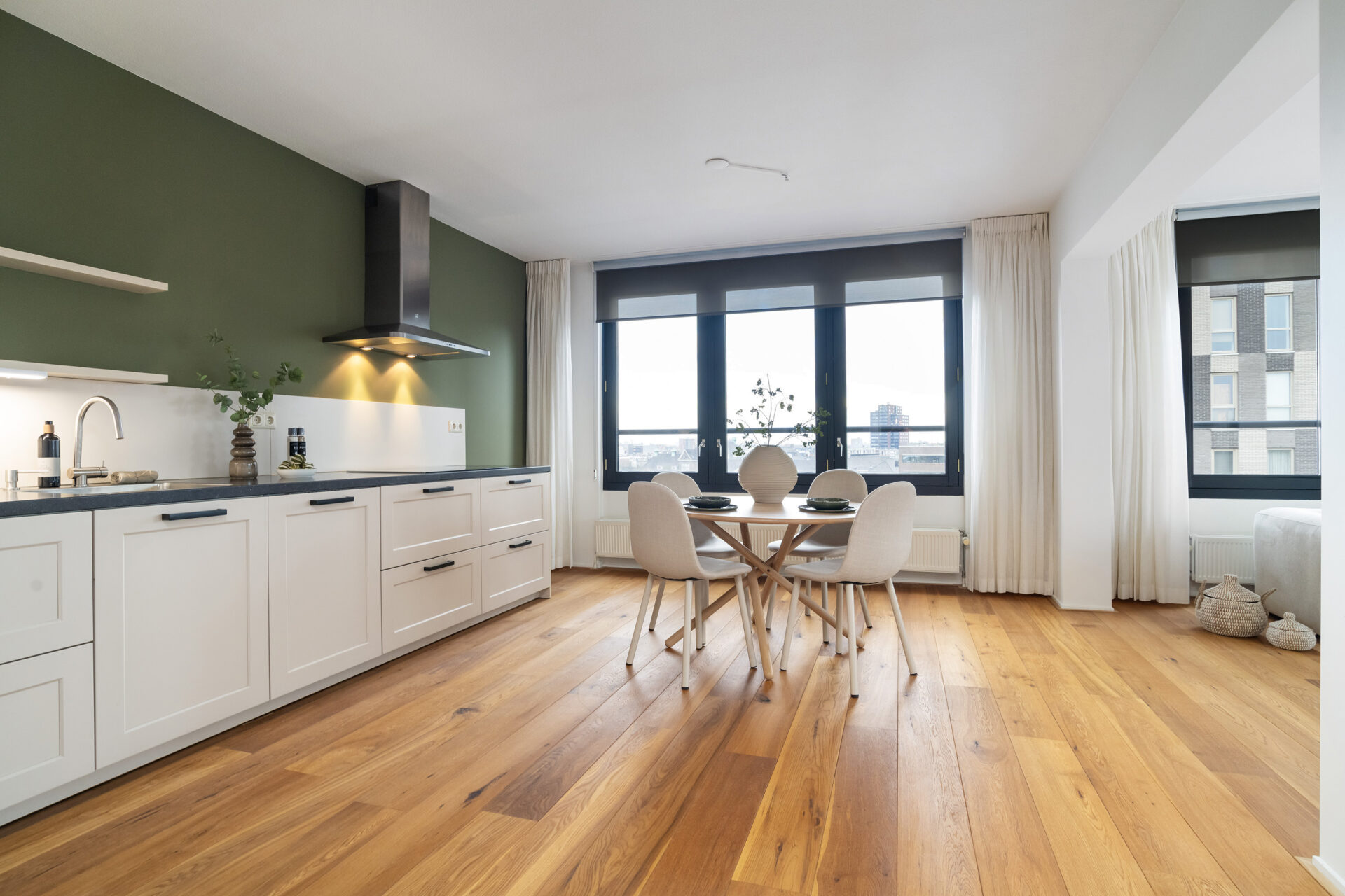 De living is een zee van licht dankzij de vele ramen. Aan de Parkhaven zijde kijk je uit op de iconen van Rotterdam: de Euromast, de Erasmusbrug, de Laurenskerk, de Hef, de Willemsbrug en de Wilhelminapier. Aan de Westzeedijkzijde strekt het uitzicht zich uit over Delfshaven richting de Nieuwe Waterweg: de vaarroute van de cruiseschepen langs de horizon. Er is genoeg ruimte om je creativiteit los te laten op de inrichting. De open keuken sluit daar perfect op aan: strak, modern en compleet uitgerust met alles wat je nodig hebt. De woning is recent volledig geschilderd en de houten vloer is volledig behandeld, waardoor alles er fris en verzorgd uitziet.