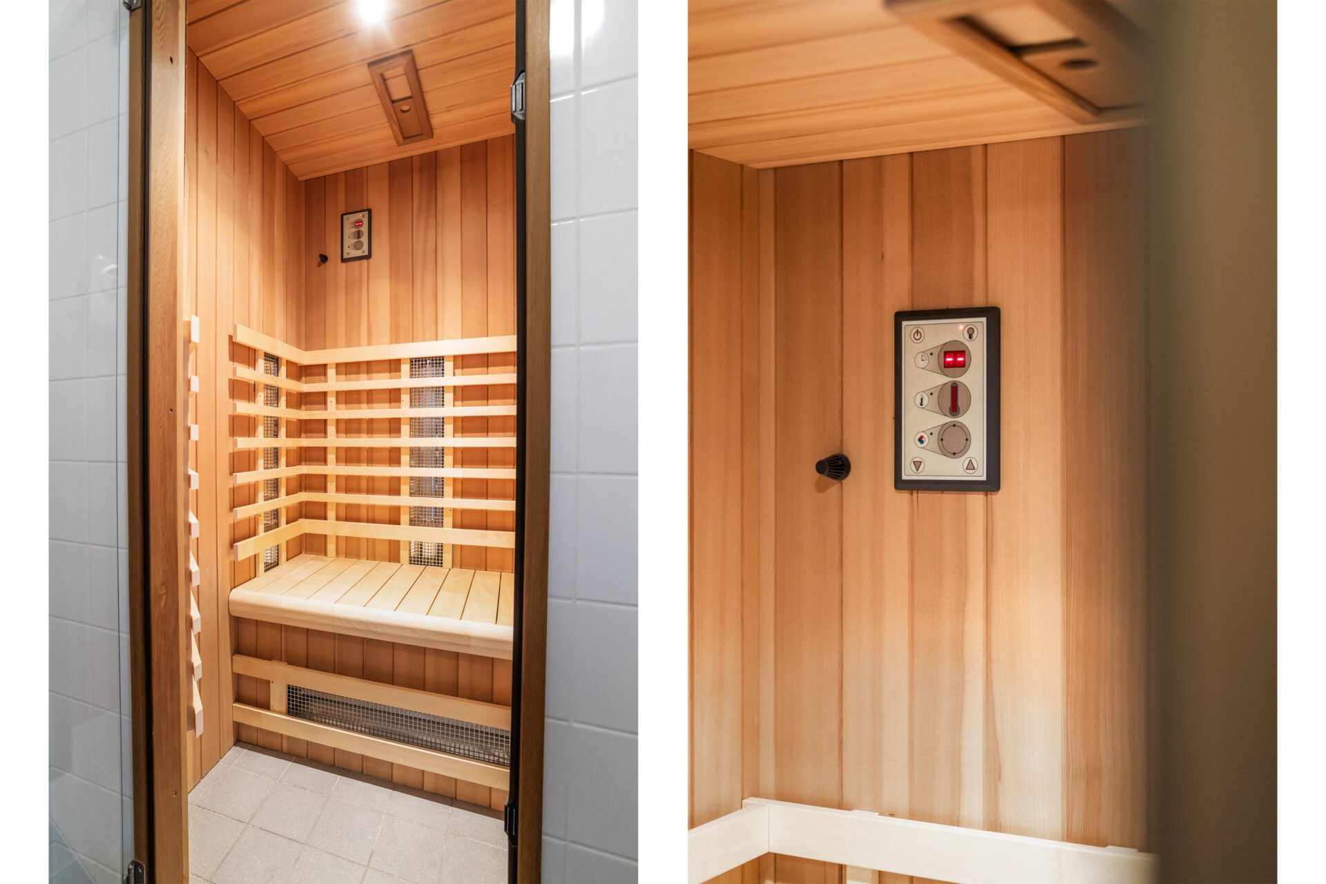 Badkamer: ± 6 m², voorzien van een douchecabine, wastafel met meubel, losse handdoeken kast, toilet en infraroodsauna