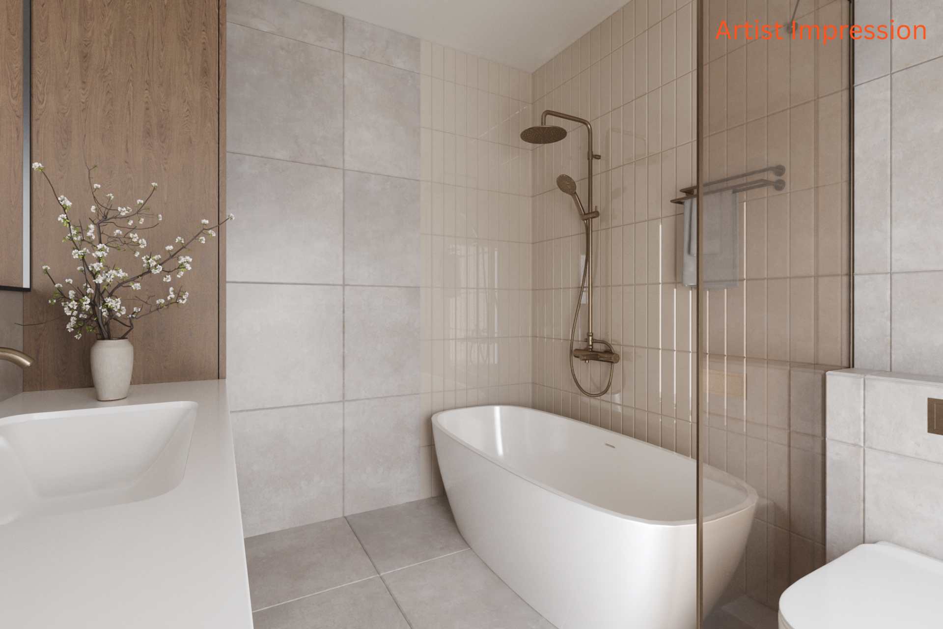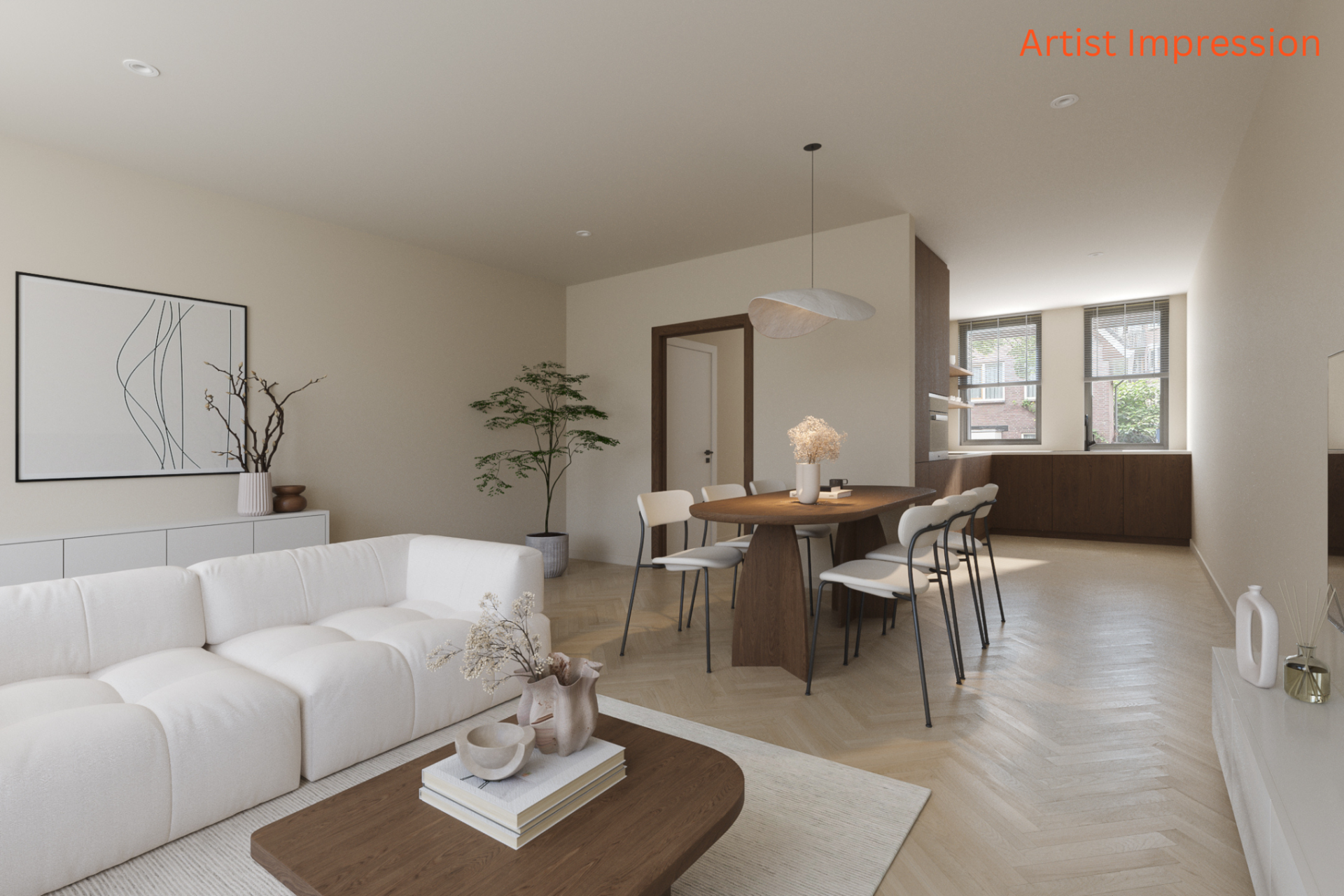 De woonkamer is heerlijk licht en geeft directe toegang tot de achtertuin, een oase van rust omringd door groen. De tuin is perfect voor een zomerse borrel of een ontspannen dag in de zon. Terug binnen vind je de open keuken: strak, modern en voorzien van alles wat je nodig hebt. Door het hele appartement zijn de muren strak gestuct en op de begane grond geniet je van warme voeten, dankzij de vloerverwarming.