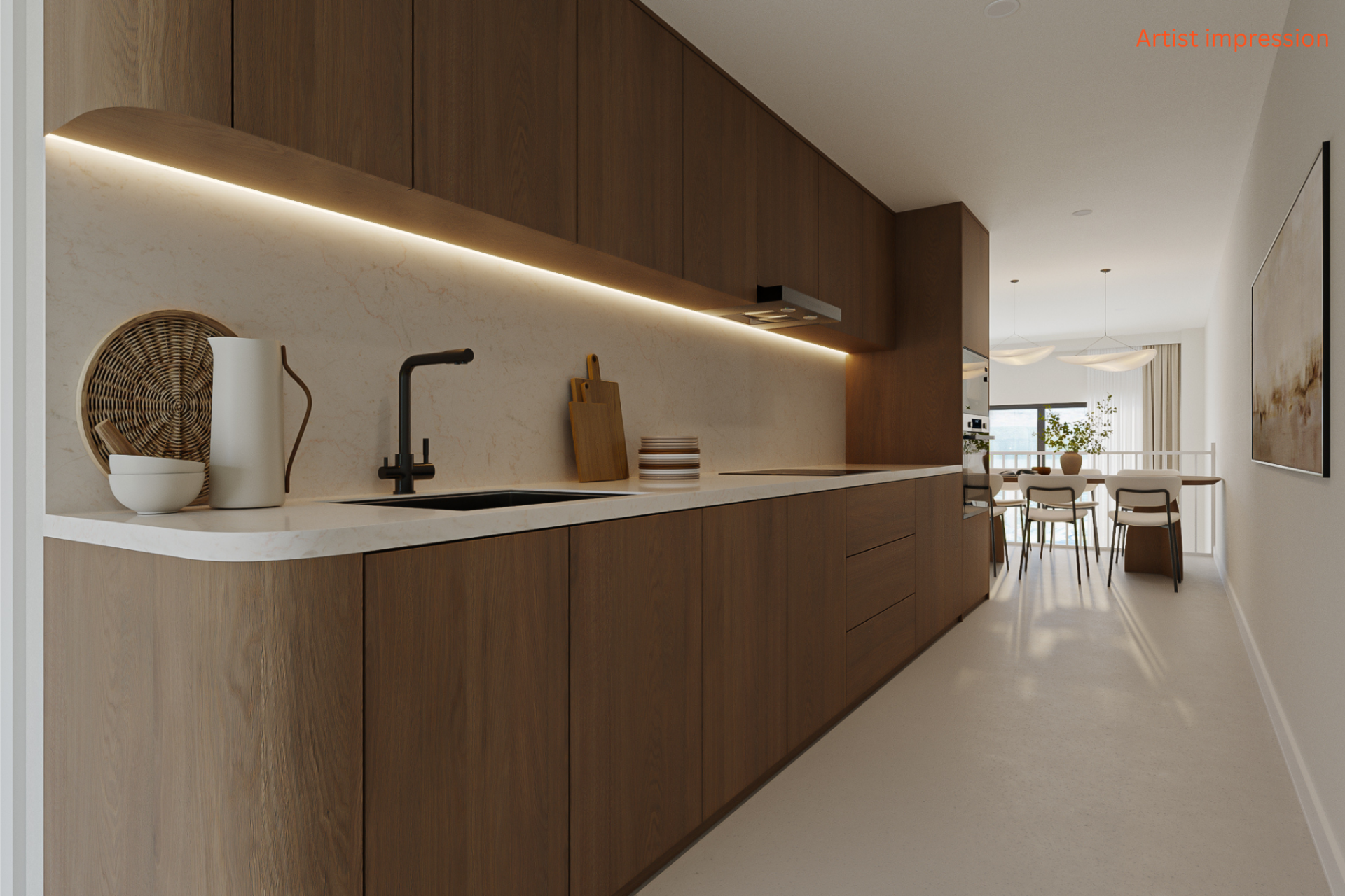 Halfopen keuken: ± 8 m² voorzien van diverse inbouwapparatuur t.w. 5- pits inductie kookplaat, afzuigkap, koelkast met vriesvak, vaatwasser, oven en kastruimte