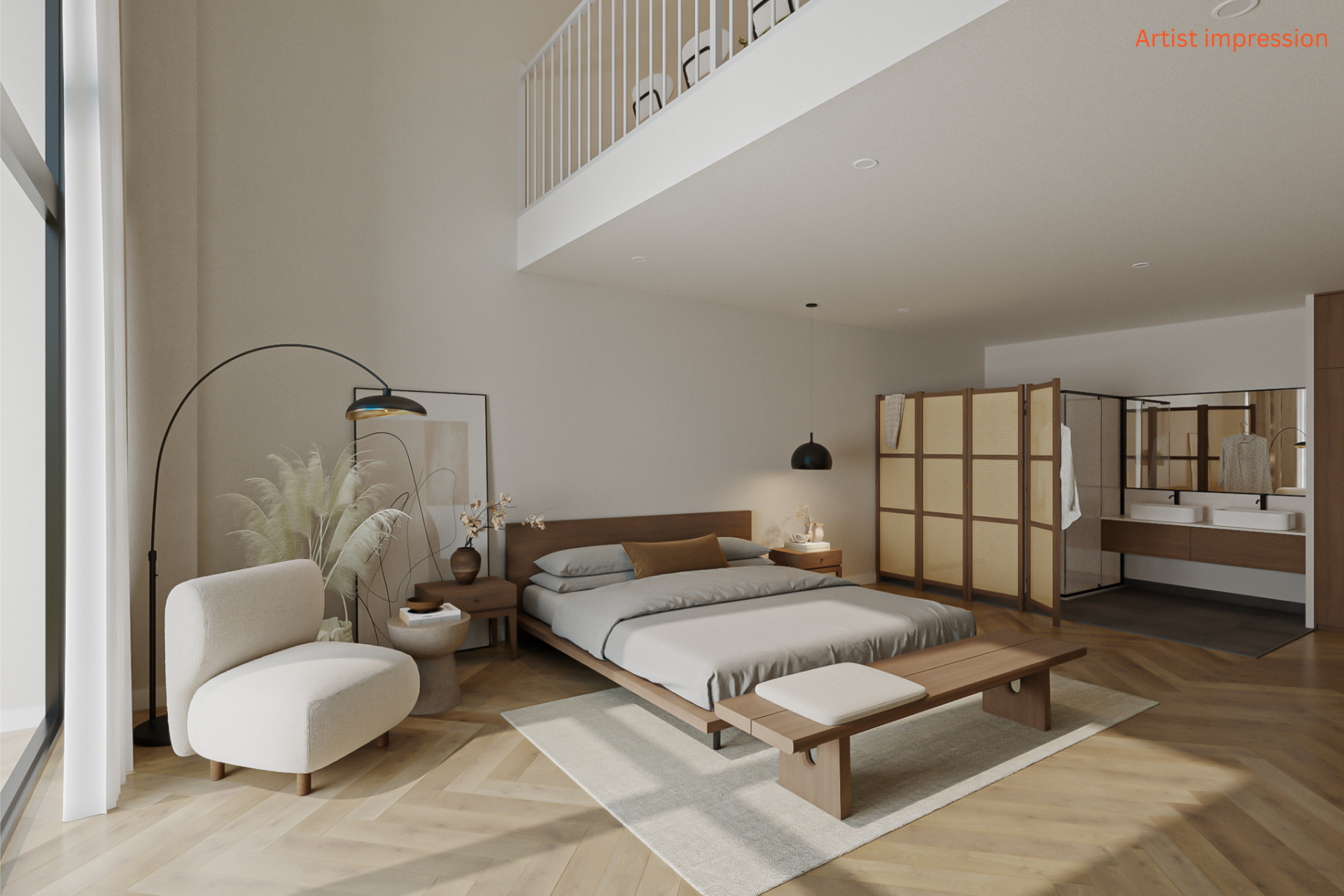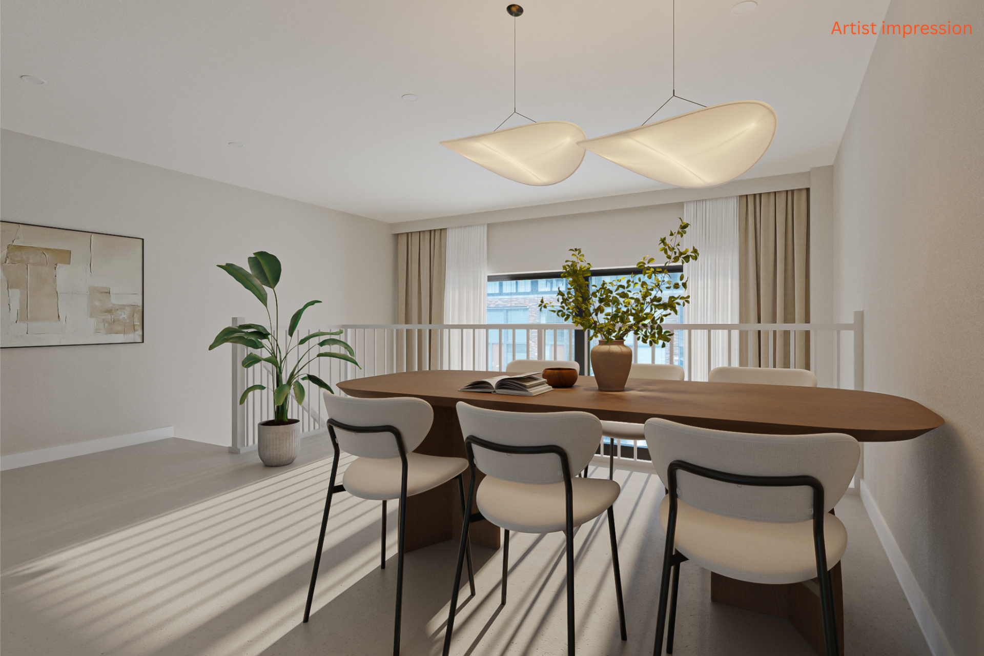 De loftwoning heeft een speelse indeling dankzij de vide en baadt door de grote raampartijen aan de voorzijde in natuurlijk daglicht. Het royale woonoppervlak geeft je alle vrijheid om naar eigen woonwens in te richten. Op de begane grond bevinden zich nu twee slaapkamers, waarvan één met een ensuite badkamer. Liever één grote open ruimte? Denk aan een ruime master bedroom, atelier, studio of multifunctionele werkruimte. Alles kan, het is maar net wat bij jouw plannen past.