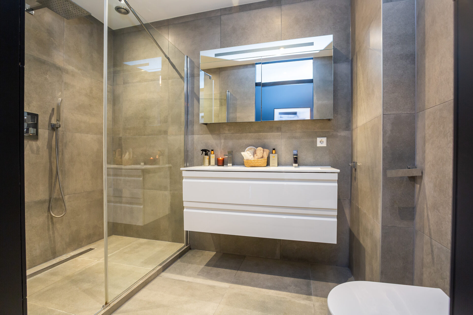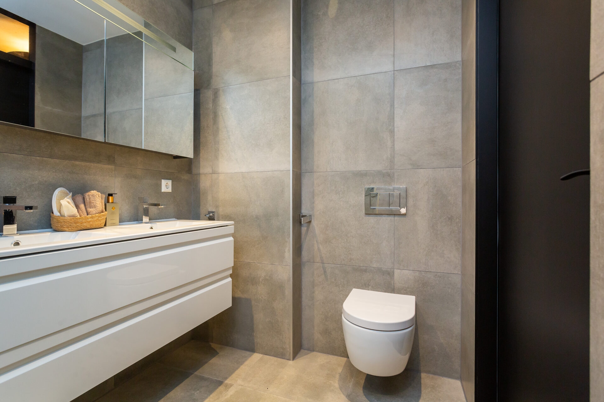 Badkamer: ± 5 m², voorzien van een inloopdouche, dubbele wastafel met meubel en toilet