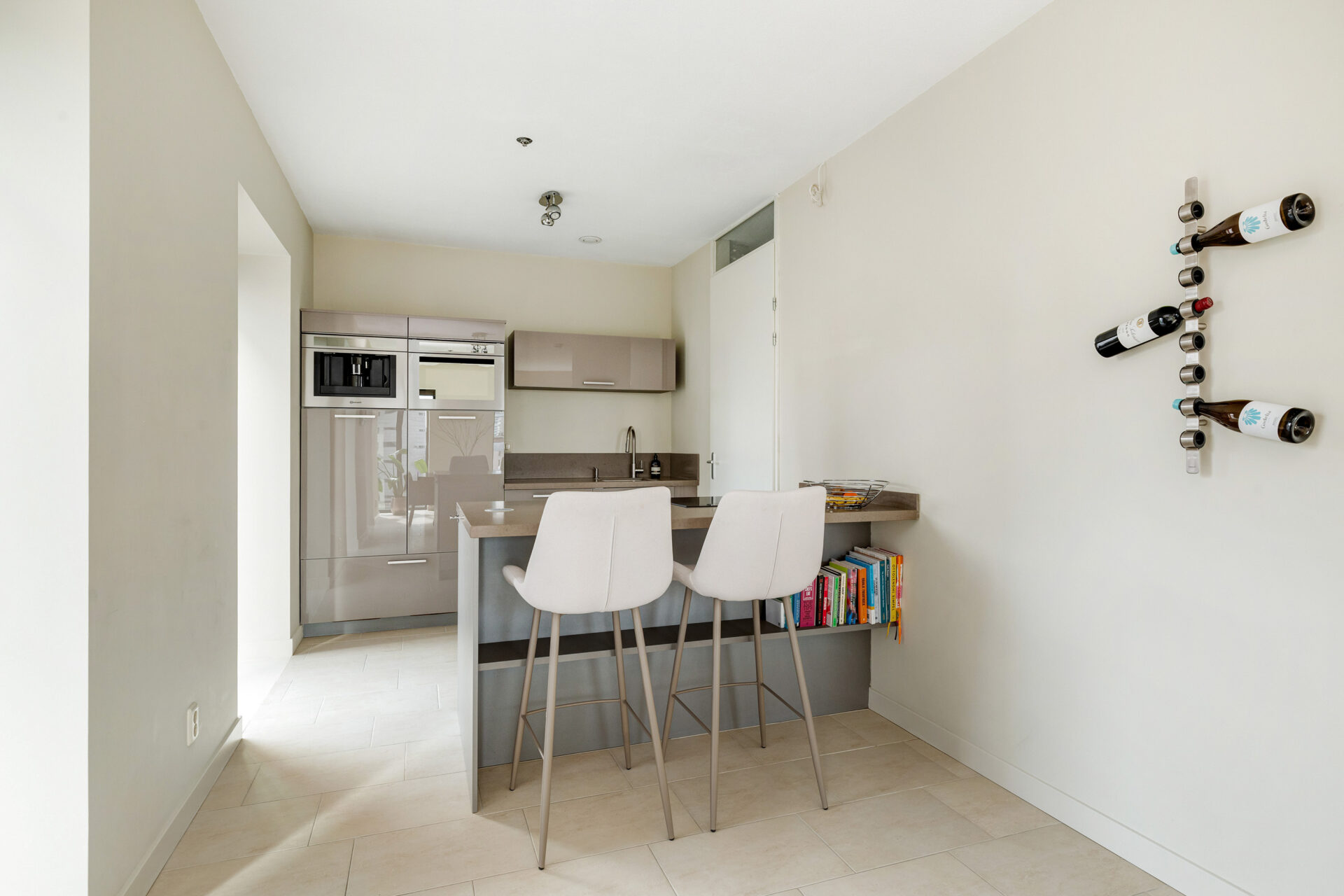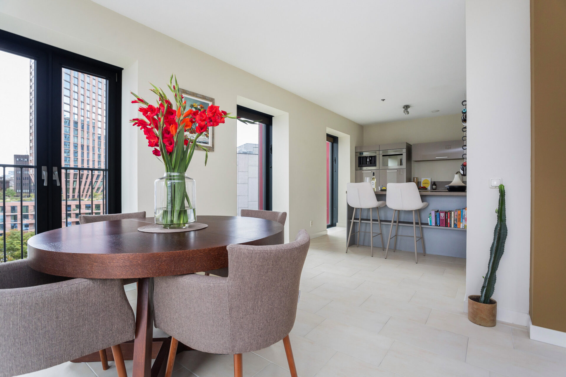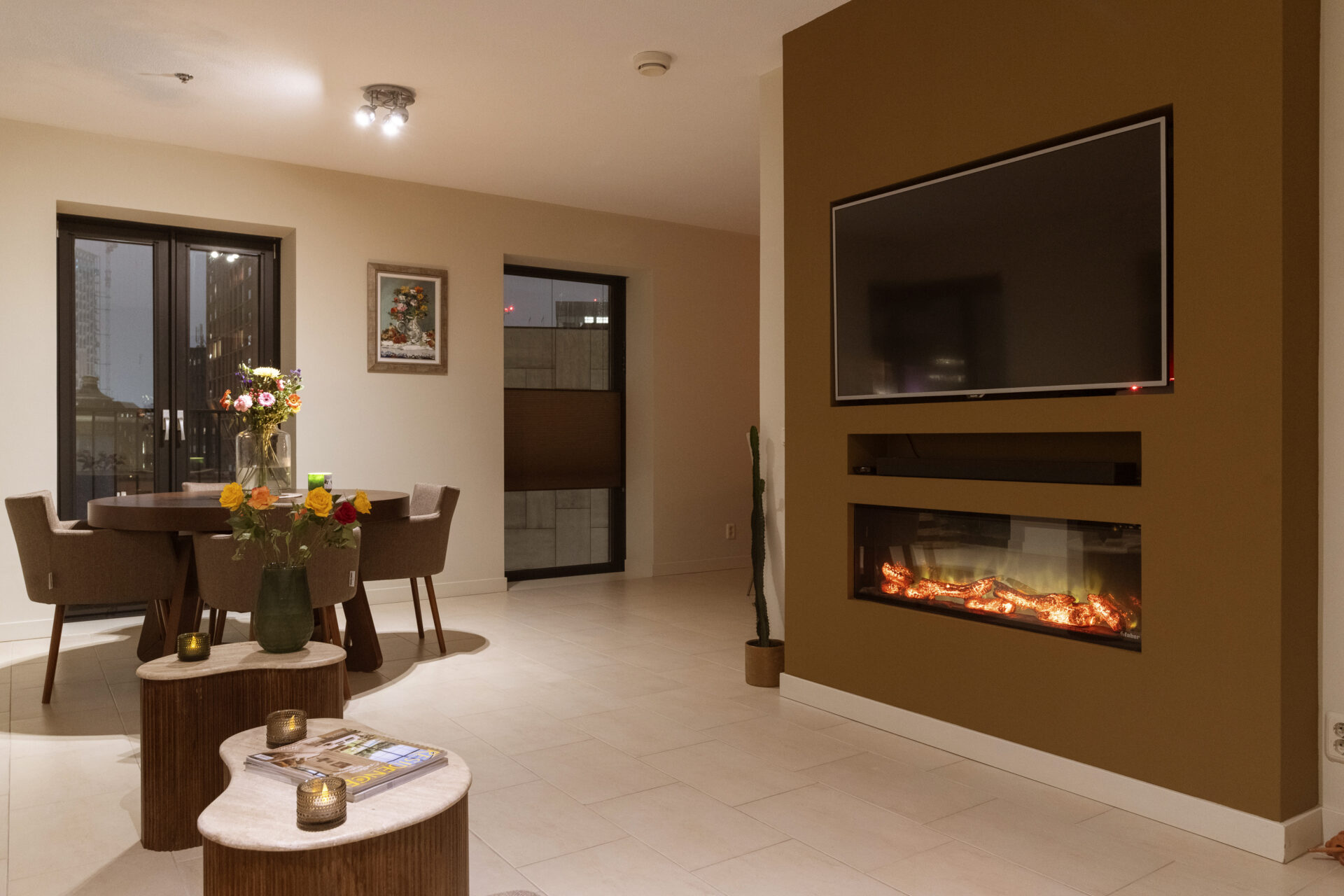 De woonkamer is sfeervol en helemaal af dankzij de cinewall met sfeerhaard. Aangrenzend ligt de halfopen keuken met bar: de plek voor kookliefhebbers en lange avonden met vrienden. Haal de stad naar binnen door de dubbele openslaande deuren van de Franse balkons open te zetten.