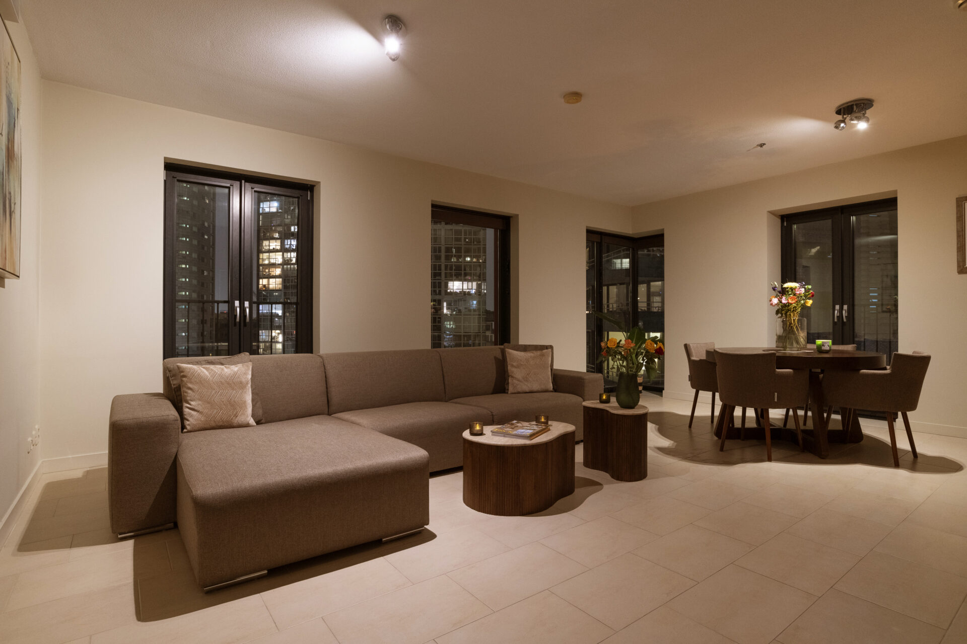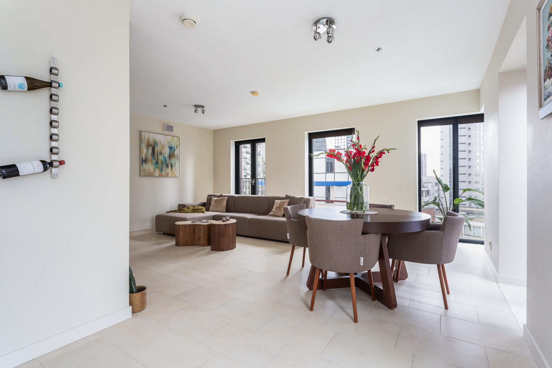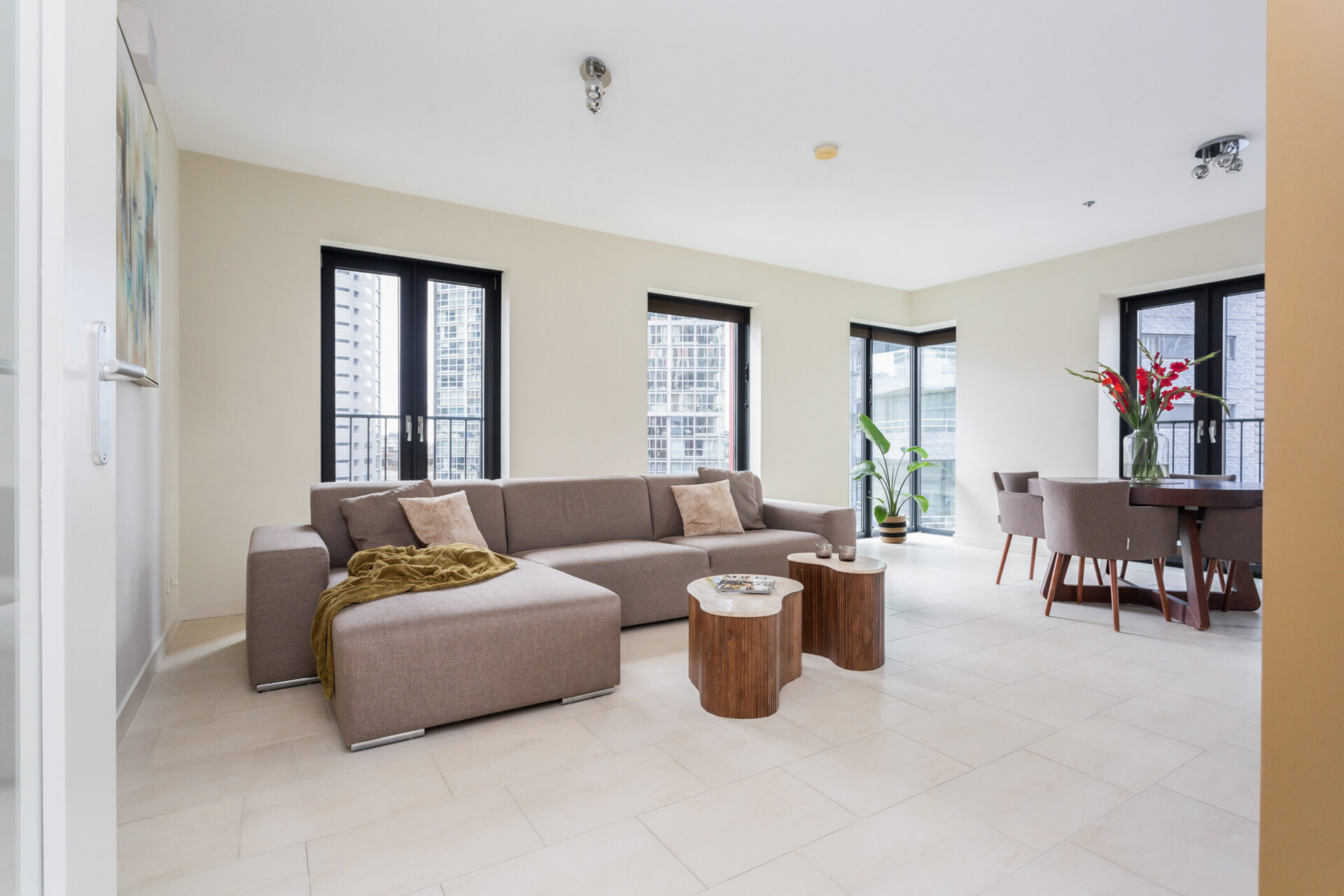 De woonkamer is sfeervol en helemaal af dankzij de cinewall met sfeerhaard. Aangrenzend ligt de halfopen keuken met bar: de plek voor kookliefhebbers en lange avonden met vrienden. Haal de stad naar binnen door de dubbele openslaande deuren van de Franse balkons open te zetten.
