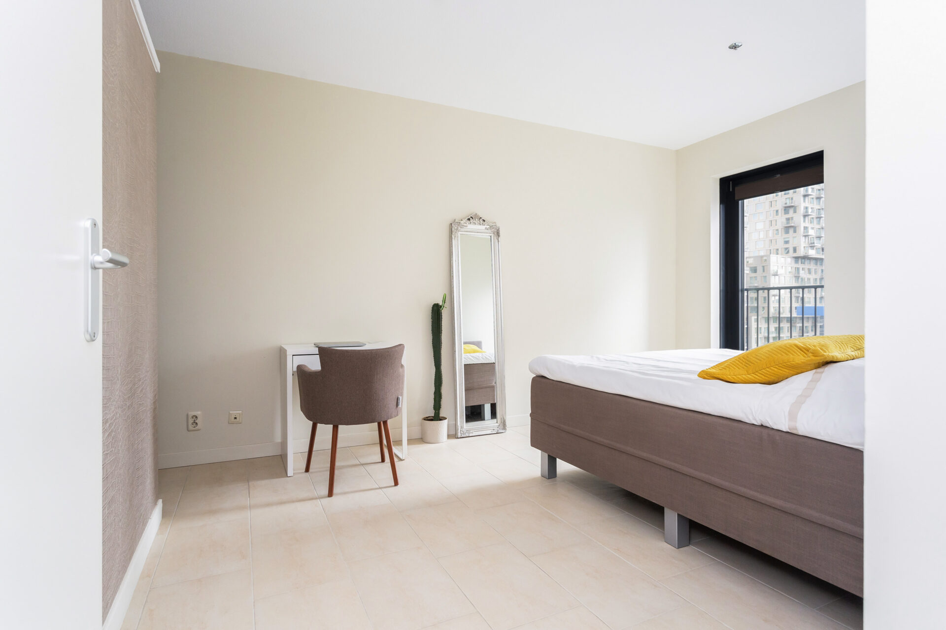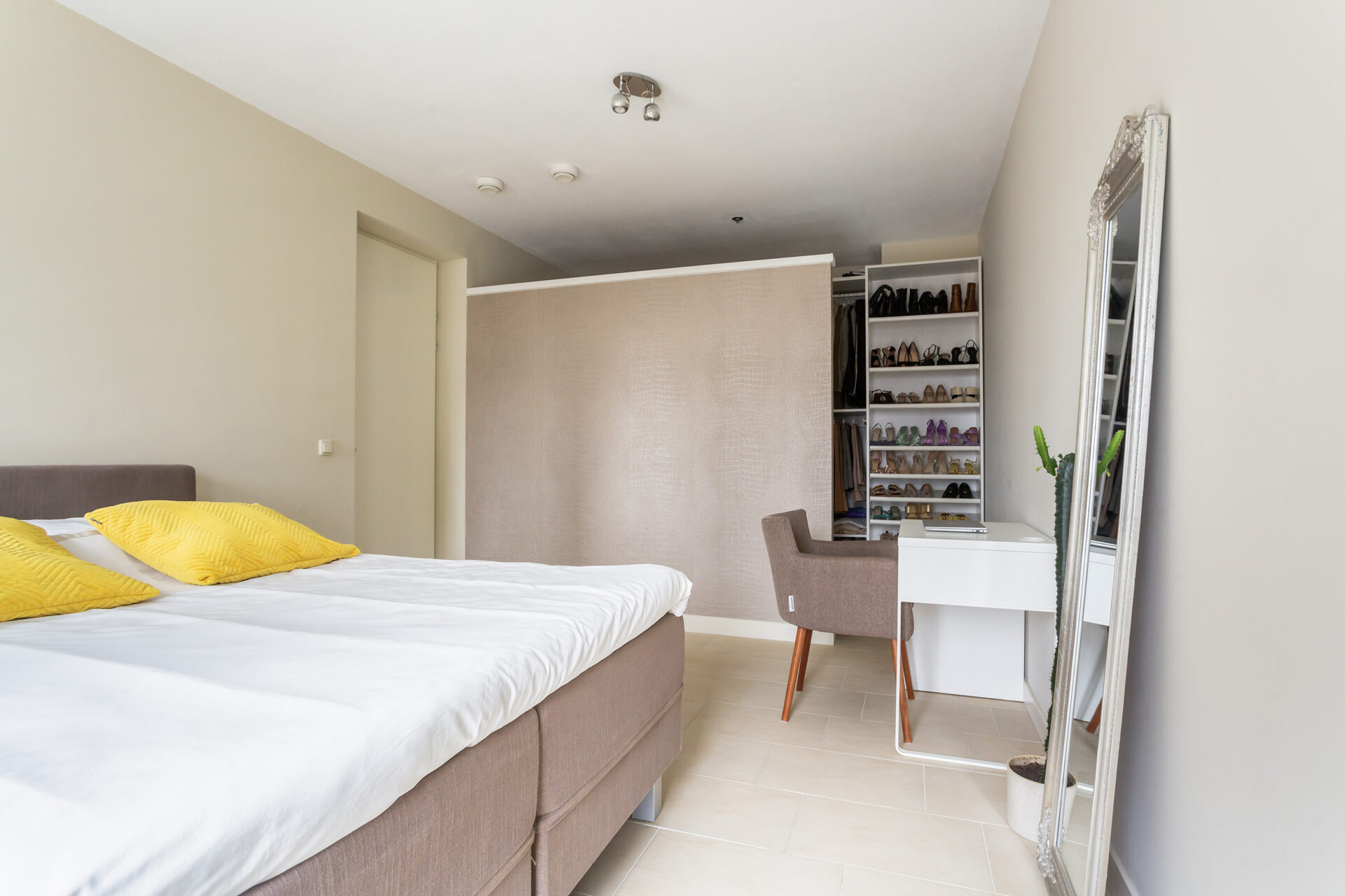 De slaapkamer is royaal van formaat en momenteel slim ingedeeld met een scheidingswand: een comfortabele slaapruimte met ruime inloopkast. De gescheiden kastruimte kan eventueel worden ingericht tot een aparte werkplek.