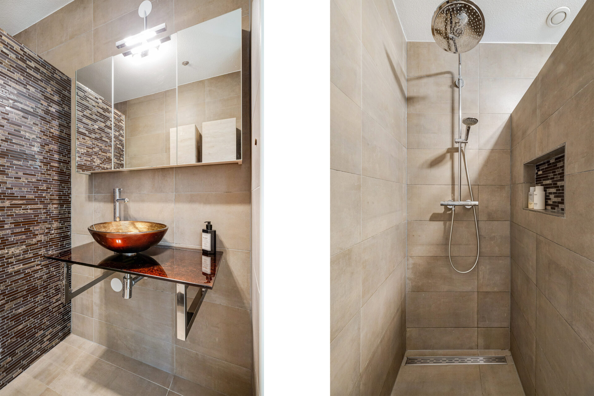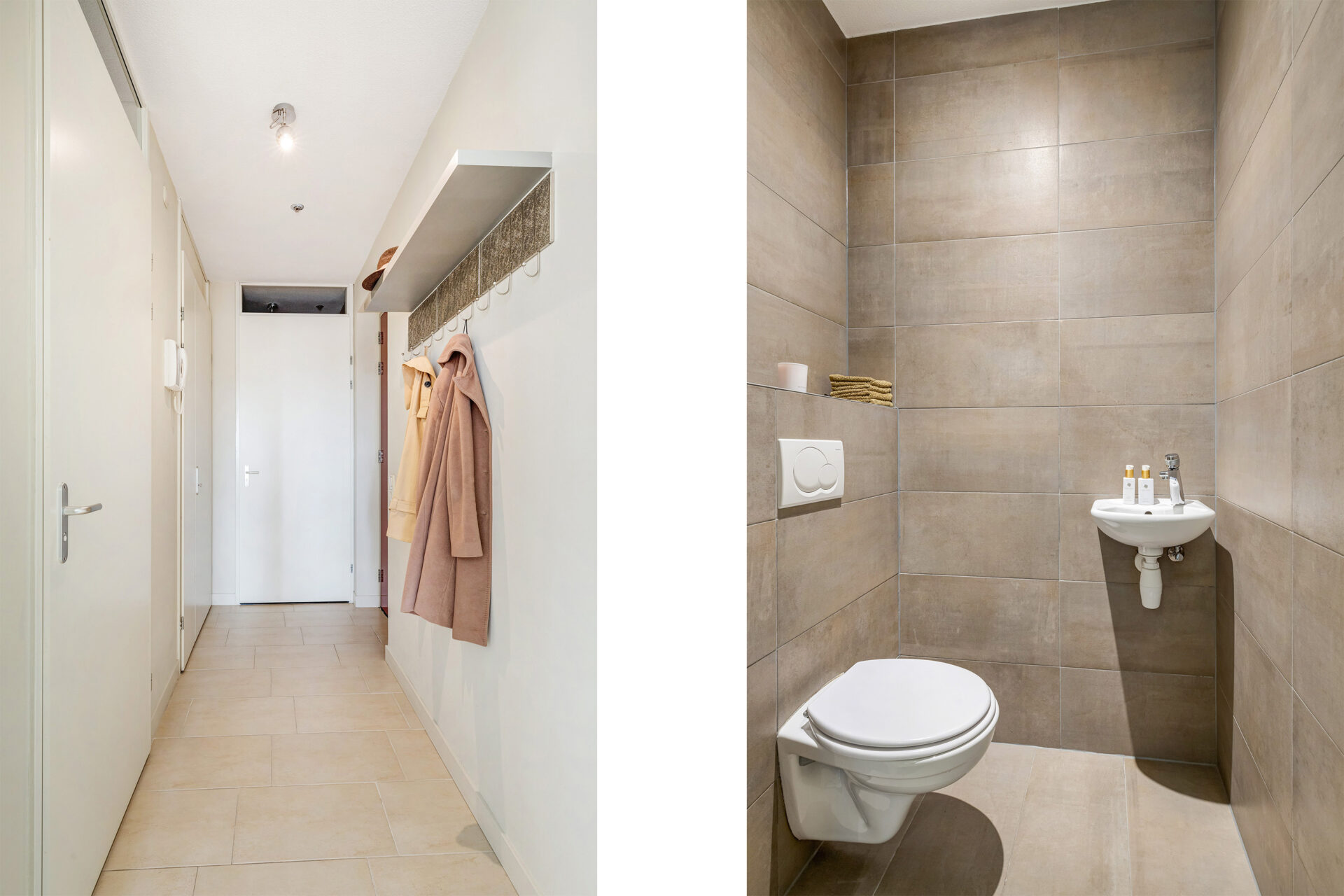 De badkamer is modern en functioneel ingericht: volledig betegeld, met een riante inloopdouche en een Murano wastafel. Tot slot is er nog een handige inpandige berging, zodat je nooit ruimte tekortkomt.