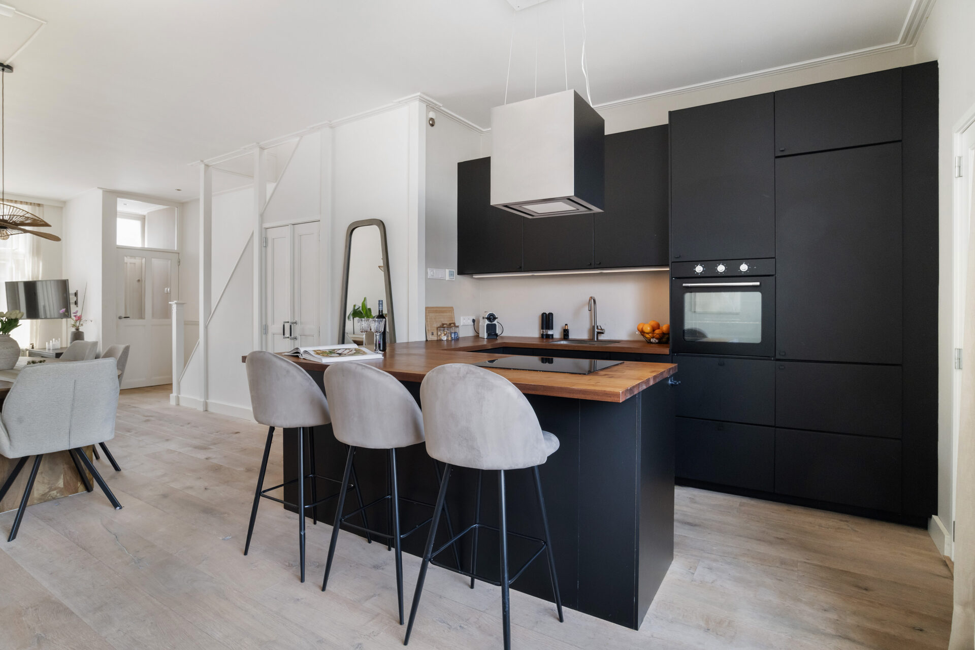 Keuken voorzien van een houten werkblad en diverse inbouwapparatuur t.w.: een 4-pits inductiekookplaat, afzuigkap, koel-vriescombinatie, vaatwasser, oven en combi magnetron