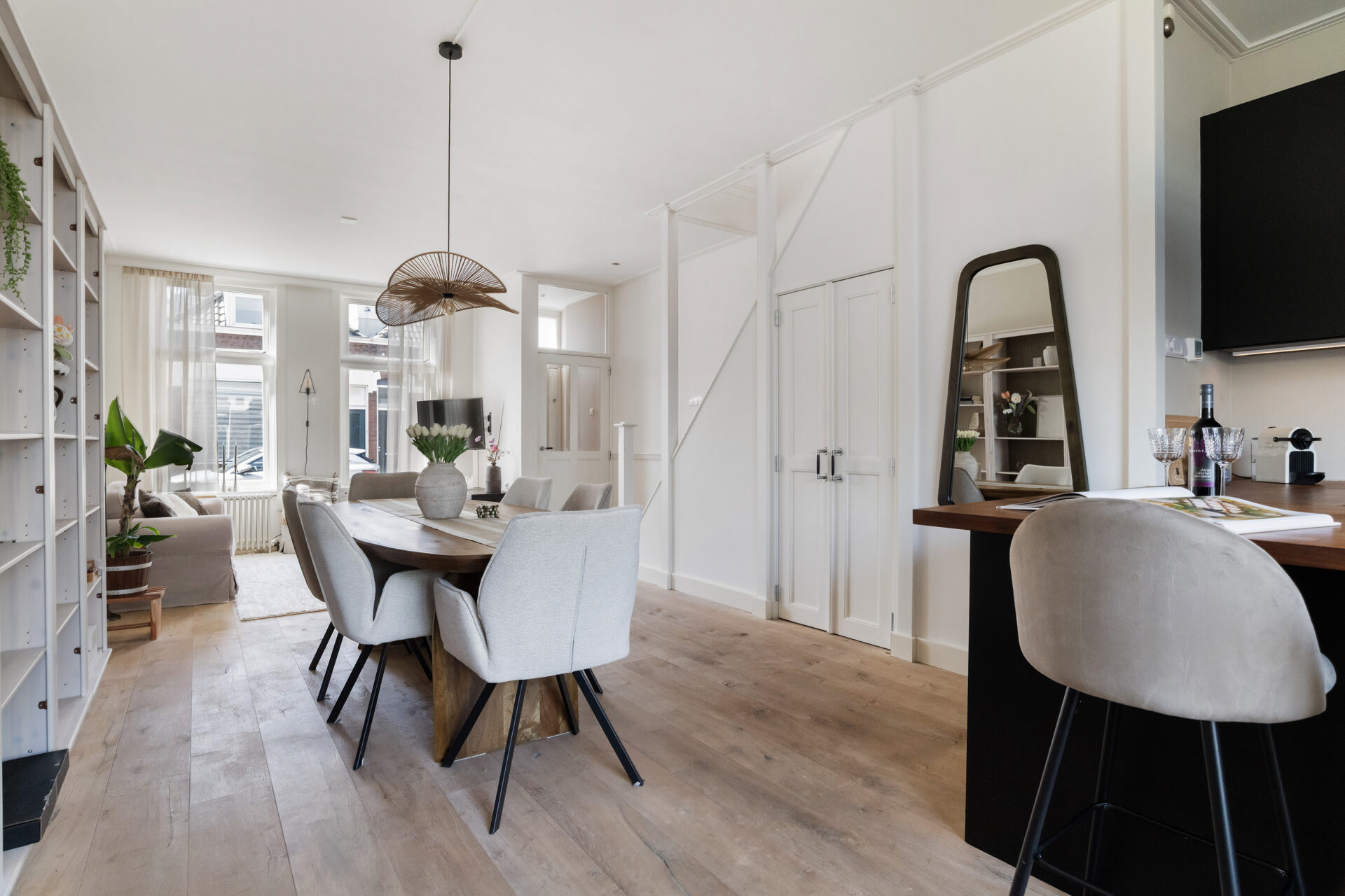 De woning is met liefde en aandacht gerenoveerd en onderhouden, zowel van binnen als van buiten. Bij binnenkomst in de woonkamer word je direct verrast door de sfeervolle, royale ruimte met een plafondhoogte van bijna 3 meter, wat zorgt voor een heerlijk ruimtelijk gevoel. De houten vloer en hoge plinten vormen samen met de strakke wanden een mooi geheel. De matzwarte U-keuken met houten werkblad is een echte eyecatcher en volledig uitgerust voor iedere kookliefhebber. Vanuit de hal met toiletruimte loop je zo de tuin in, gelegen op het noordoosten, een fijne plek om buiten te genieten.