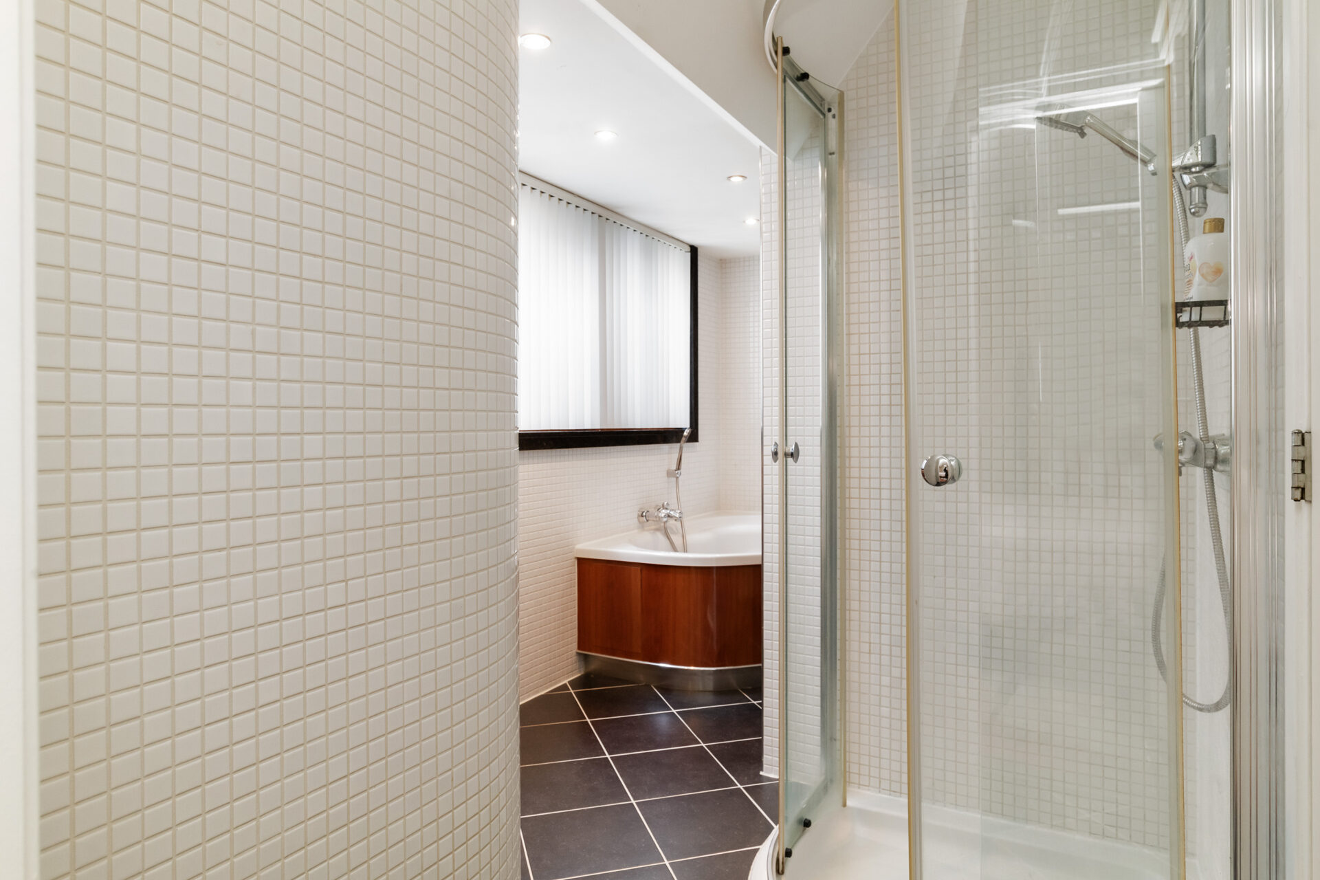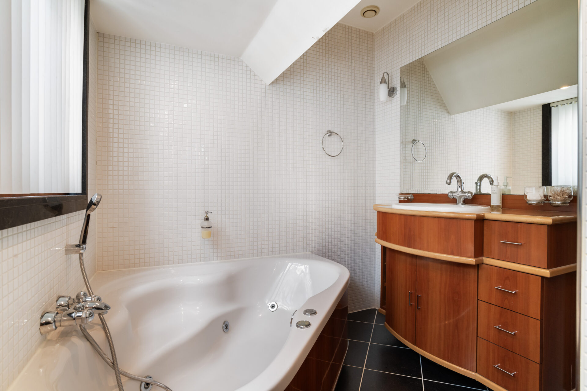 Badkamer: ± 8 m² voorzien van een ligbad met douchefunctie en Whirlpool, douchecabine, enkele wastafel met meubel, designradiator en toilet